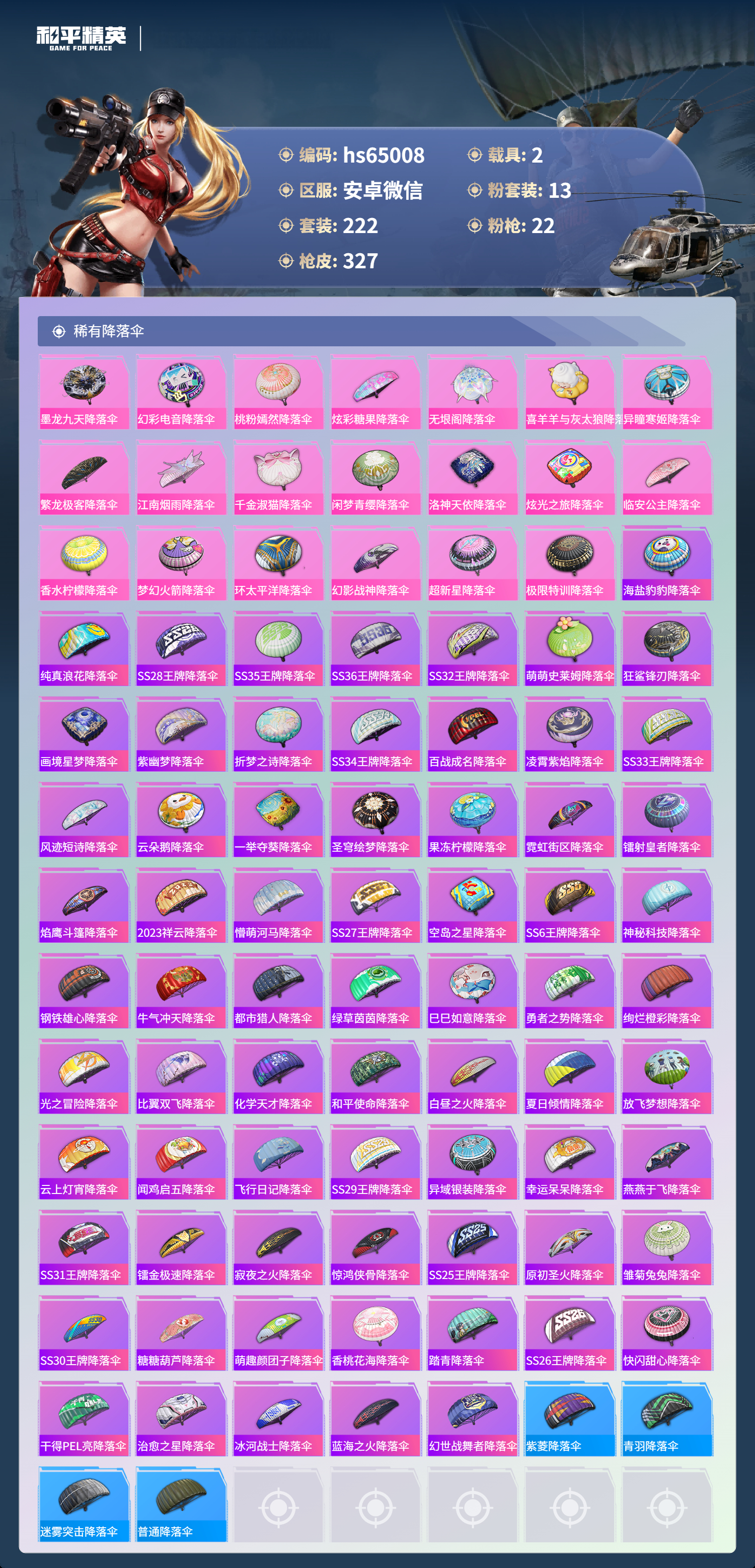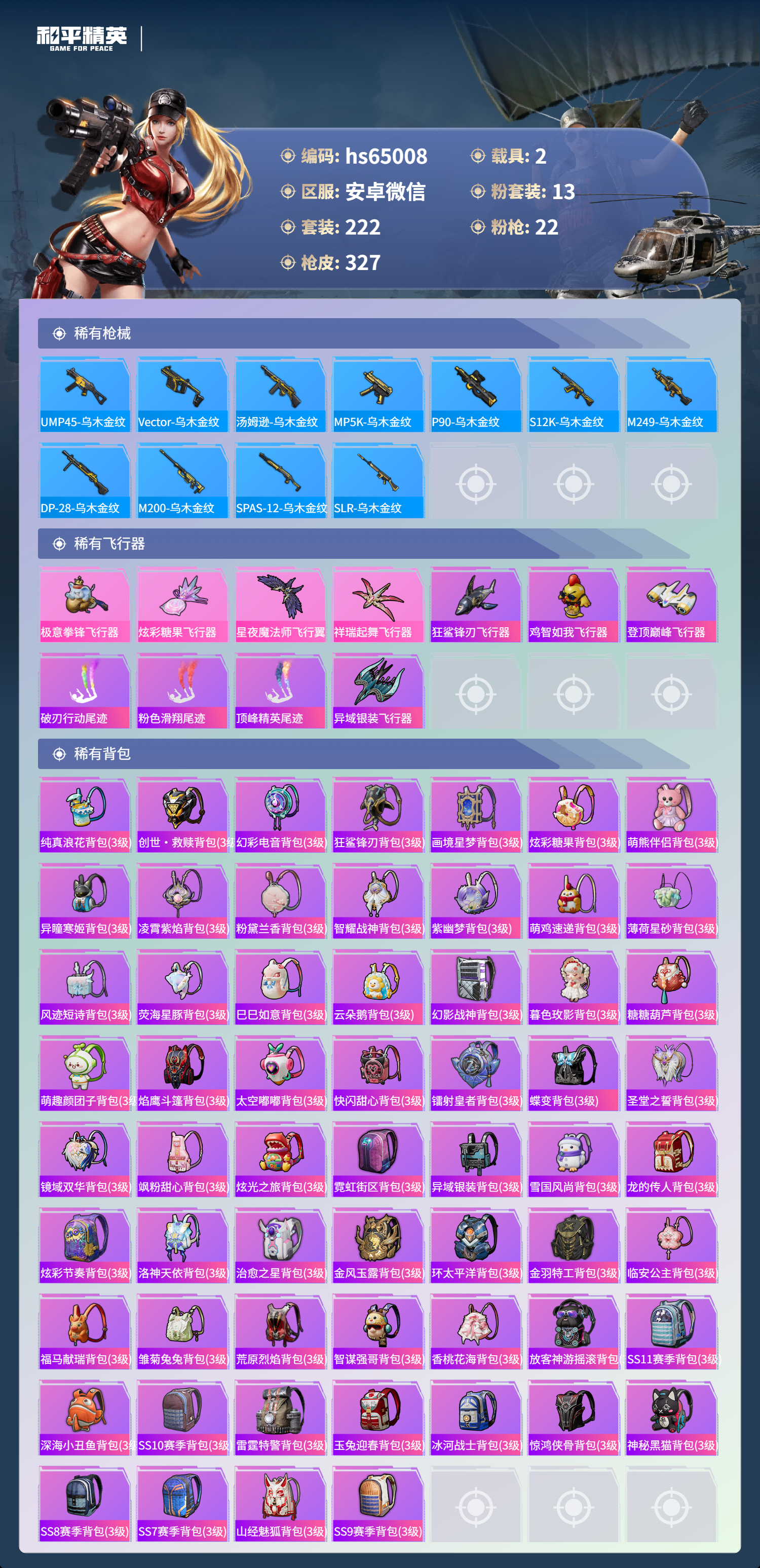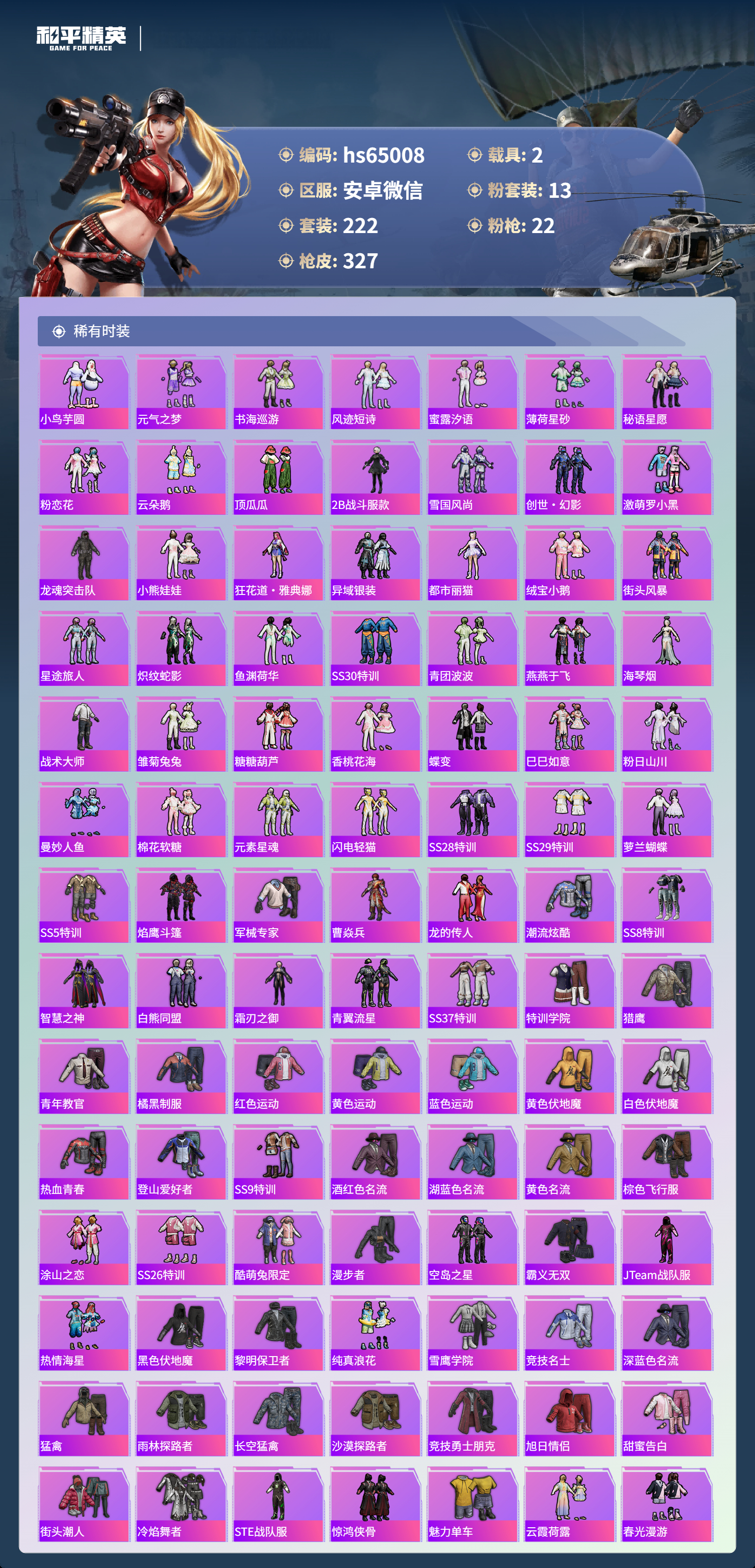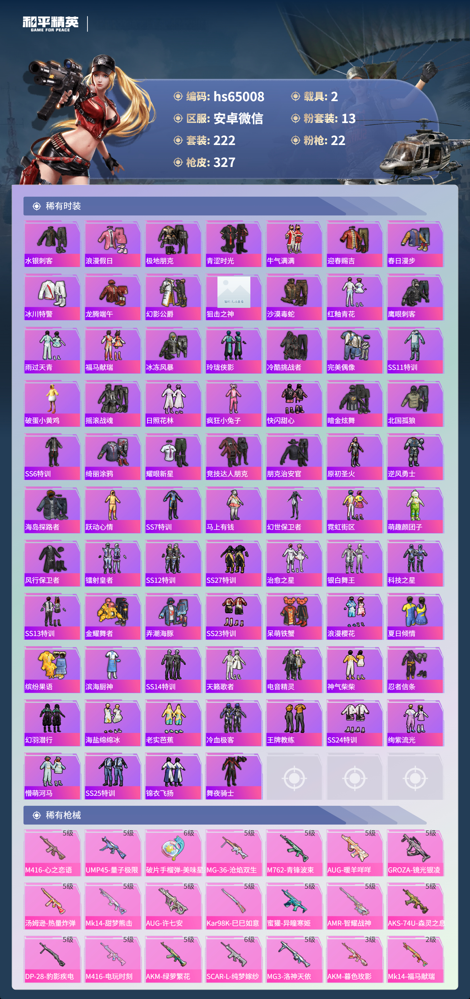 hs65008 安卓微信-14王牌印记-1红装-13粉装-22特效枪-2载具-热力值-222套装-327枪皮-2卓越印记-1传奇印记