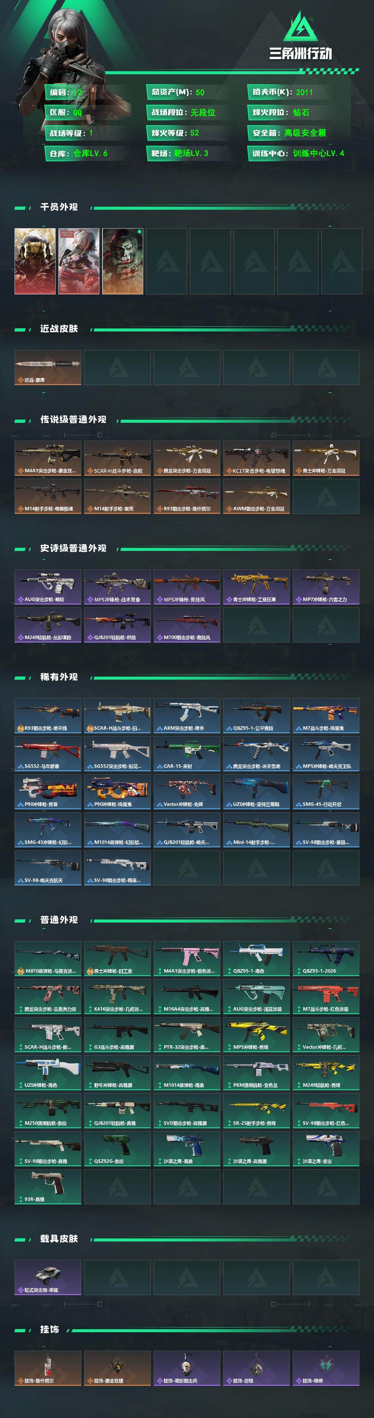 50m总资产-2011k哈伏币-52烽火等级-钻石-1战场等级-无军衔【干员外观】:红狼-蚀金玫瑰,骇爪-维什戴尔,红狼-电锯惊魂【近战皮肤】:近战-黑鹰【传说外观】:M4A1突击步枪-蚀金玫瑰,SCAR-H战斗步枪-启航,腾龙突击步枪-万金泪冠,KC17突击步枪-电锯惊魂,勇士冲锋枪-万金泪冠,M14射手步枪-电锯惊魂,M14射手步枪-蛮荒,R93狙击步枪-维什戴尔,AWM狙击步枪-万金泪冠【史诗外观】:AUG突击步枪-蝮蛇,MP5冲锋枪-战术竞备,MP5冲锋枪-竞技风,勇士冲锋枪-工业狂潮,