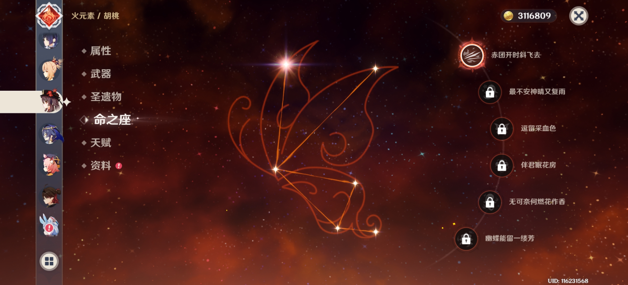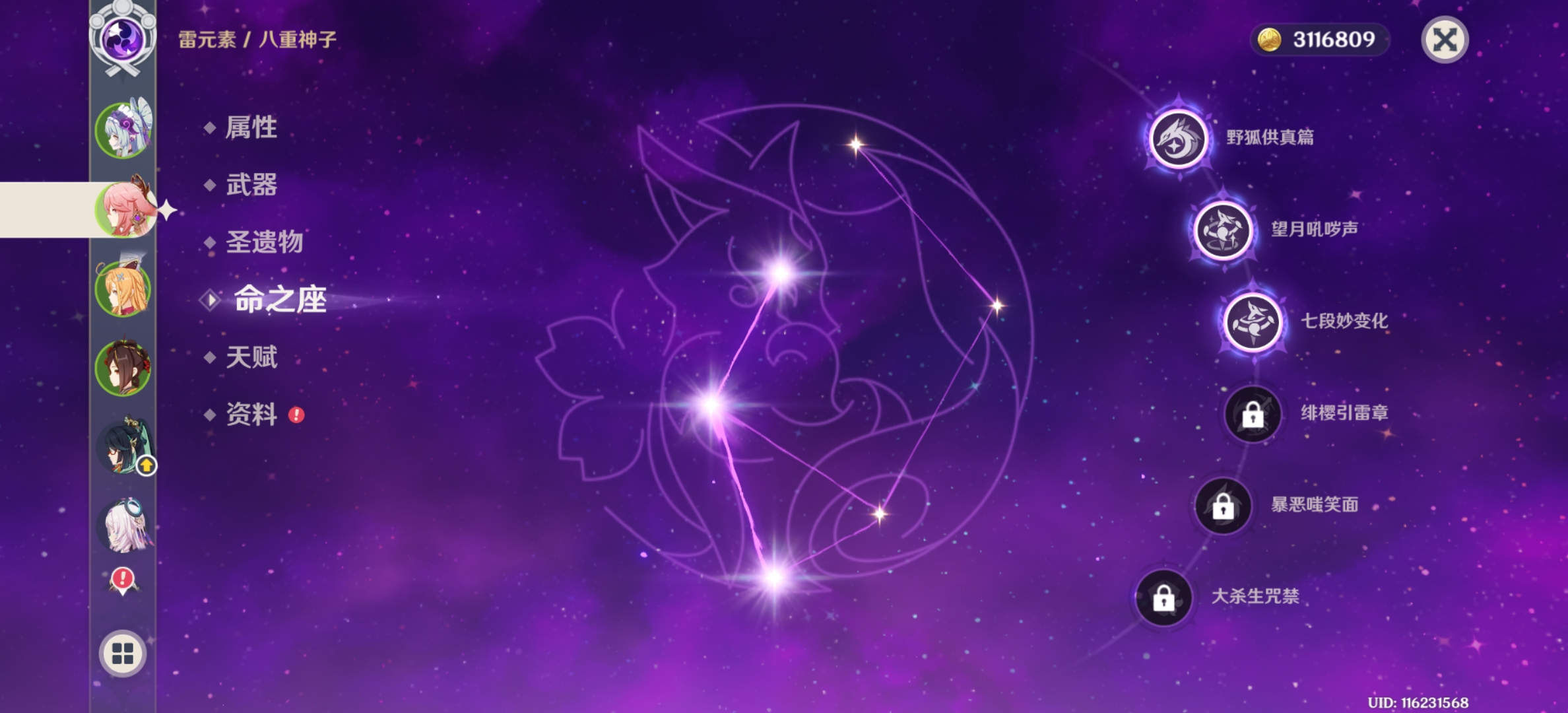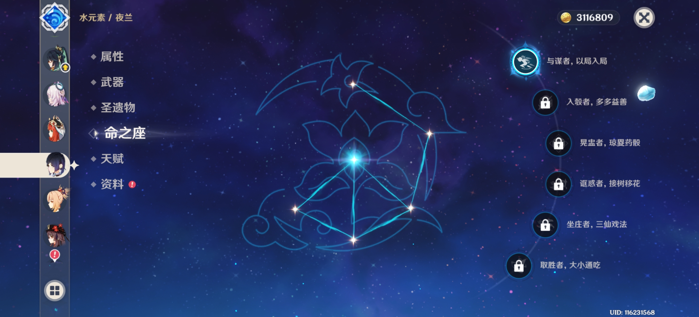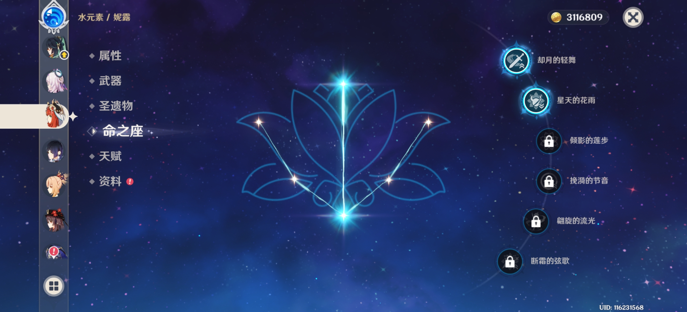 三命神子,一命胡桃加专武,一命夜兰加专武,两命妮露。