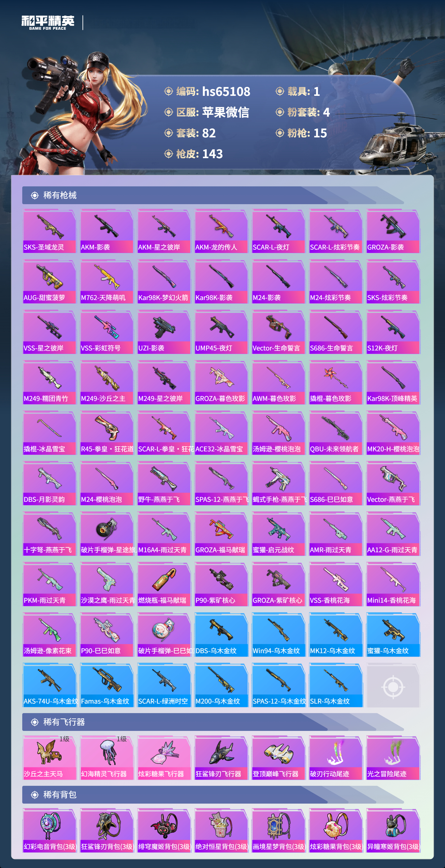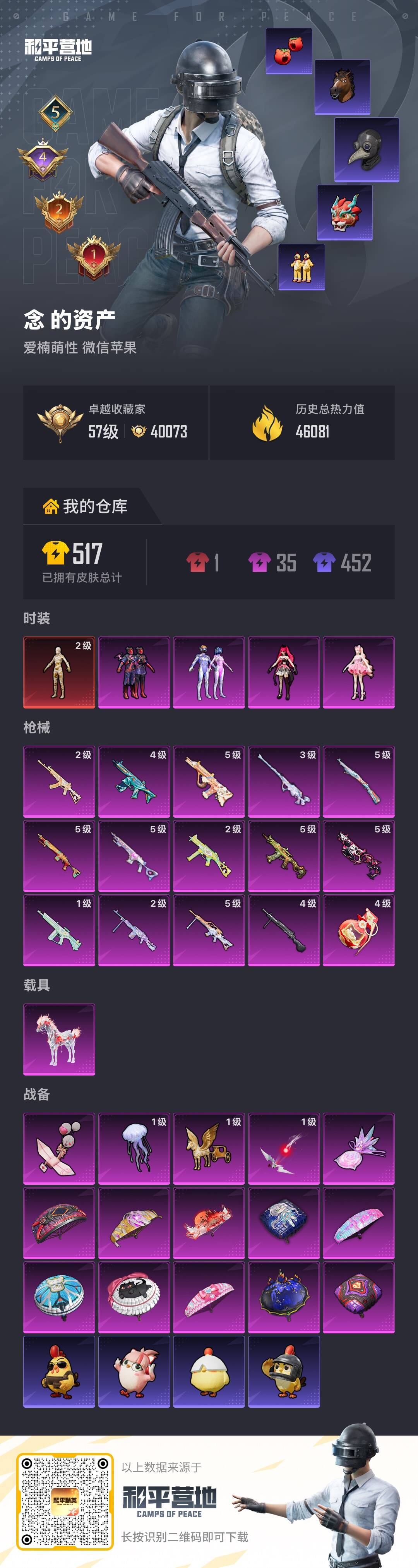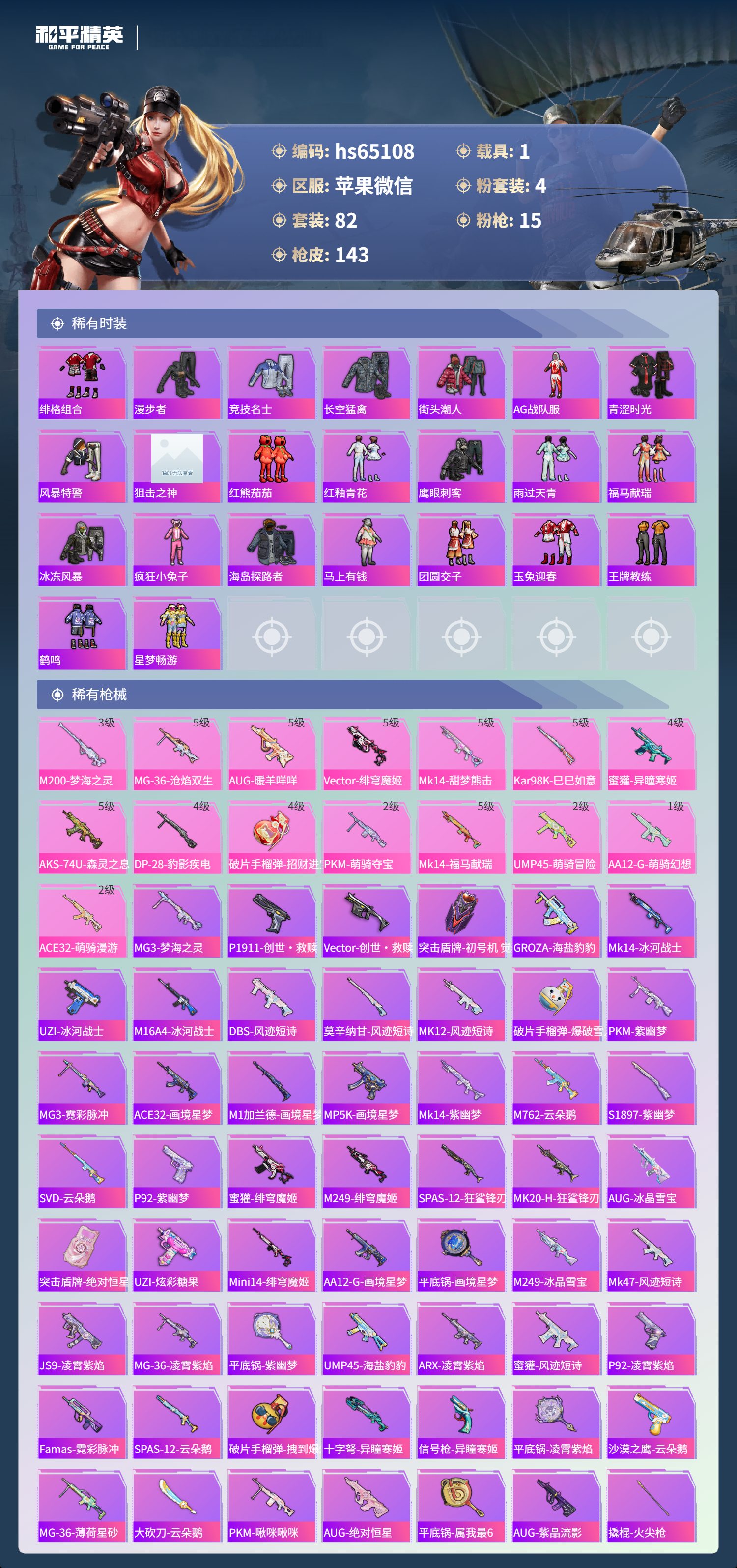 hs65108 苹果微信-5王牌印记-有战神框-1红装-4粉装-15特效枪-1载具-46081热力值-82套装-143枪皮-4卓越印记-2传奇印记