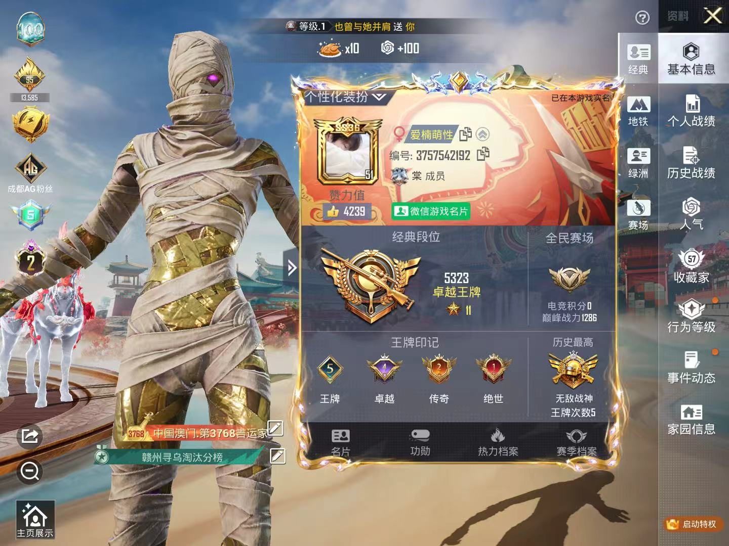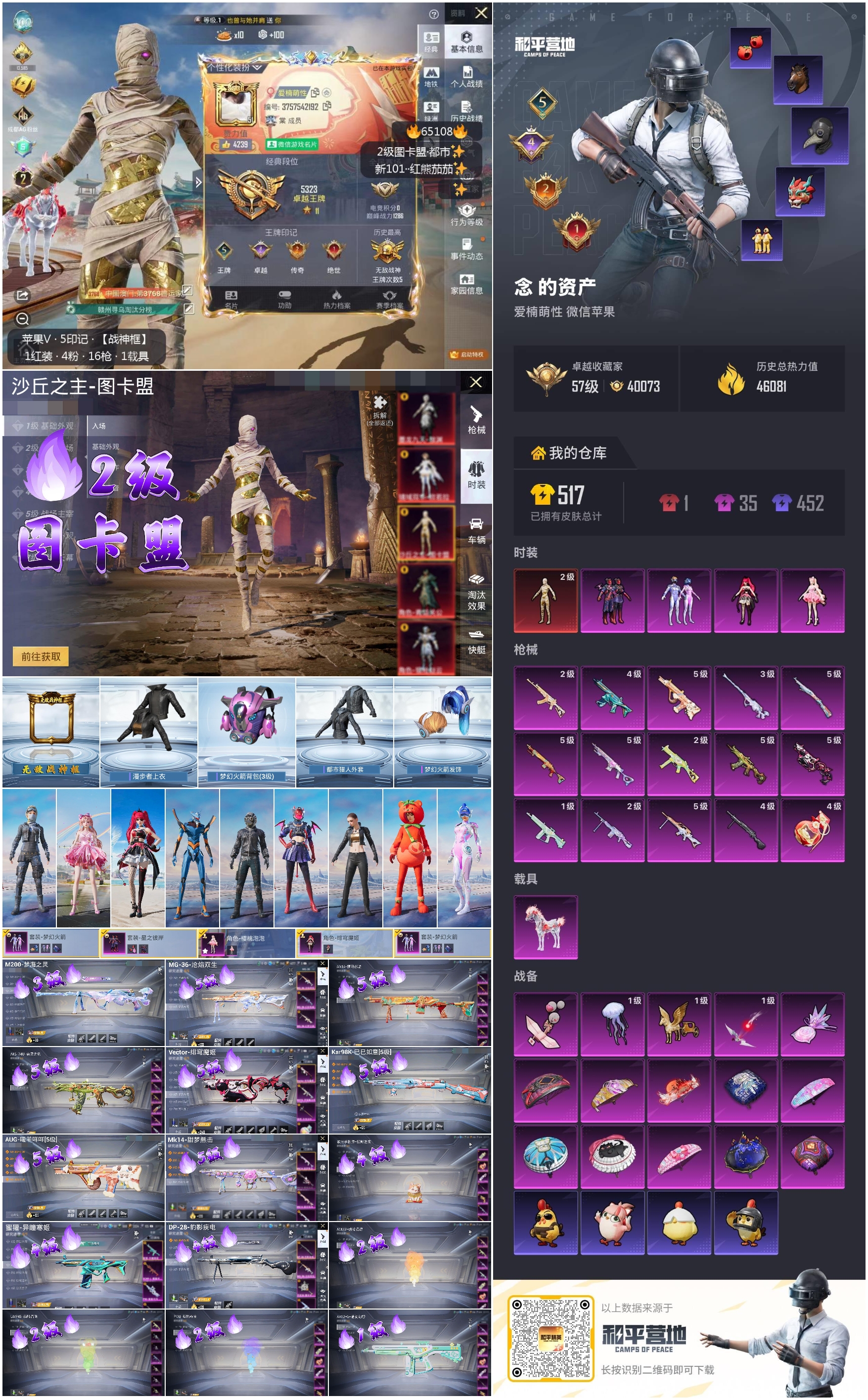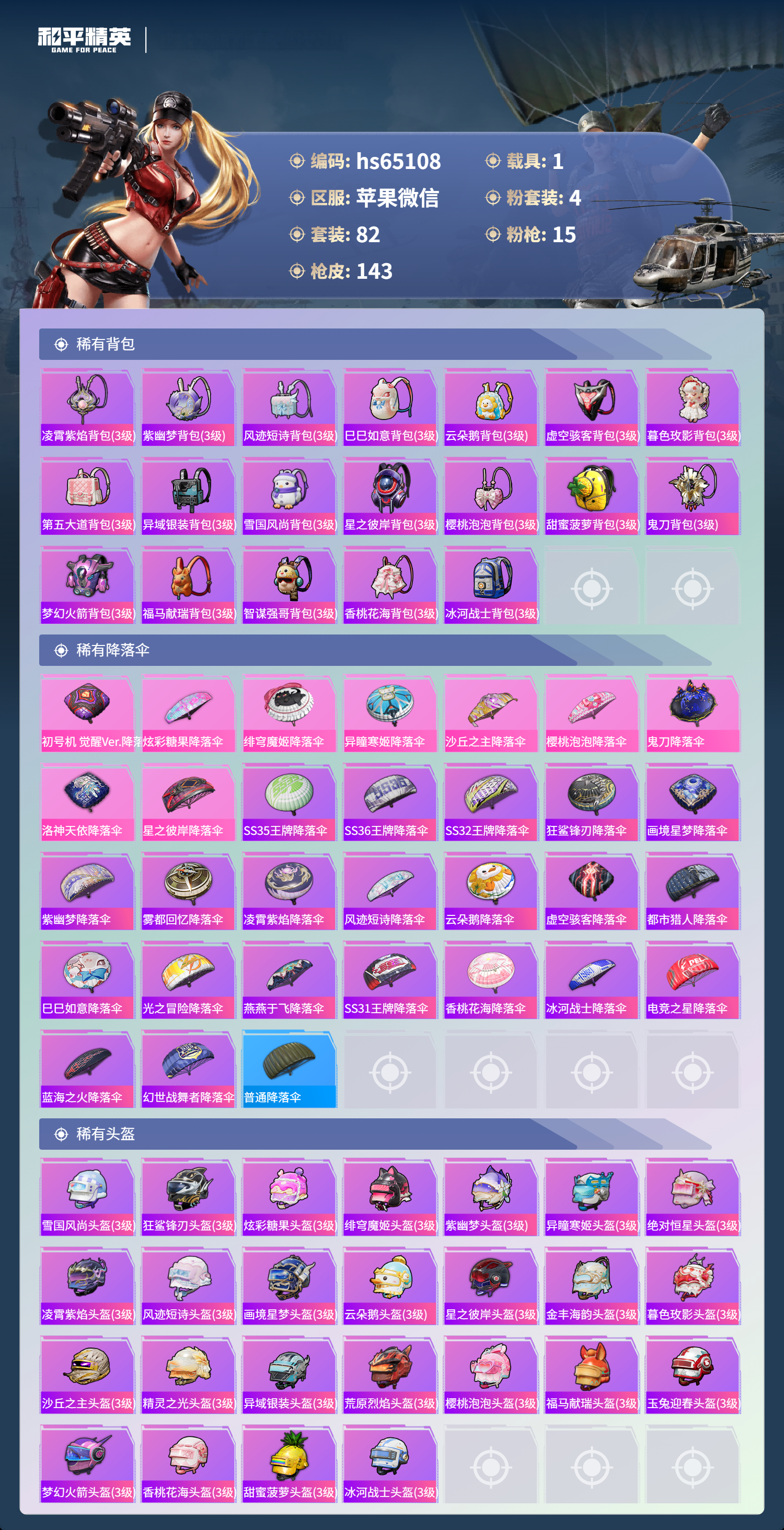 hs65108 苹果微信-5王牌印记-有战神框-1红装-4粉装-15特效枪-1载具-46081热力值-82套装-143枪皮-4卓越印记-2传奇印记