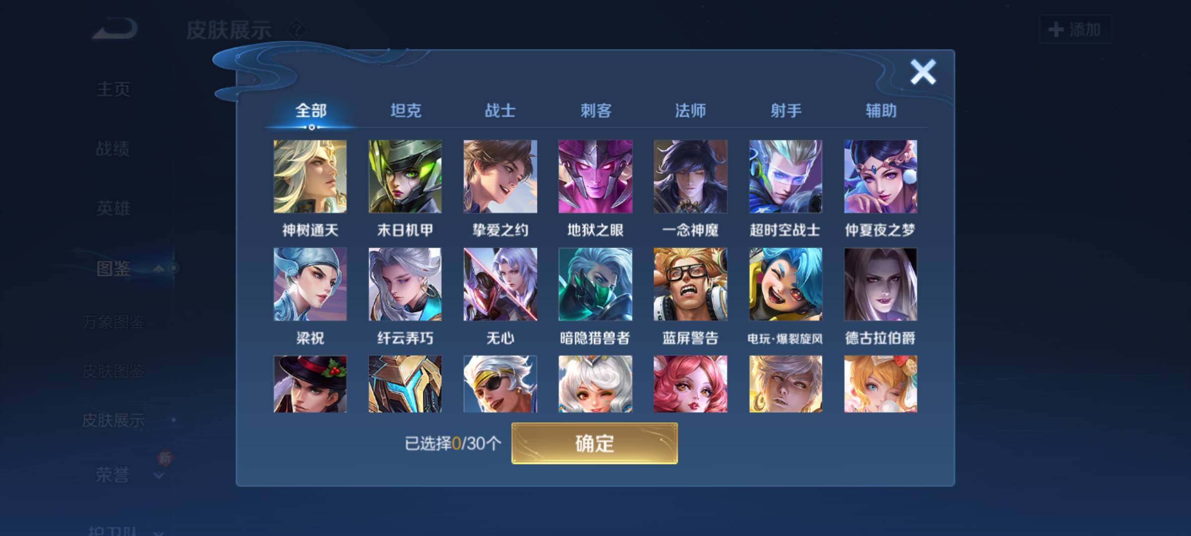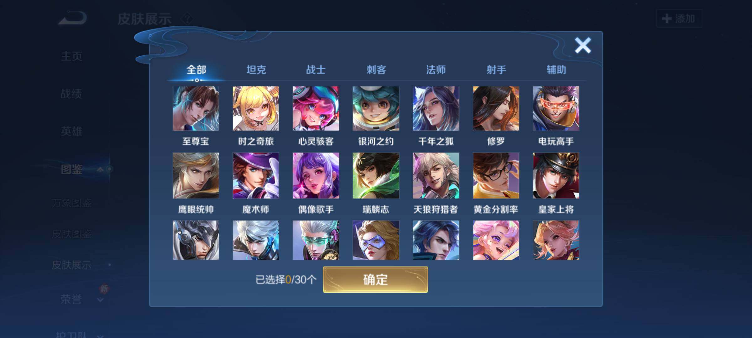 【限定皮肤】:白起狰,狄仁杰阴阳师,虞姬凯尔特女王,赵云皇家上将,赵云龙胆,妲己热情桑巴,嬴政白昼王子,庄周蜃楼王,阿轲迷踪丽影,钟无艳超时空战士,