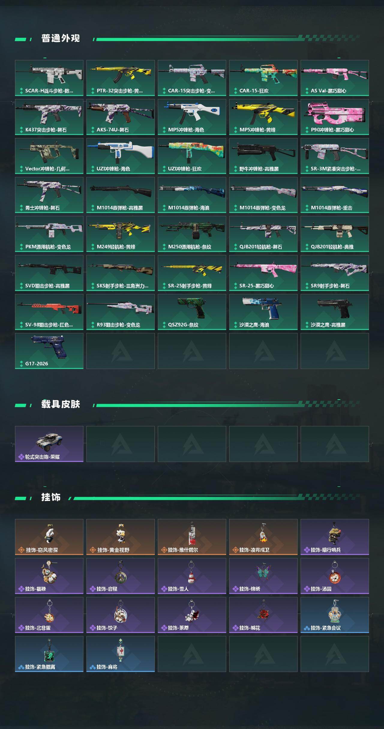 200m总资产-71583k哈伏币-60烽火等级-钻石-13战场等级-列兵【干员外观】:骇爪-维什戴尔,威龙-凌霄戍卫,红狼-电锯惊魂,露娜-金牌射手【近战皮肤】:近战-黑鹰【传说外观】:AKM突击步枪-锦绣,QBZ95-1突击步枪-凌霄戍卫,SG552突击步枪-运动员,SCAR-H战斗步枪-启航,SCAR-H战斗步枪-荼蘼,K437突击步枪-锦绣,KC17突击步枪-电锯惊魂,SMG-45冲锋枪-锦绣,SR-3M紧凑突击步枪-荼蘼,PKM通用机枪-荼蘼,M14射手步枪-缄花,SR-25射手步枪-