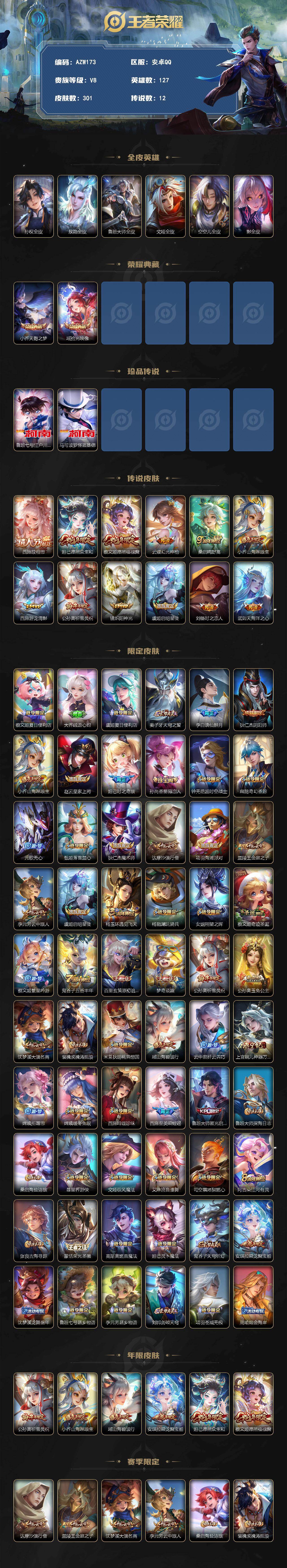 【AZW173】安卓Q-V8-最强王者段位-127英雄-301皮肤-2典藏皮肤-2珍品传说-12传说-86史诗