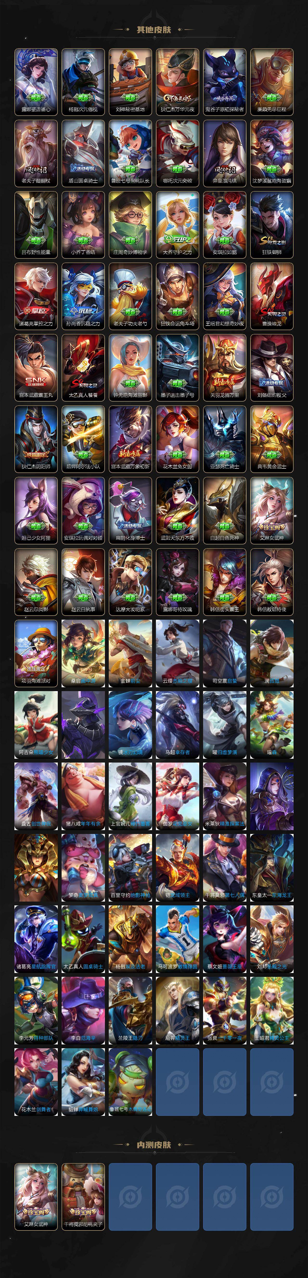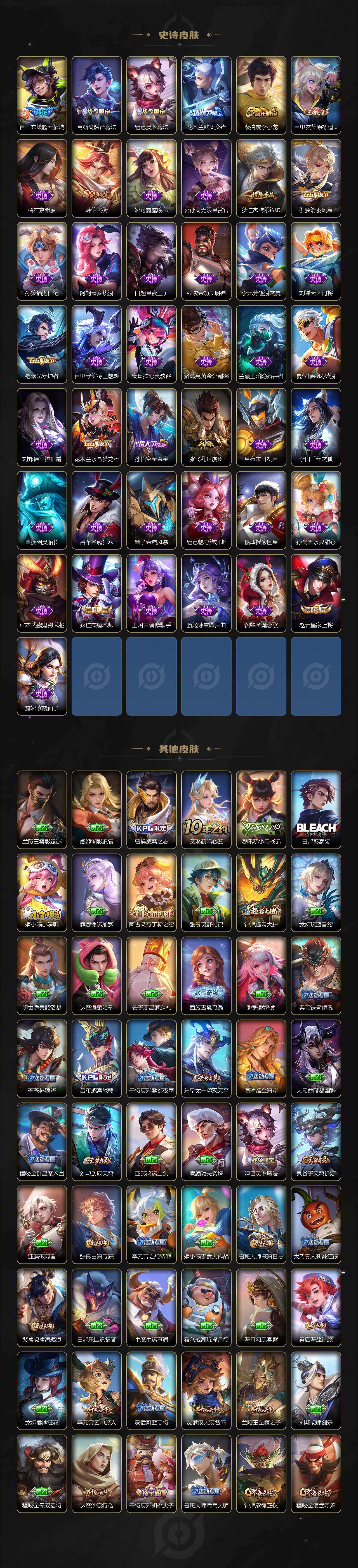 【传说皮肤】:澜愿照九州拓,桑启鸣野蒿,李信山海炽霜斩,诸葛亮时雨天司,镜炽阳神光,干将莫邪久胜战神,梦奇胖达荣荣,宫本武藏地狱之眼