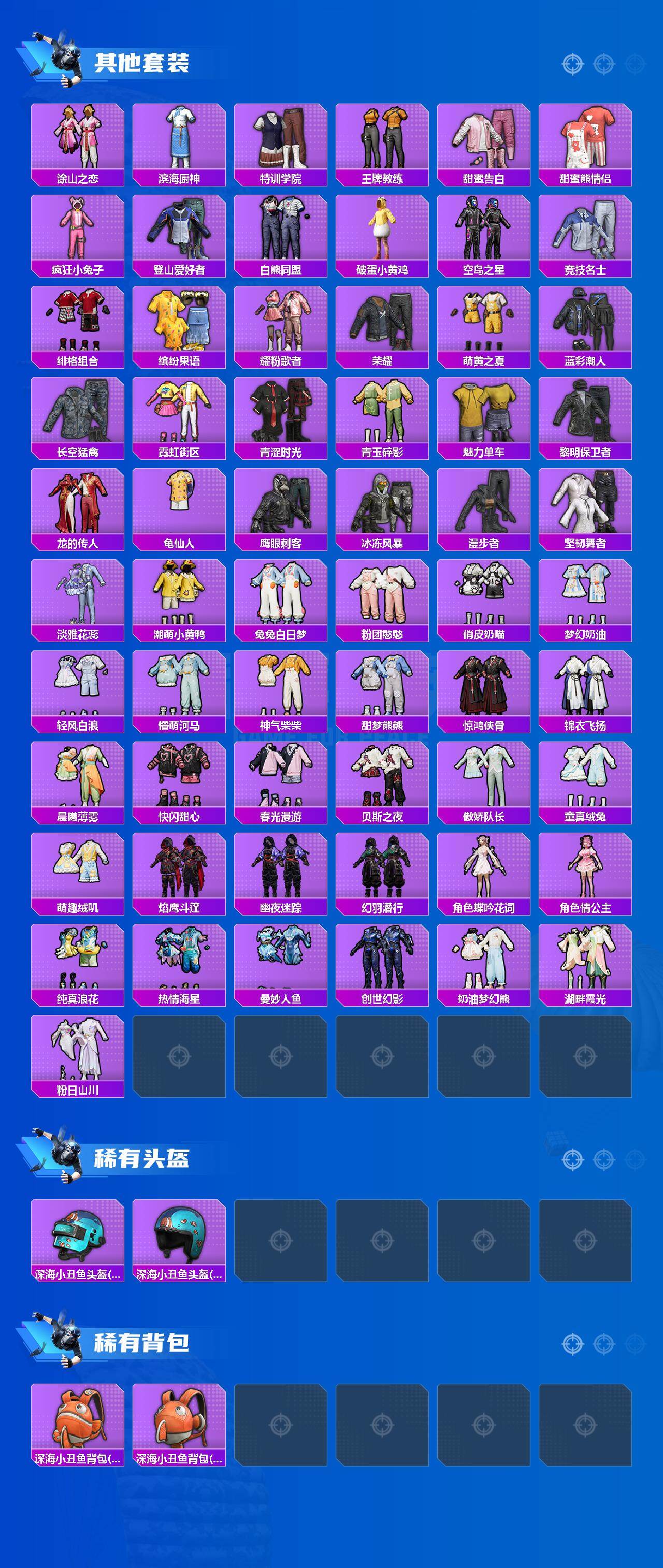 【粉色套装】:粉装-缤纷油彩,粉装-放客神游,粉装-星空之魅,粉装-彩虹鹿灵,粉装-岚岚物语,粉装-霁雪冰心,粉装-彩虹甜喵,粉装-冰川粉黛,粉装-冰川幽秘,粉装-冰川红玫,粉装-寒光使者,粉装-第五大道,粉装-纯珍童话,角色-呆萌星弥,粉装-蜜语绒猫,角色-小蓝,套装-创世·救赎