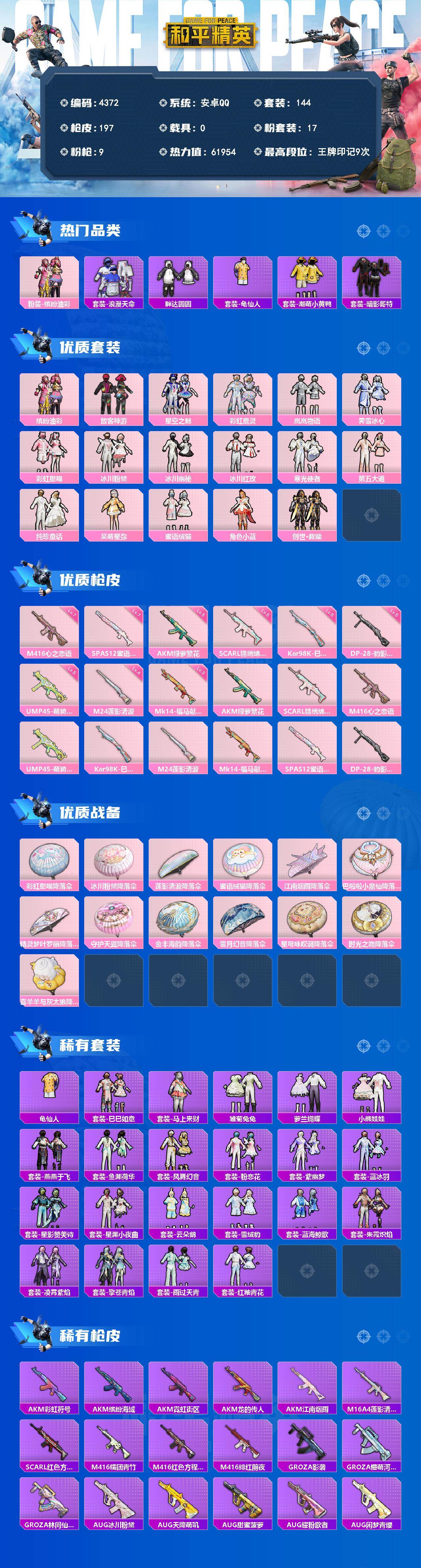安卓 手Q-17粉装-9特效枪-0载具-0粉色飞行器-61954热力值-9王牌印记-144套装-197枪皮