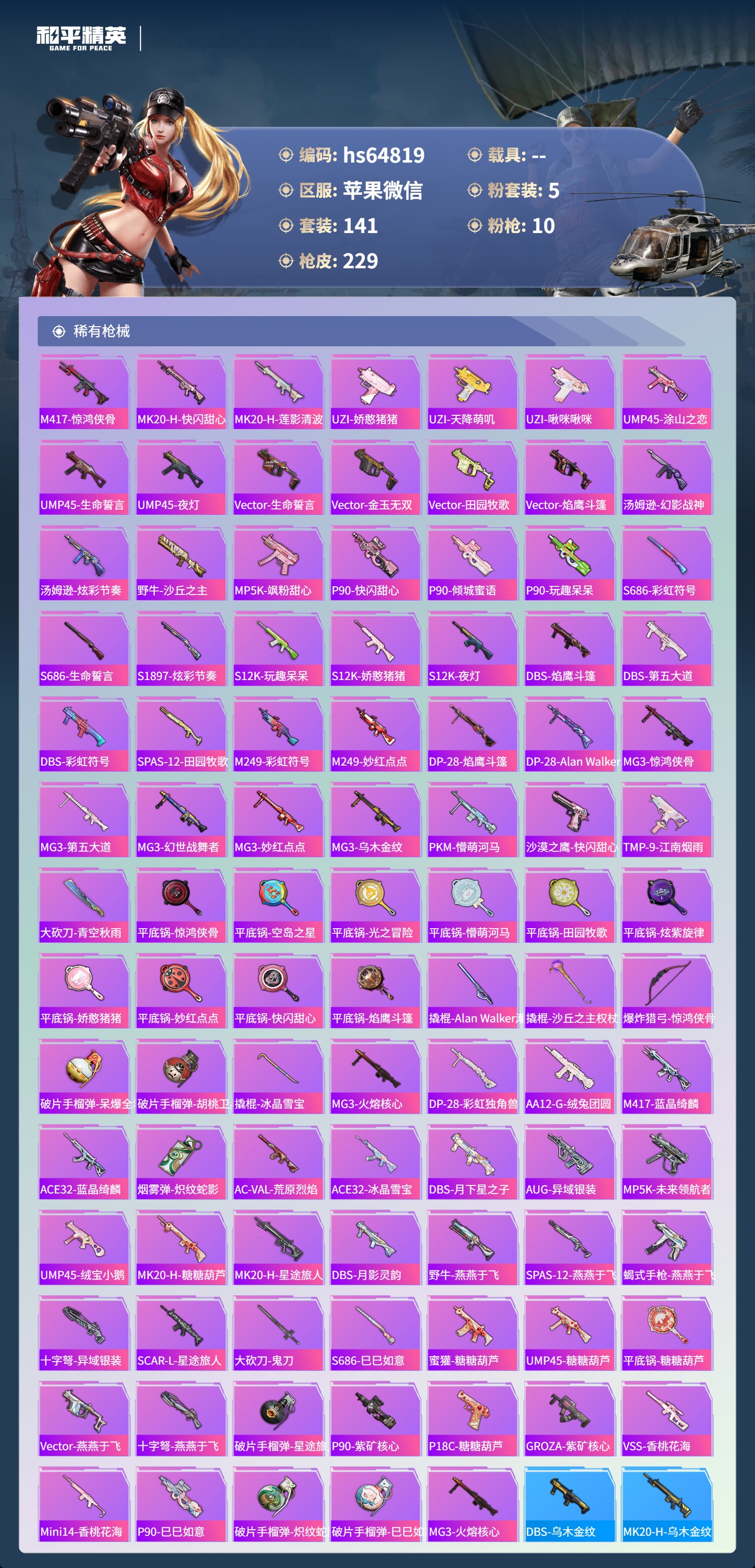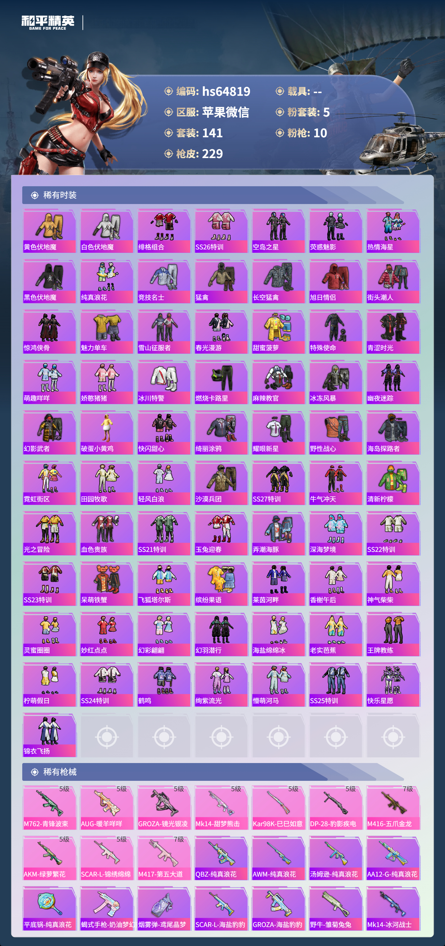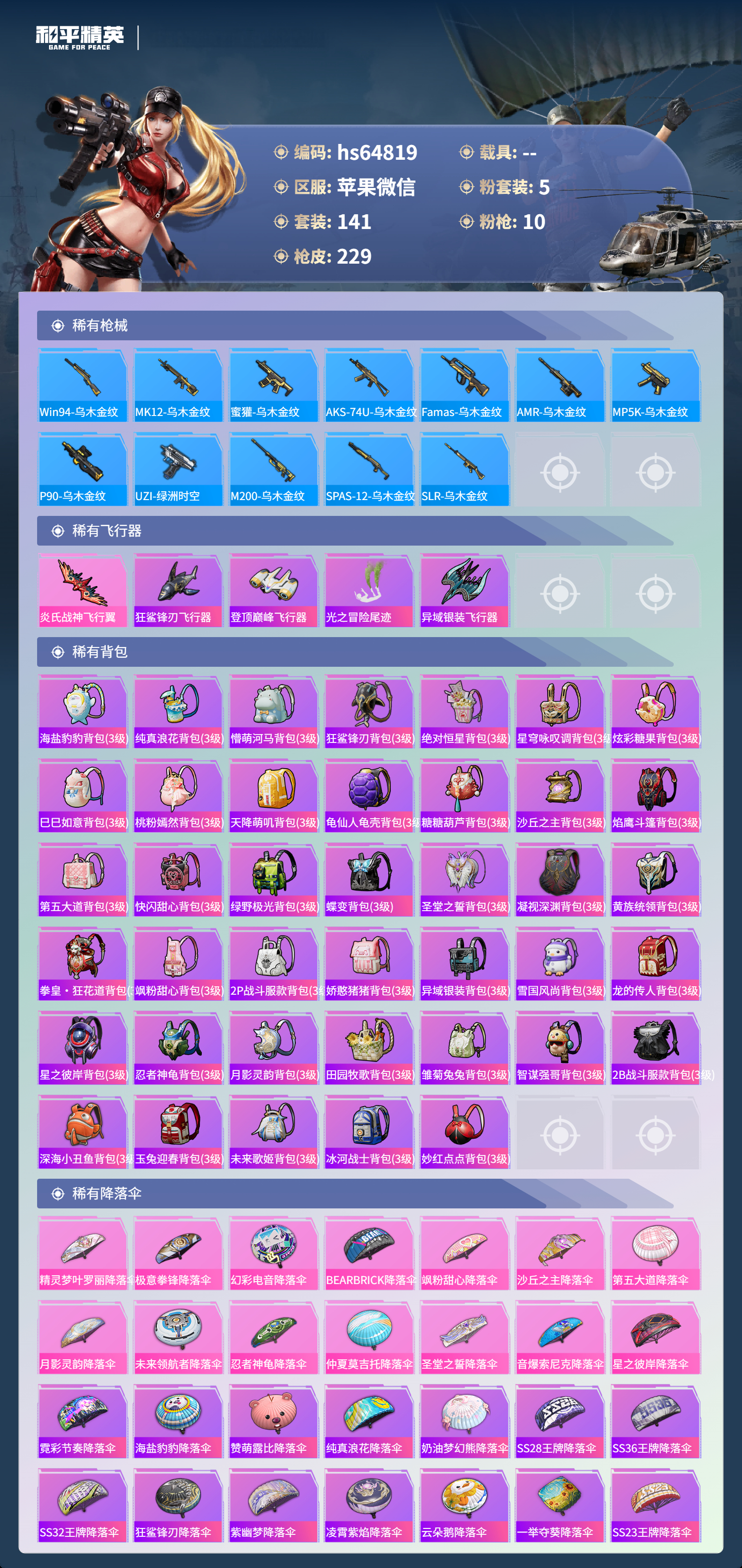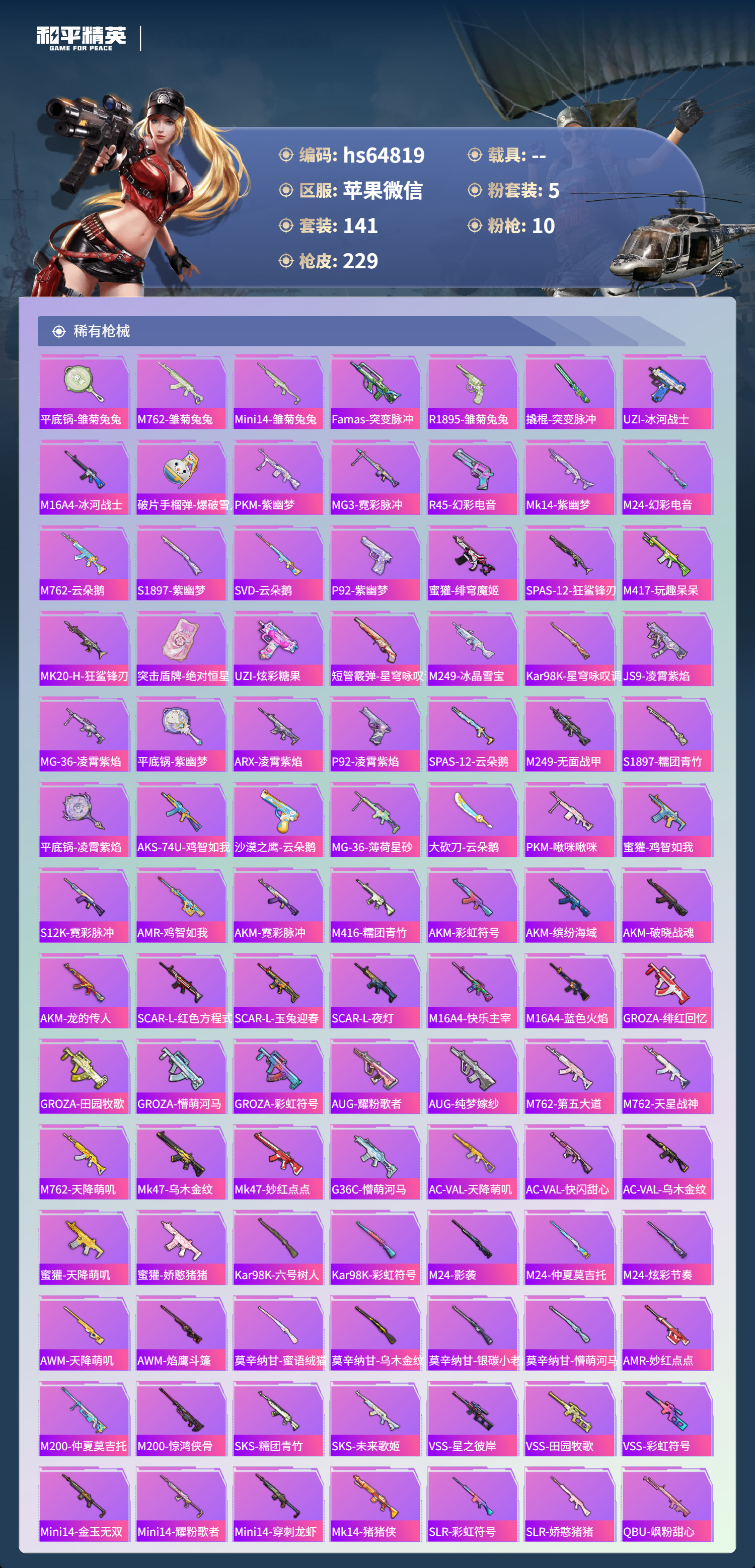hs64819 苹果微信-13王牌印记-5粉装-10特效枪-66307热力值-141套装-229枪皮-2卓越印记