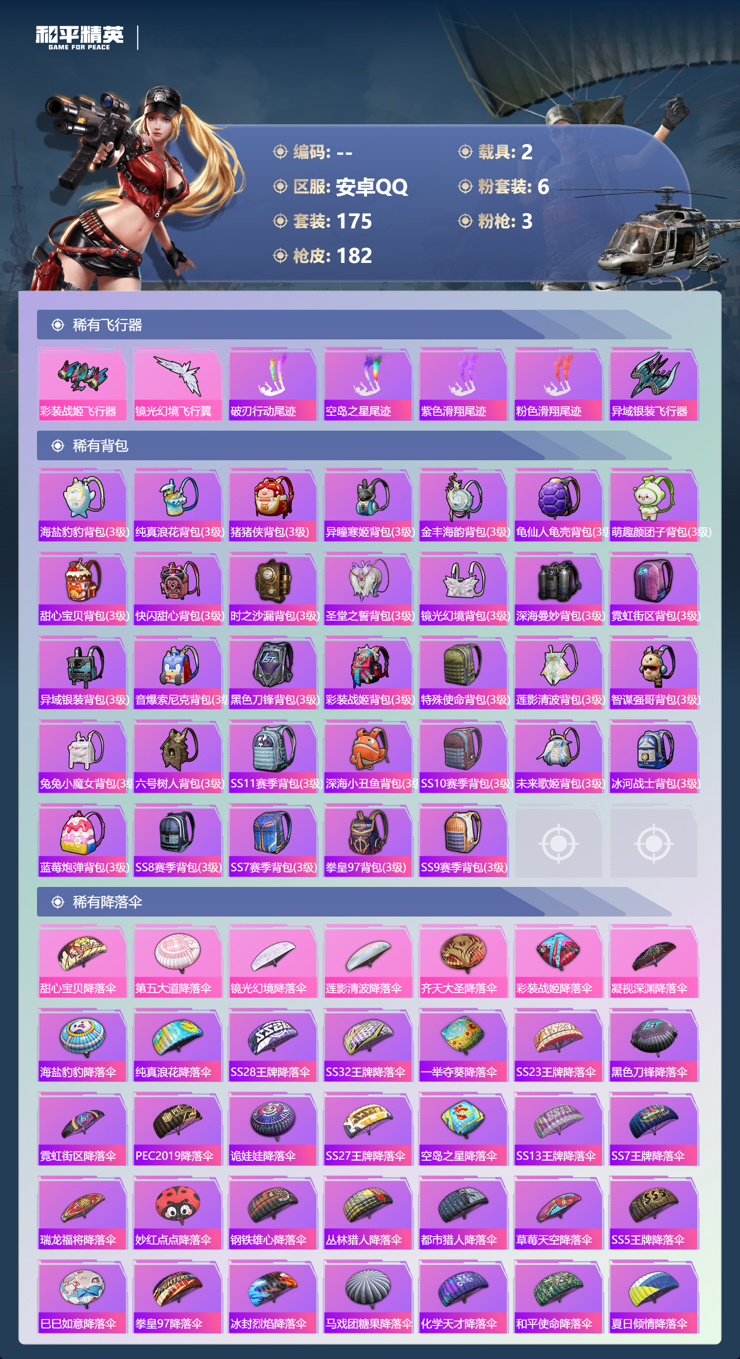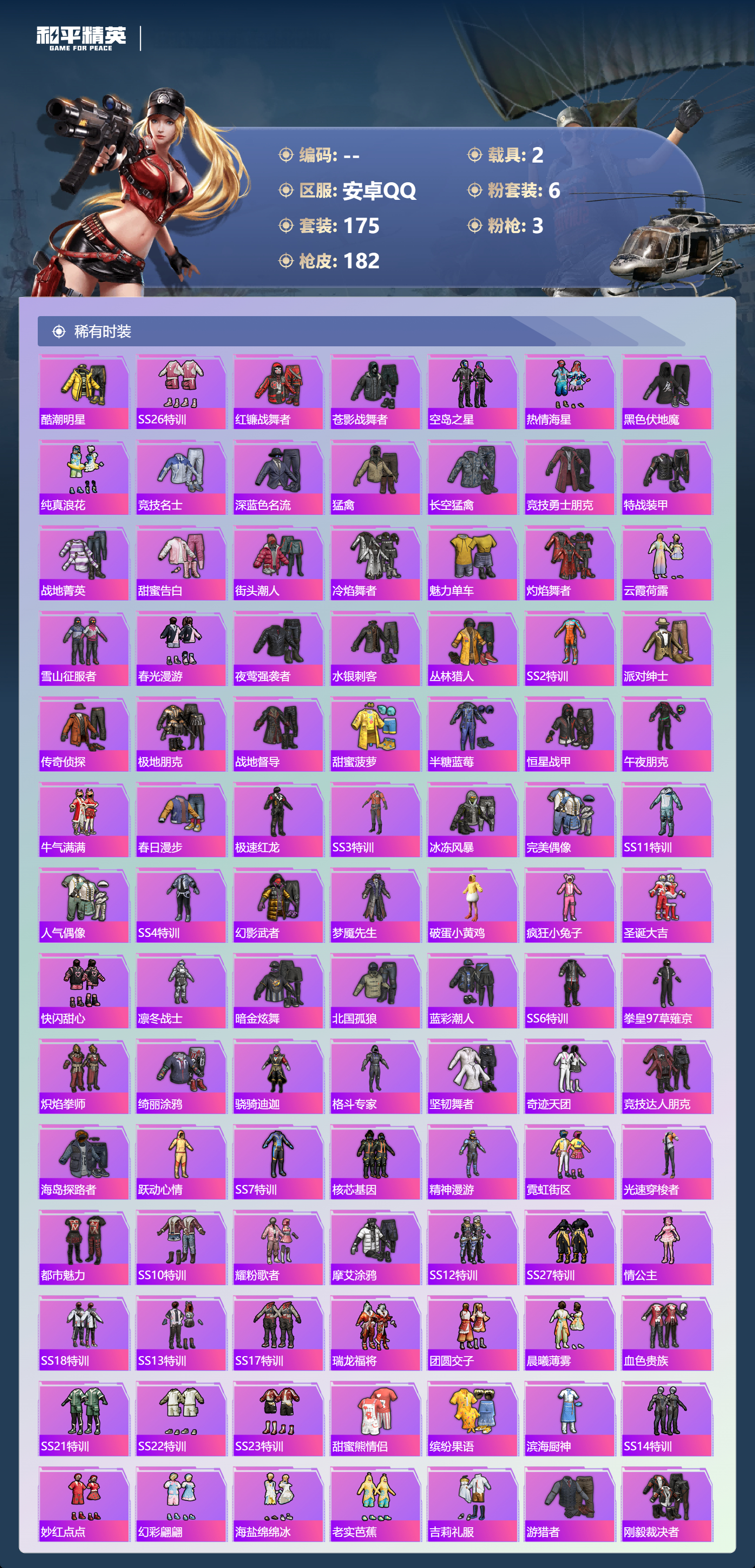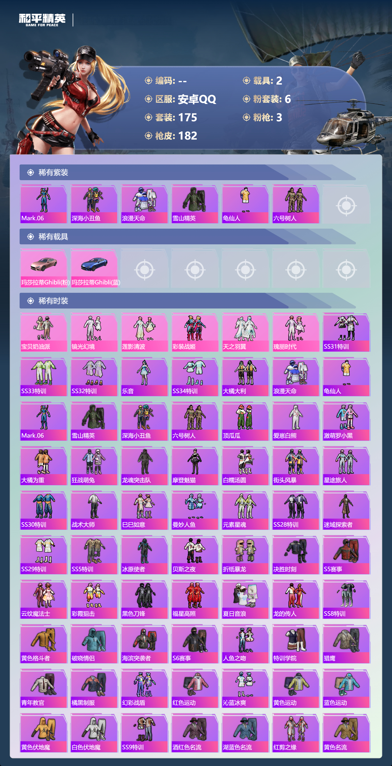 hs64573 安卓手Q-22王牌印记-有战神框-6粉装-3特效枪-2载具-61018热力值-175套装-182枪皮-3卓越印记-2传奇印记