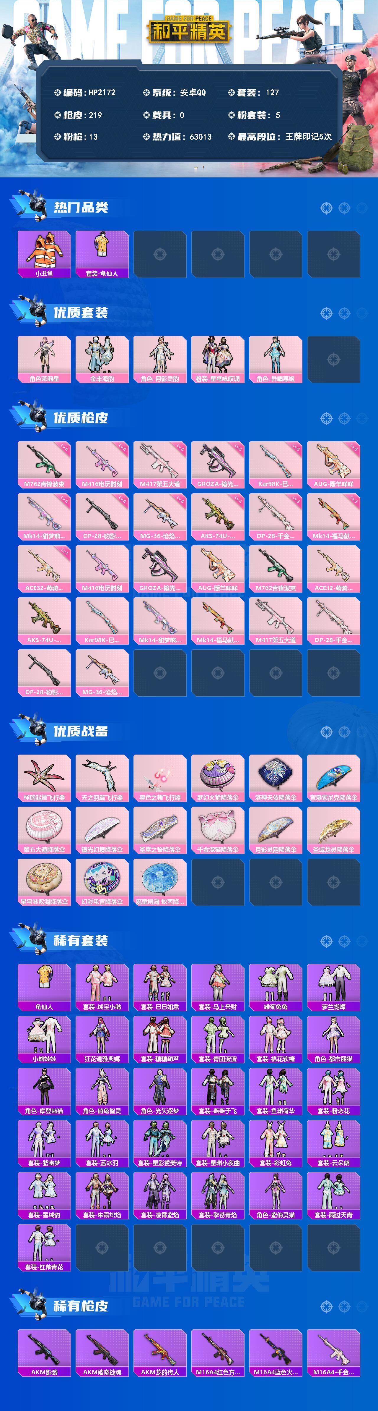 【HP2172】127套装/枪械13/装备247/战备156/王牌印记5/热力值63013/五级M416-电玩时刻/五级GROZA-镜光银凌/五级AUG-暖羊咩咩/五级M762-青锋波束/一级ACE32-萌骑漫游/四级AKS-74U-森灵之息/五级Kar98K-巳巳如意/五级Mk14-甜梦熊击/三级Mk14-福马献瑞/五级M417-第五大道/三级DP-28-千金淑猫/五级DP-28-豹影疾电/五级MG-36-沧焰双生/套装-小丑鱼/套装-龟仙人/角色-茉莉星/粉装-金丰海韵/角色-月影灵韵/粉装