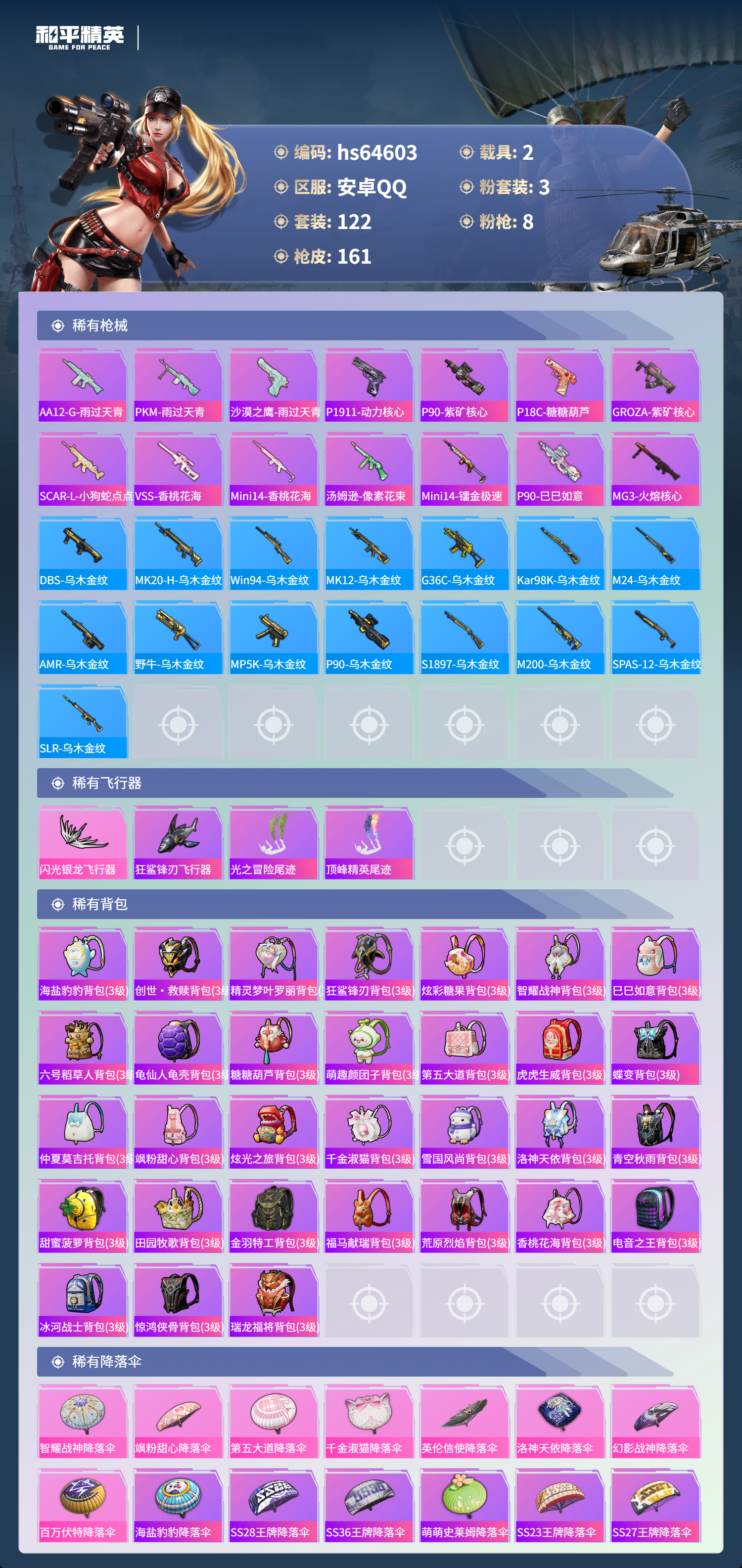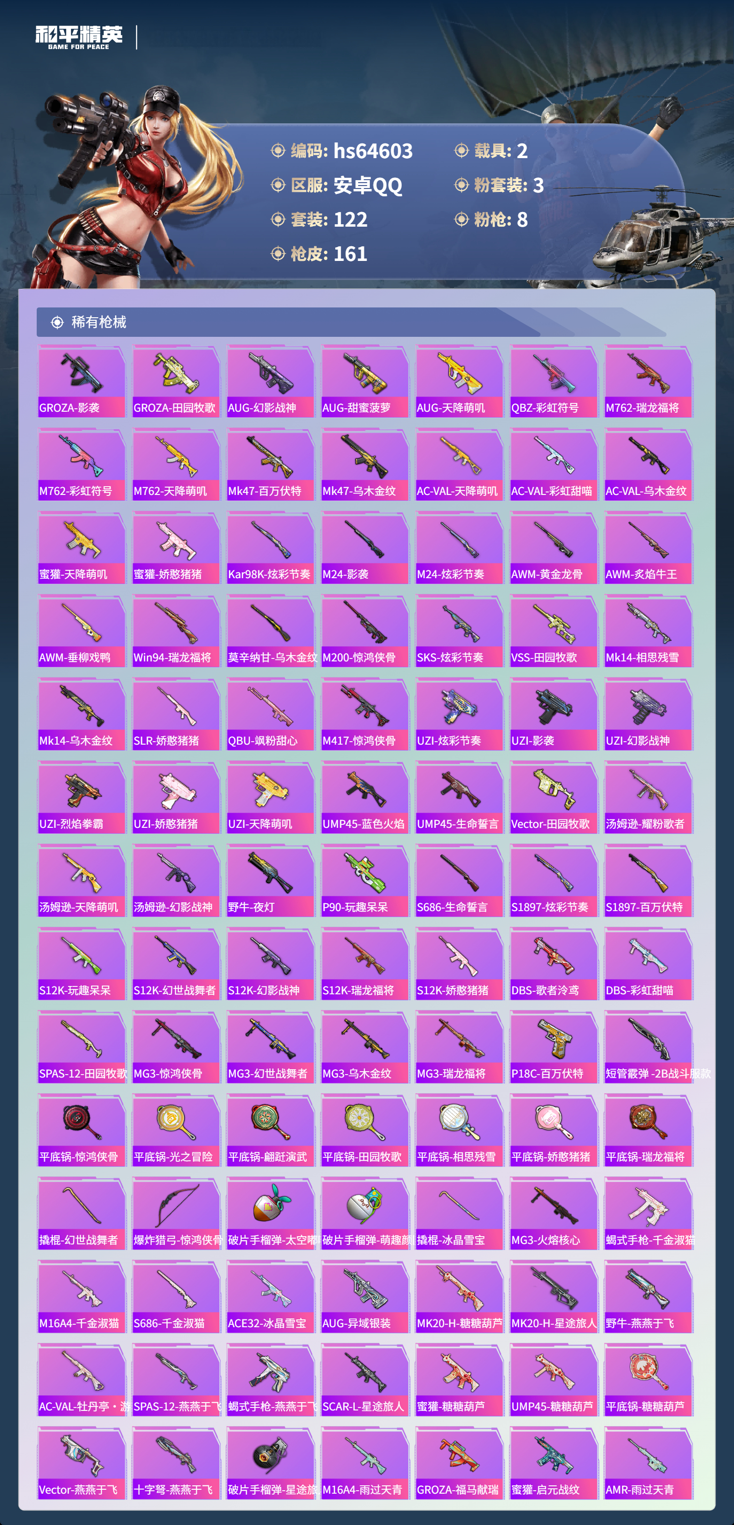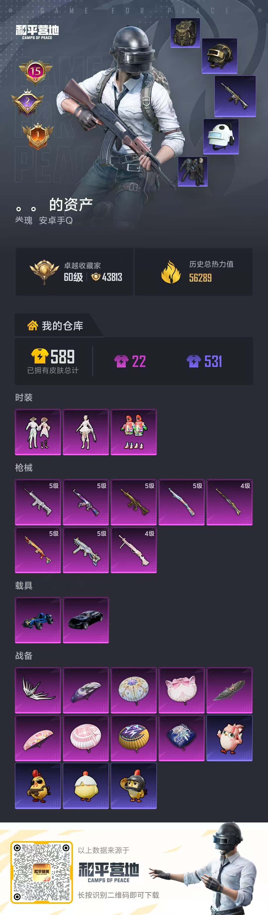 hs64603 安卓手Q-15王牌印记-3粉装-8特效枪-2载具-56289热力值-122套装-161枪皮-2卓越印记-1传奇印记
