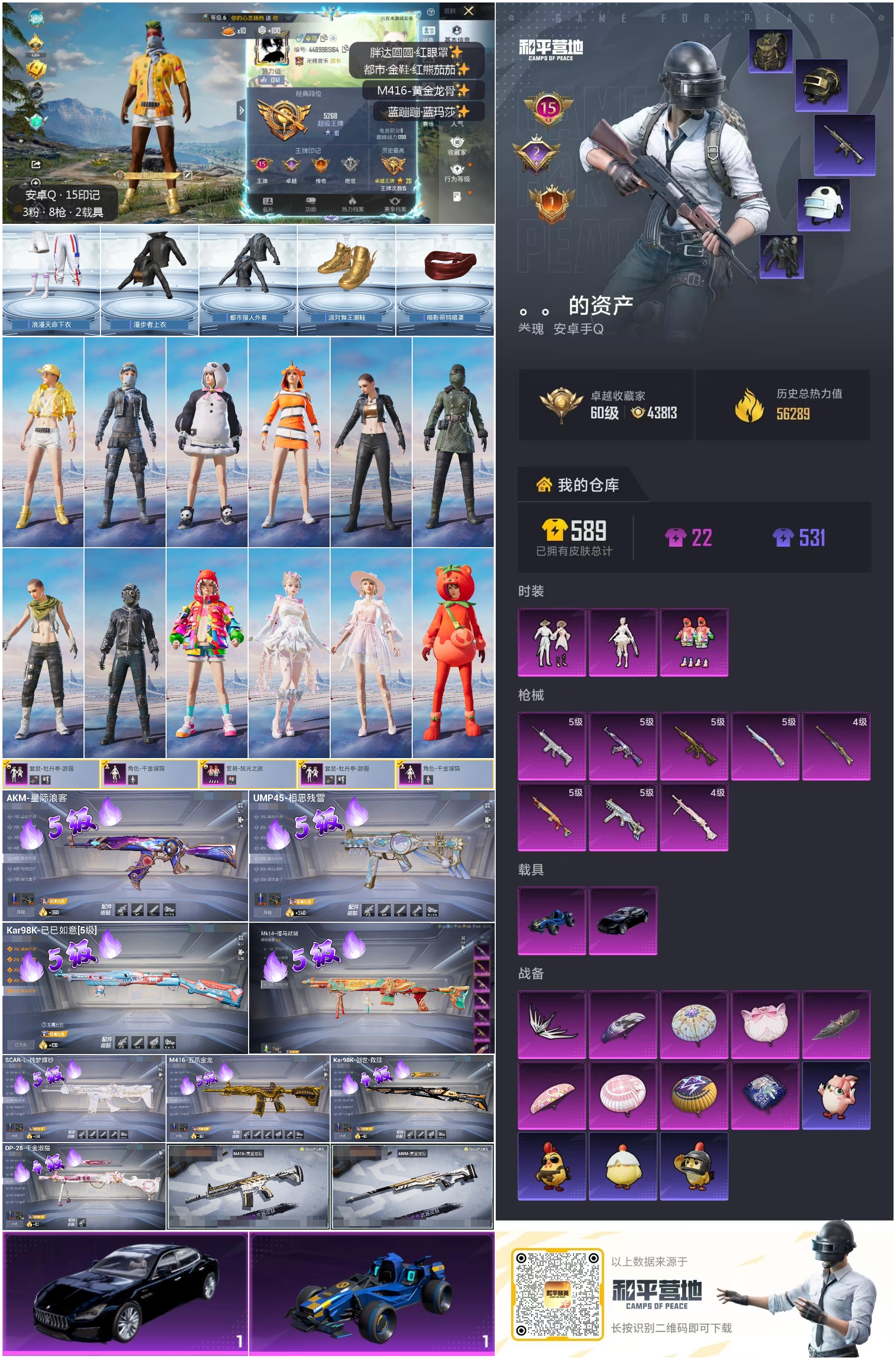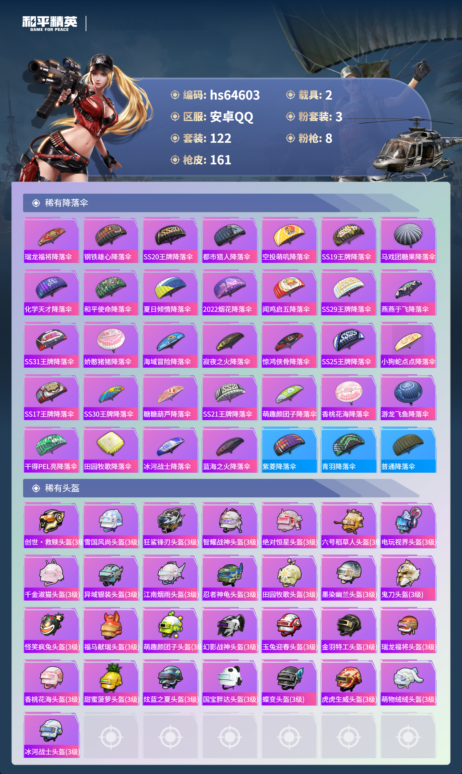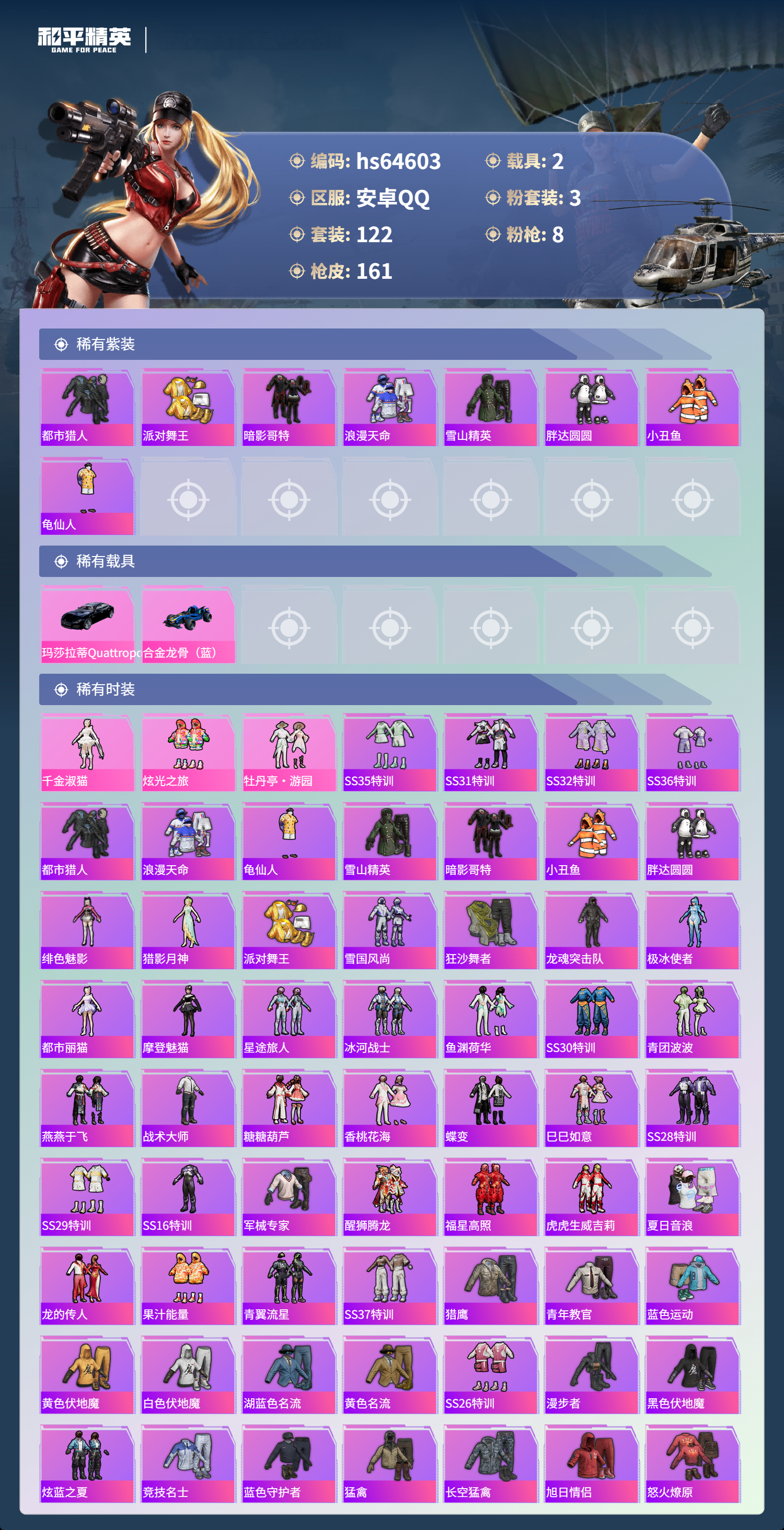 hs64603 安卓手Q-15王牌印记-3粉装-8特效枪-2载具-56289热力值-122套装-161枪皮-2卓越印记-1传奇印记