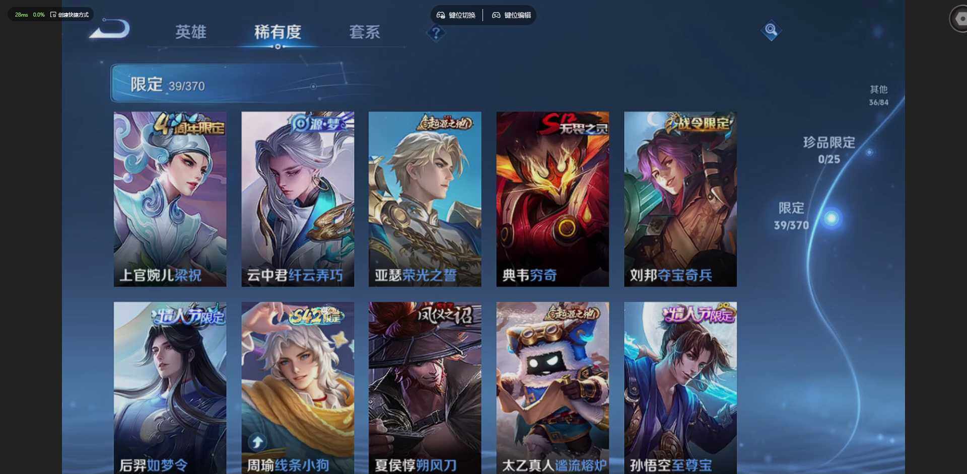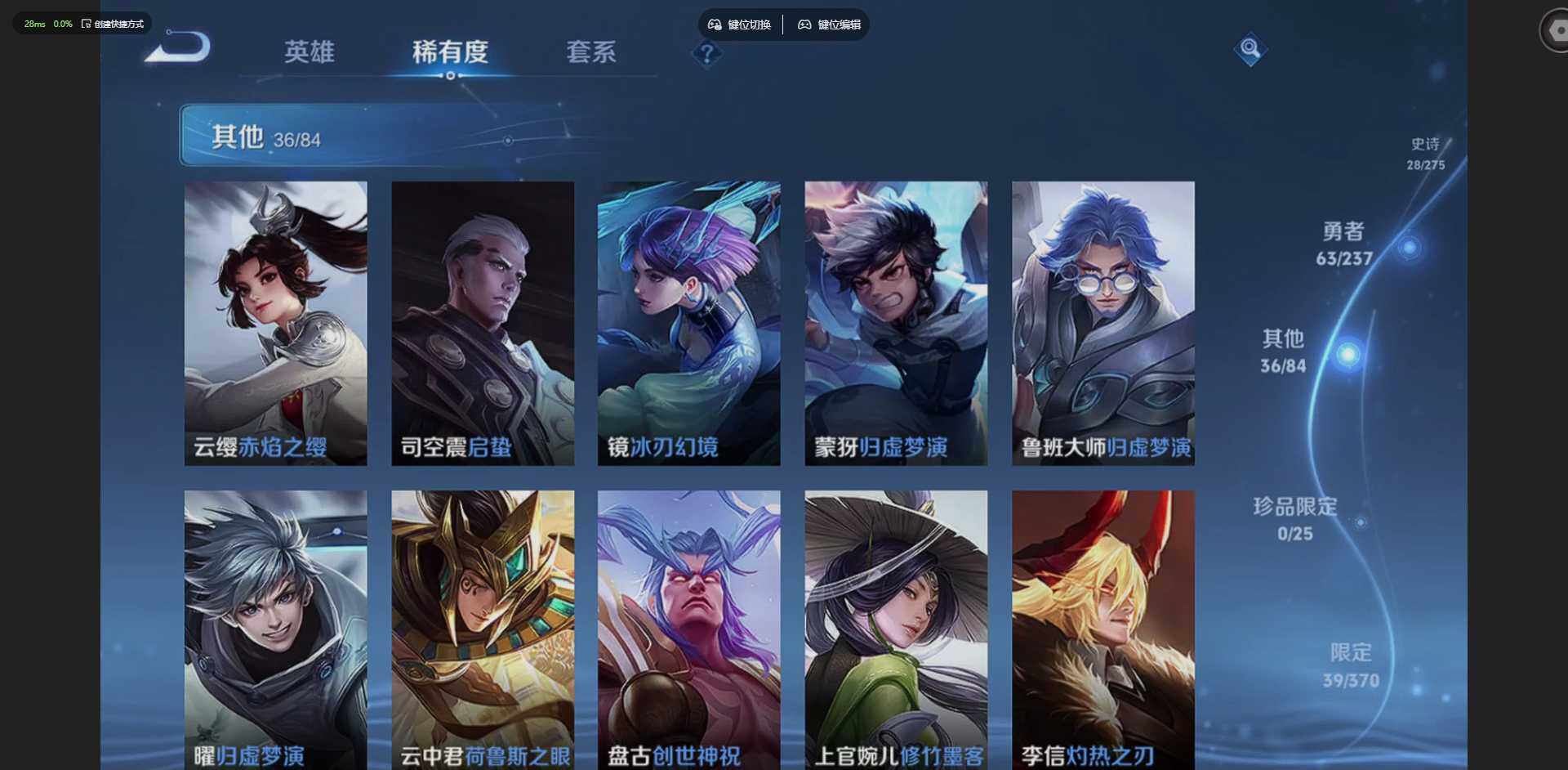 实名: 可修改 贵族等级: V5 英雄数: 117 皮肤数: 128 传说皮: