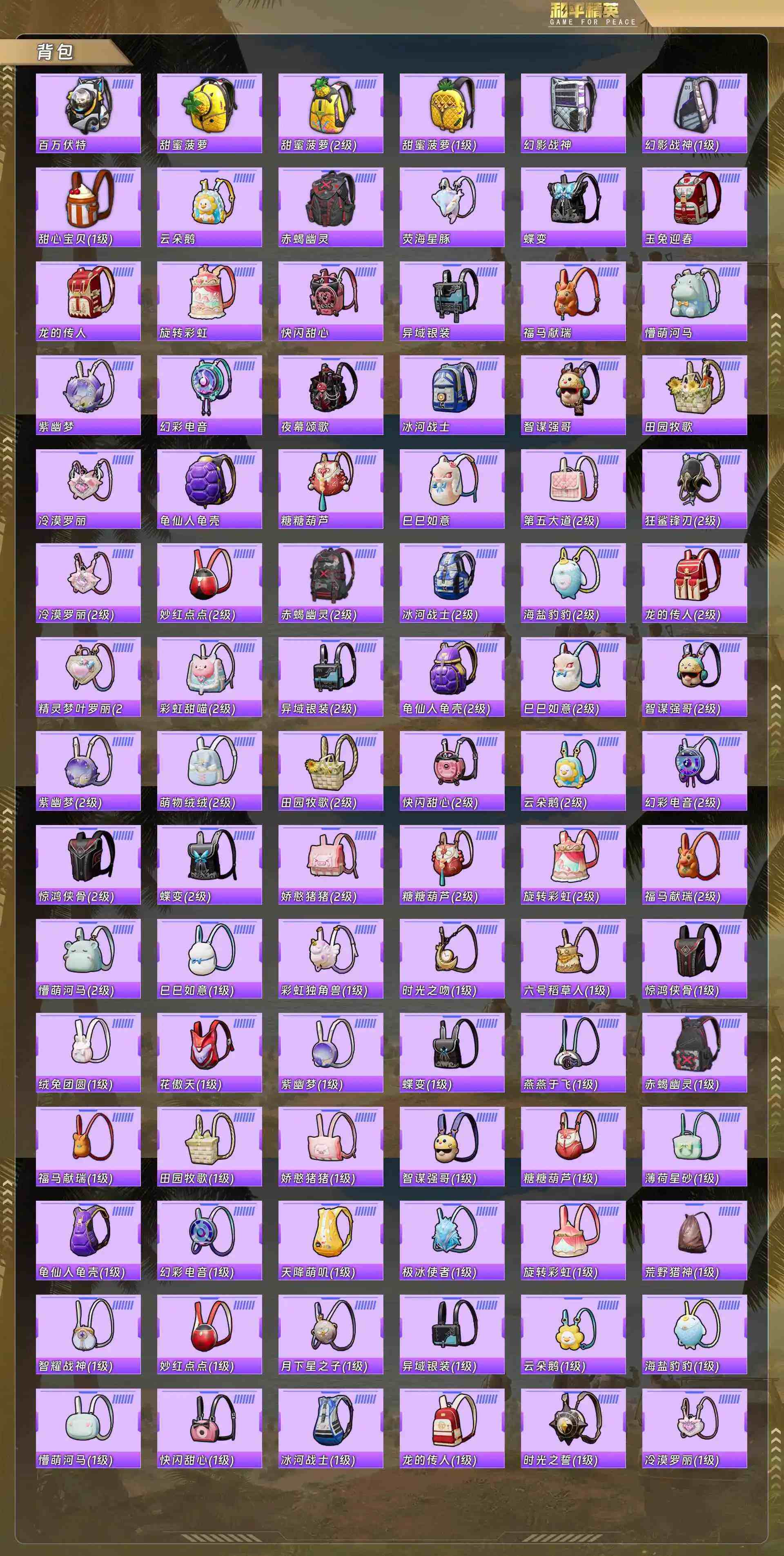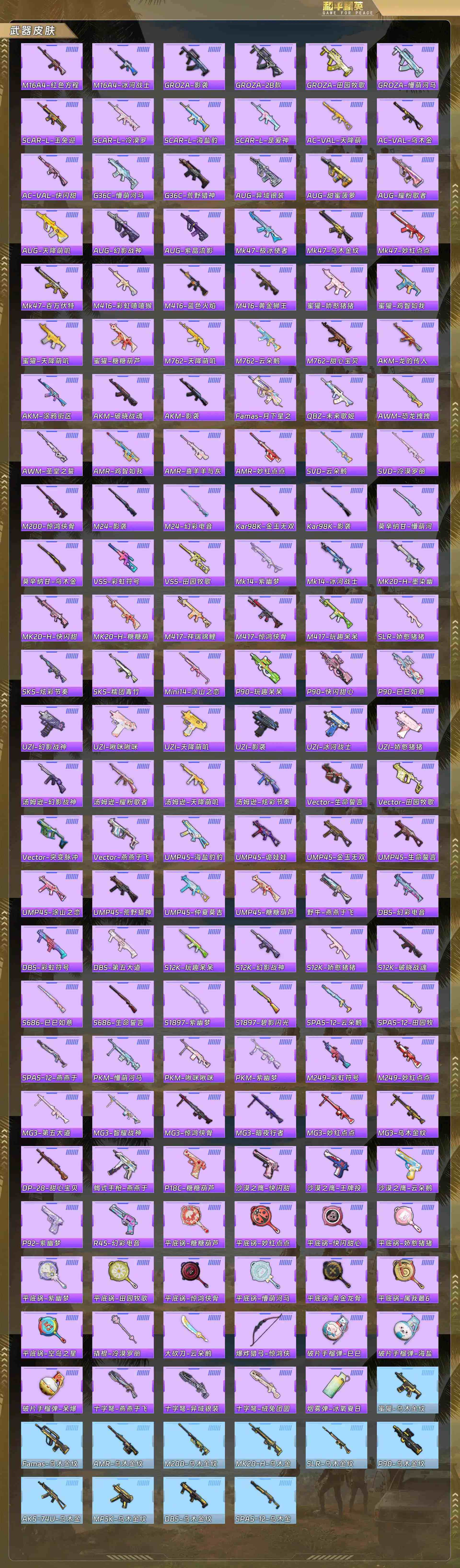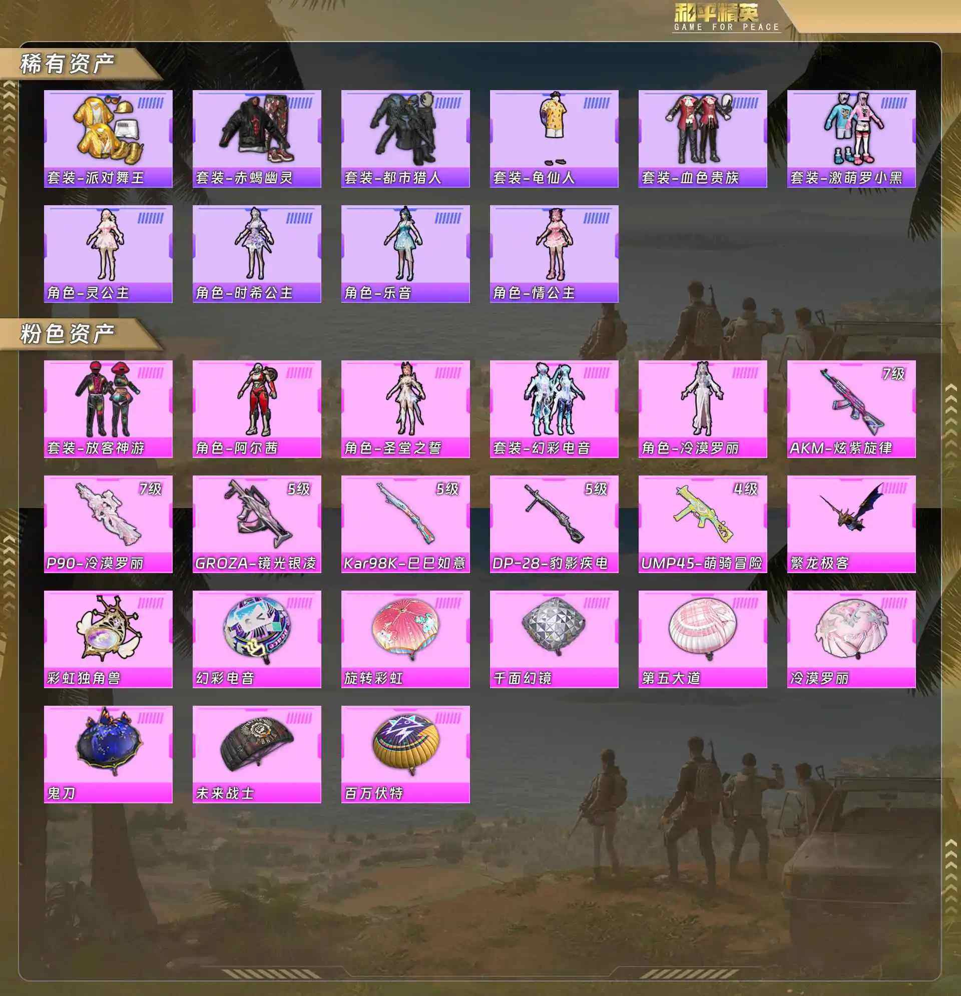 身法号-派对舞王/赤蝎幽灵/都市/血色贵族/激萌罗小黑/灵公主/时希公主/乐音/情公主/客神游/阿尔茜/圣堂之誓/幻彩电音/冷漠罗丽/AKM炫紫旋律7级/P90冷漠罗7级/狗杂镜光银凌5级/Kar98K巳巳如意5级/DP28豹影疾电5级/UMP45萌骑冒4级(5粉装-6粉枪)没战神框HP3225-2粉色飞行器-48456热力值-6王牌印记-105套装-166枪皮