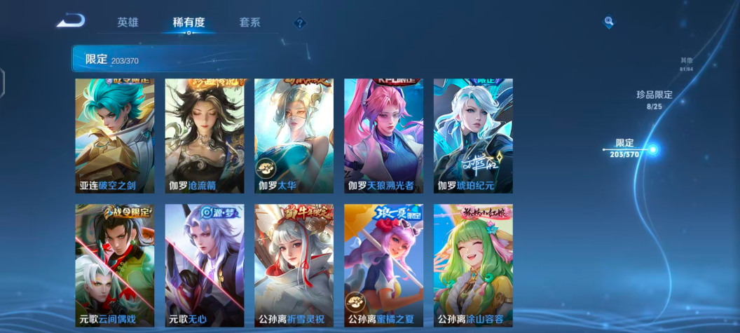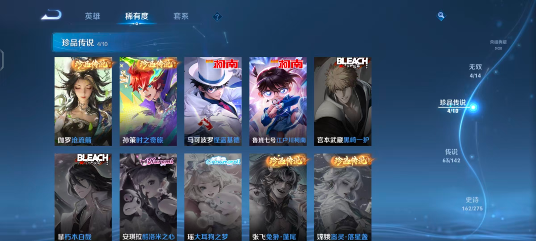 【V10 2小国507皮肤3水晶4无双5星元4珍品63传说