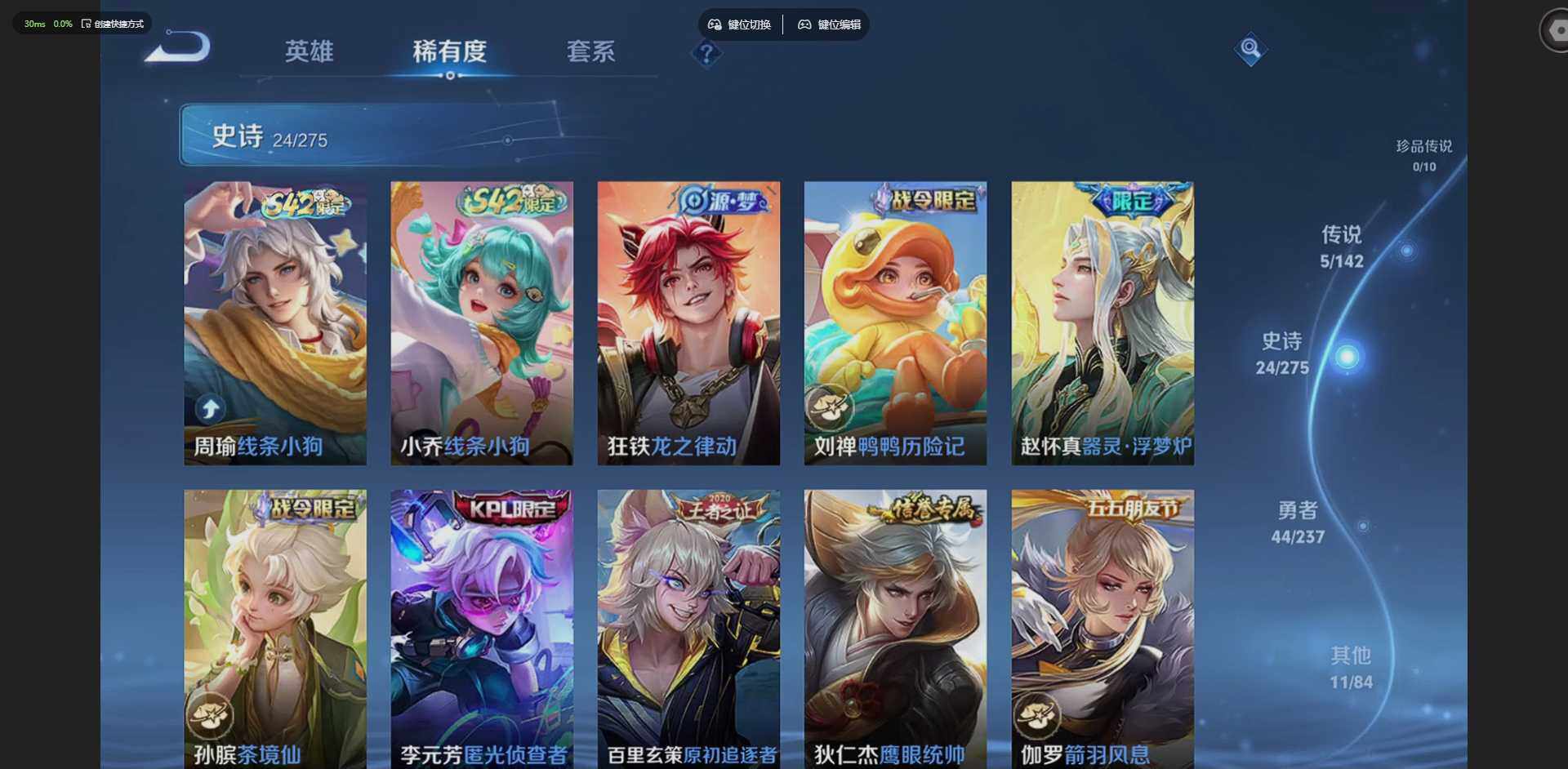 实名: 可修改 贵族等级: V4 英雄数: 109 皮肤数: 84 星传说: