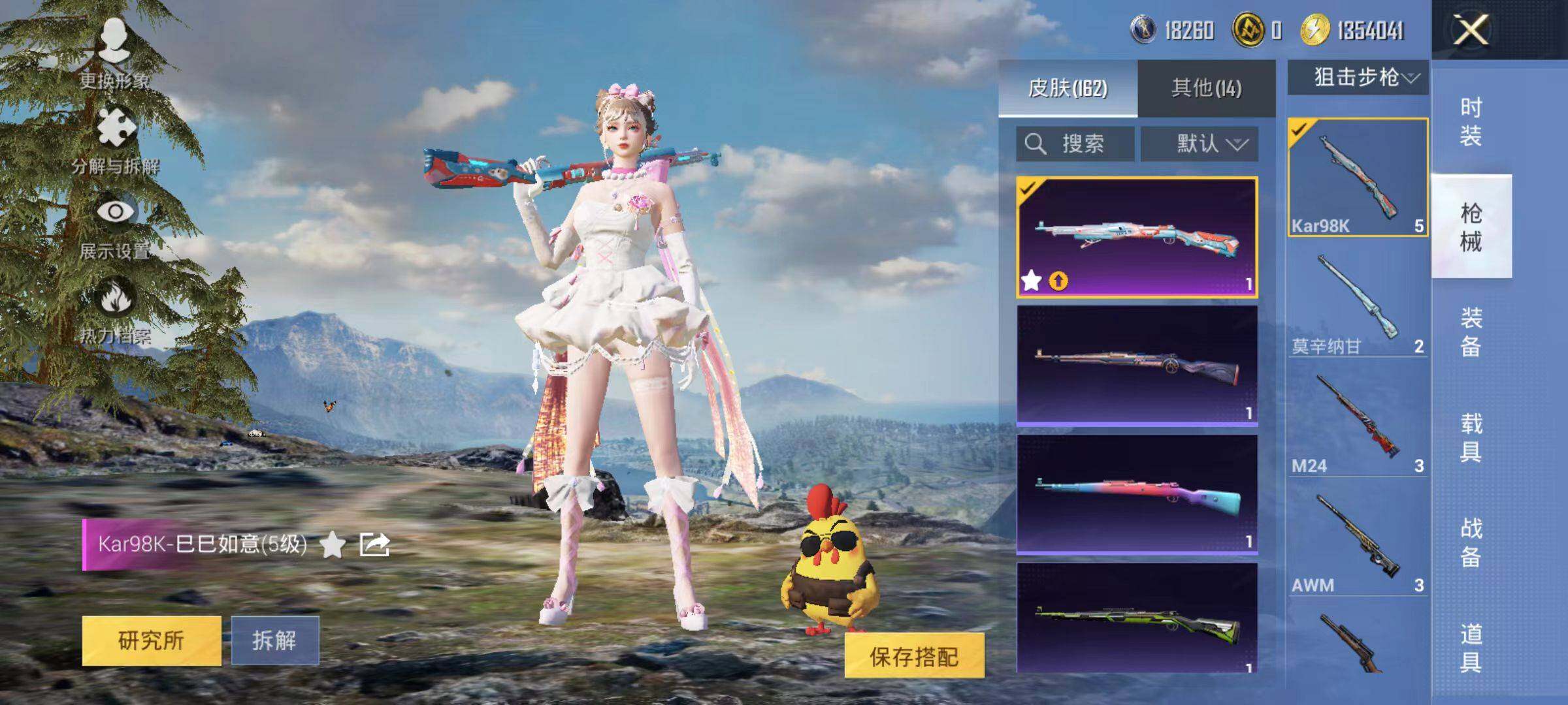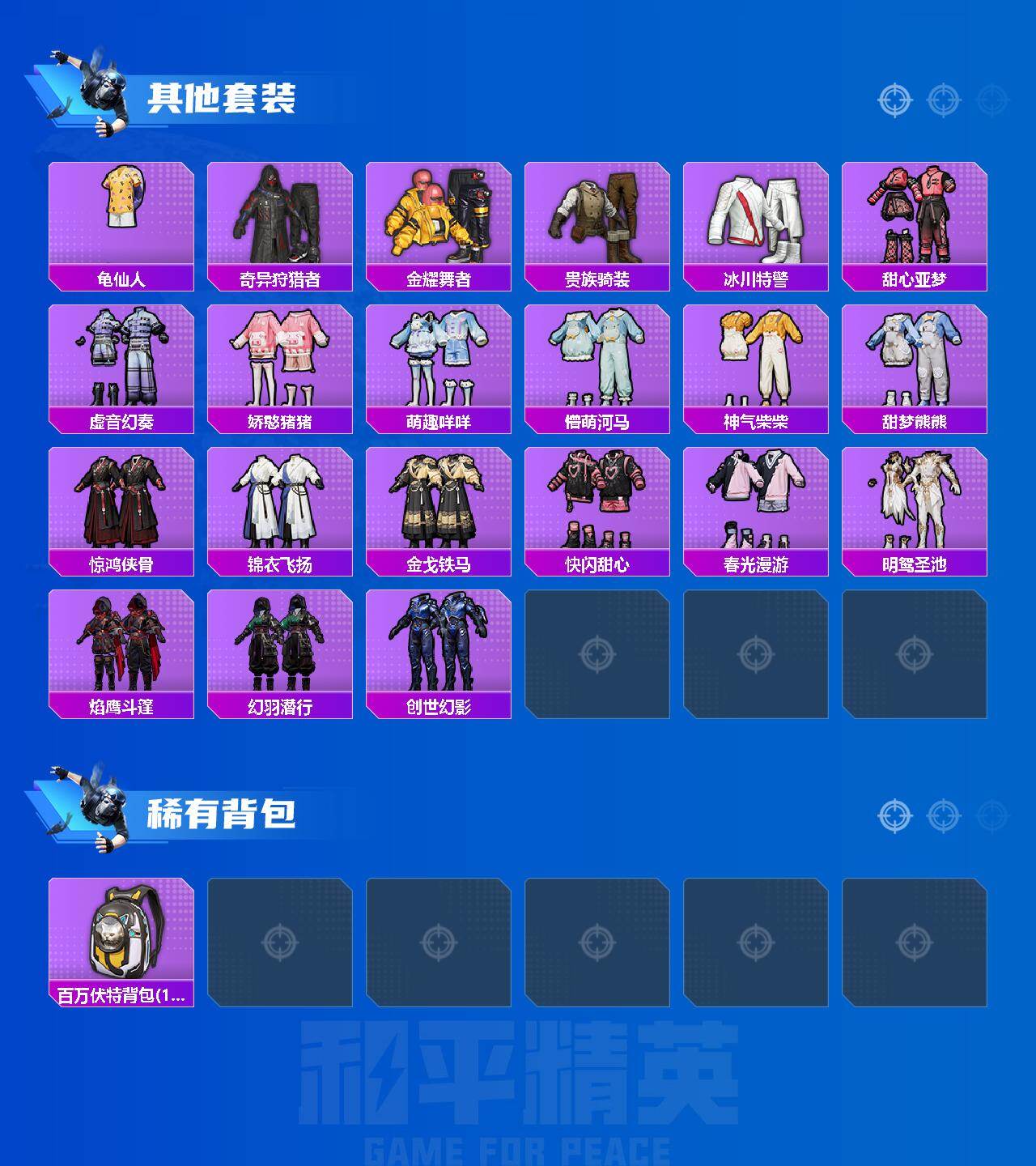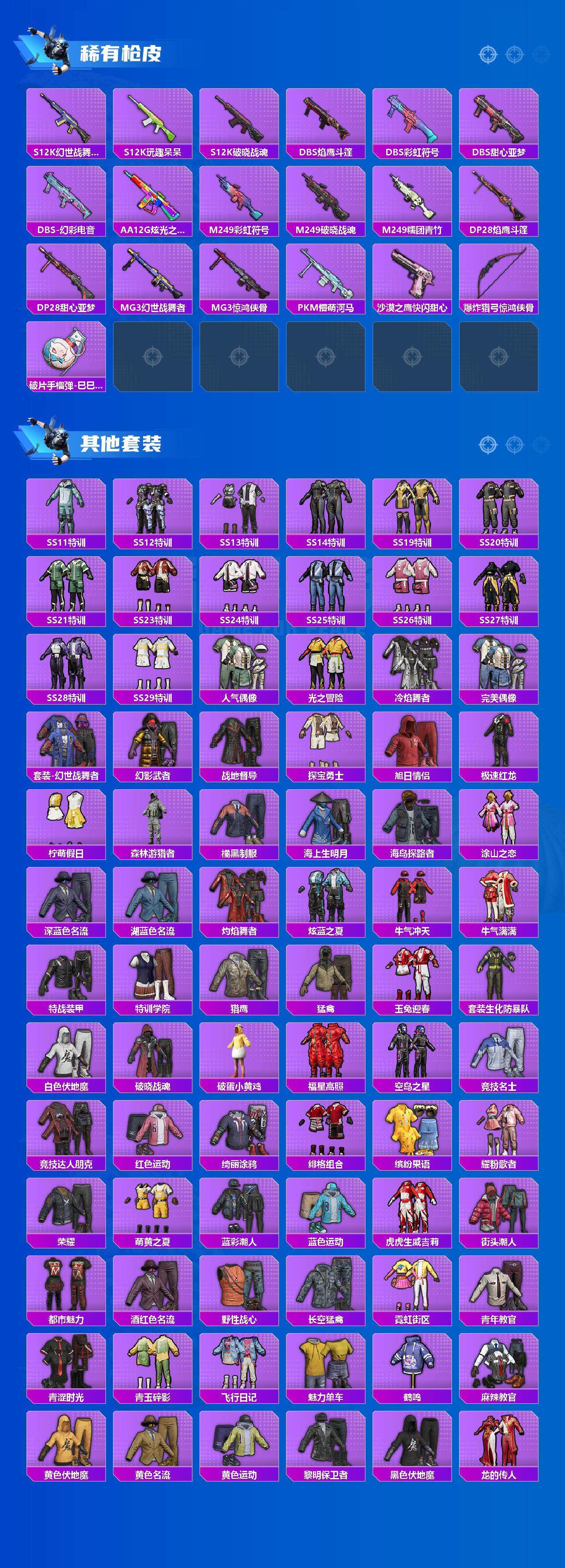 138套装/枪械2/装备189/战备118/王牌印记13/热力值45641/五级Kar98K-巳巳如意/五级DP-28-豹影疾电/奇异狩猎者/军刀雅典娜/套装-龟仙人/角色-千金淑猫/Kar98K-巳巳如意/DP-28-豹影疾电/环太平洋降落伞/千面幻镜降落伞/闲梦青缨降落伞/蜜语绒猫降落伞/创世·救赎降落伞/炫彩糖果降落伞/龟仙人/巳巳如意/套装-雪国风尚/角色-多纳泰罗/套装-糖糖葫芦/套装