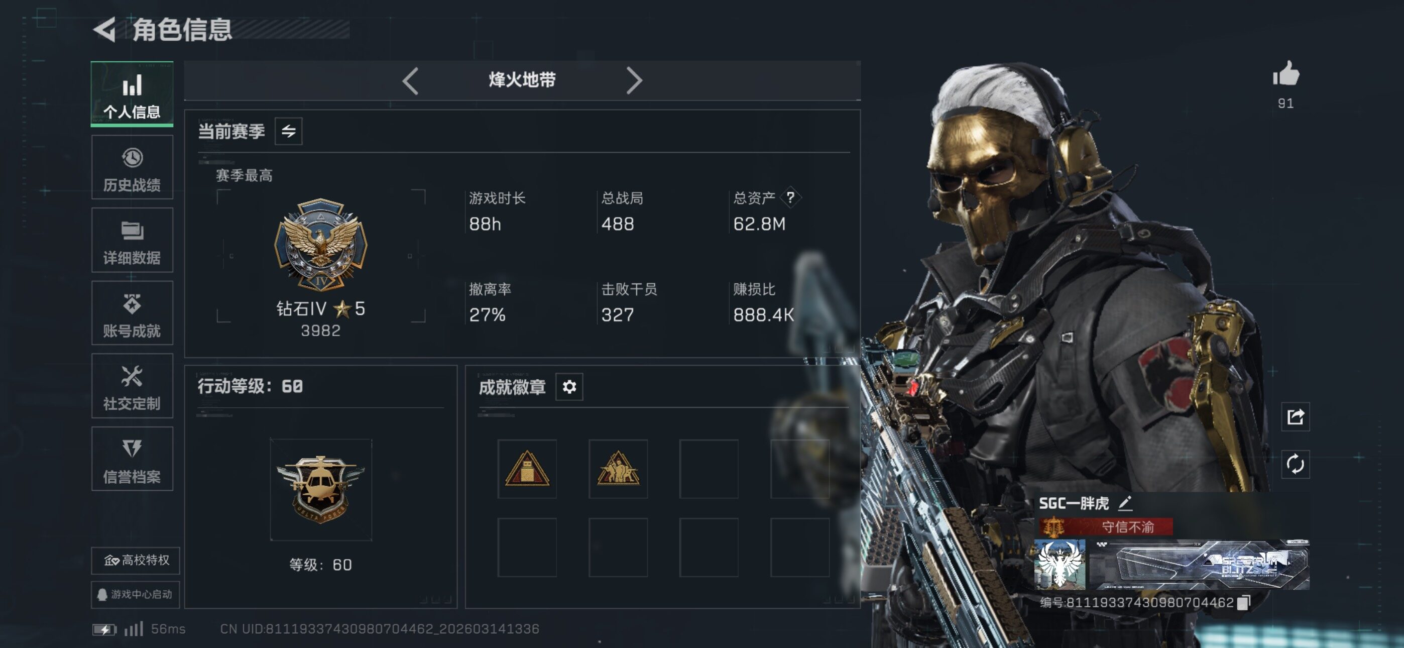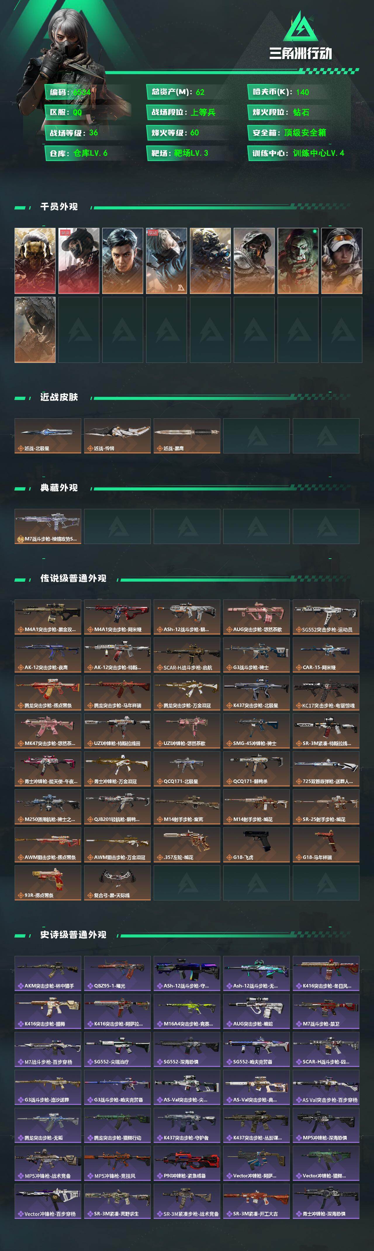 {特价出售}等级:60 总资产:62.8M 纯币140050 红皮:蚀金玫瑰,飞虎,黑天际线 刀皮: 怜悯,北极星 砖皮: m7棱镜(优品s)特勤处:仓库6,训练4,靶场3 部门22222 威龙-飞虎,蜂医-送葬人·无题密令,无名-夜鹰,深蓝-不破誓约,红狼-电锯惊魂,露娜-金牌射手,乌鲁鲁-荒原猎手