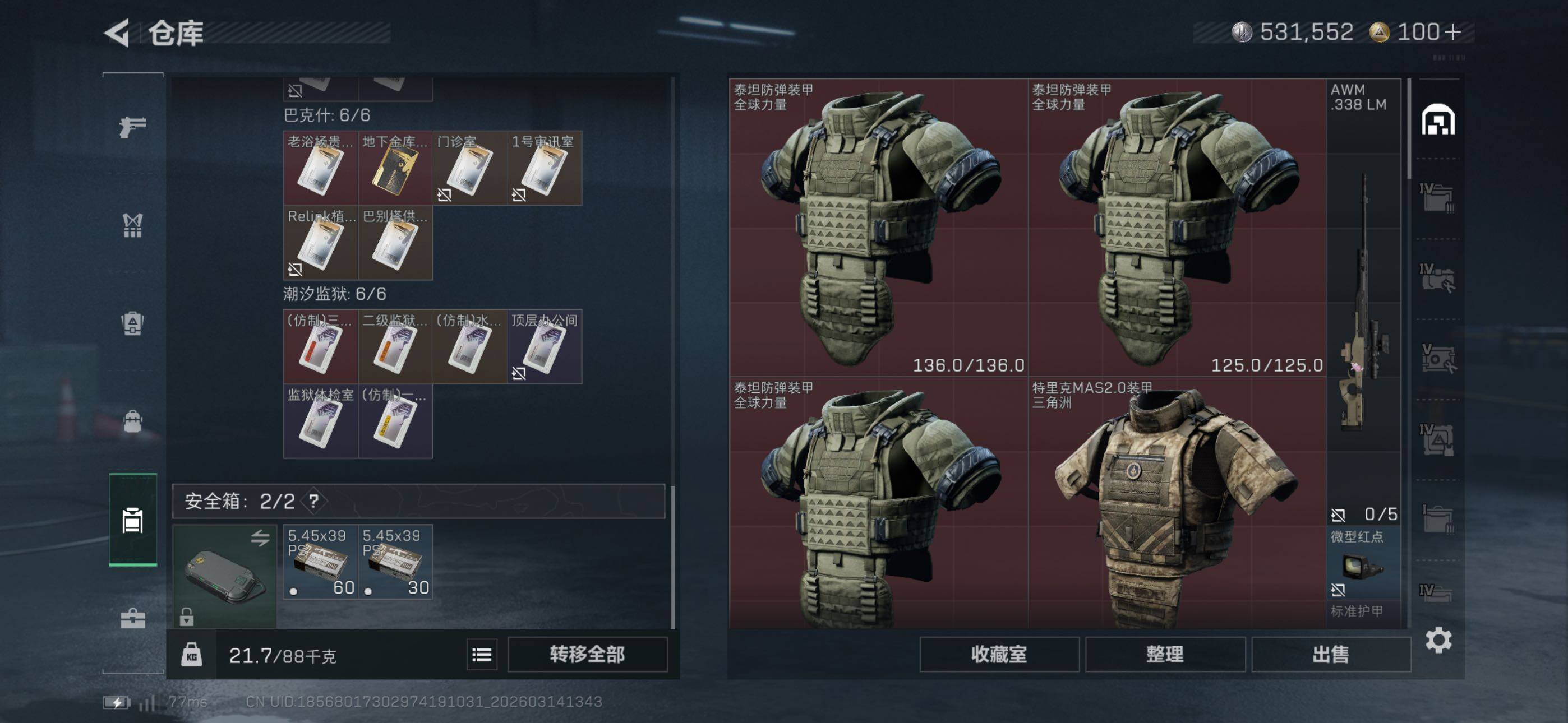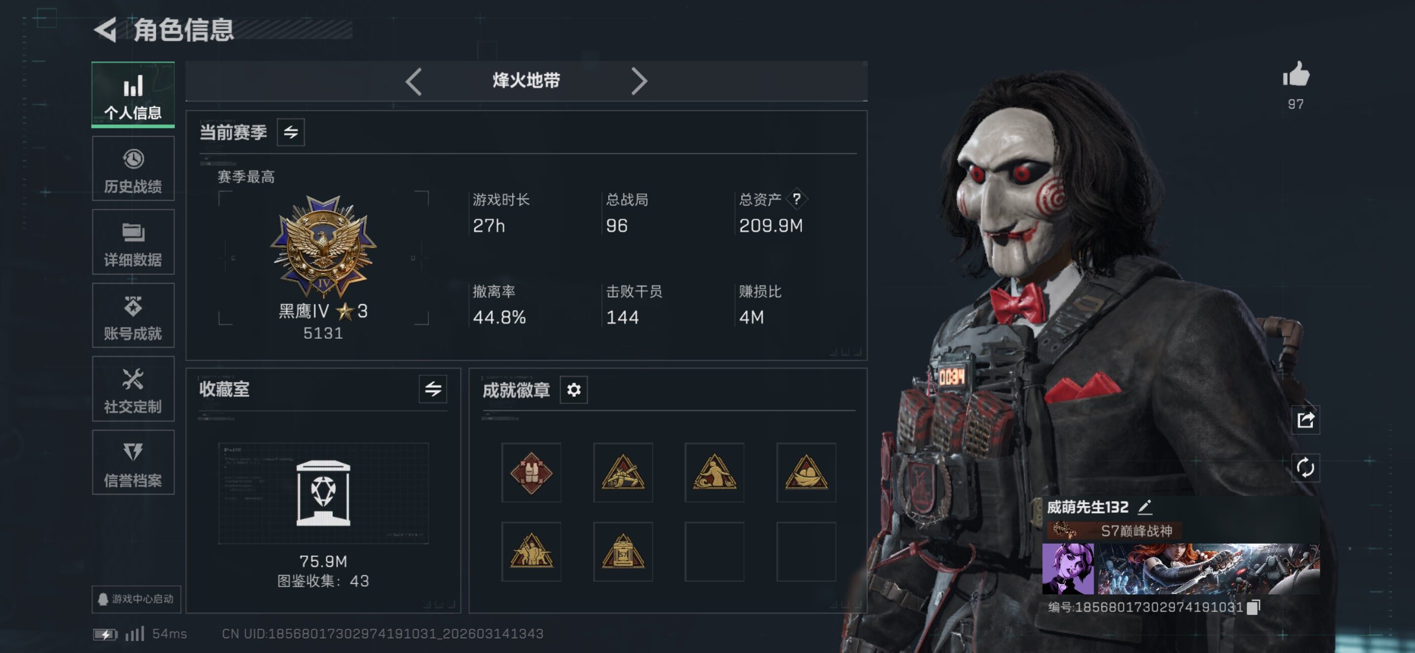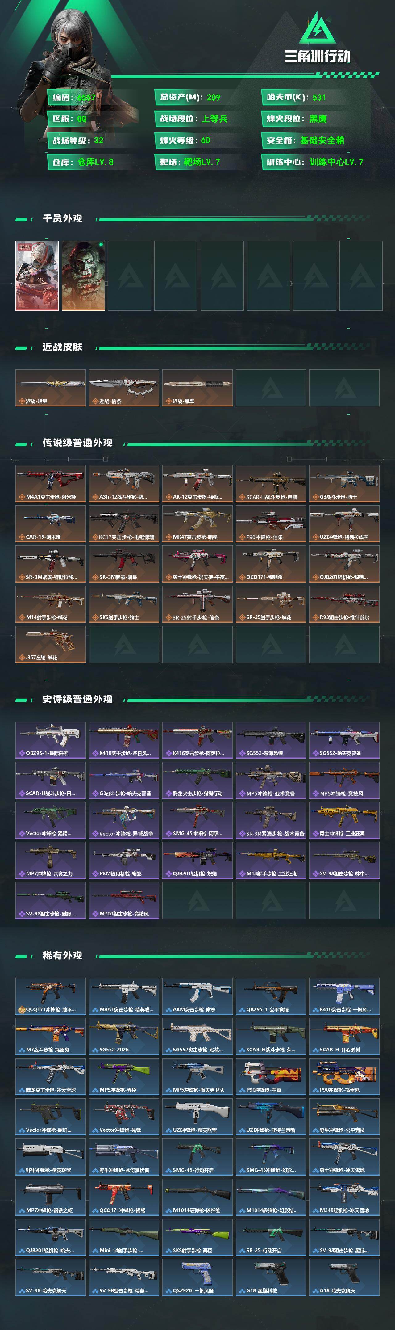 等级:60总资产:209.9M 纯币531552 红皮:维什戴尔 刀皮 暗星 信条 特勤处:仓库8,训练7,靶场7 部门23333 红狼-电锯惊魂