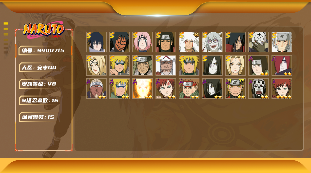 【编号57720 可秒换绑】【店长推荐捡漏号!】16S级忍者数-28A级忍者数【S级忍者】:猿飞日斩「秽土转生」(3星),波风水门「秽土转生」(3星),千手扉间「秽土转生」(3星),千手柱间「秽土转生」(3星),宇智波斑「秽土转生」(3星),春野樱「忍界大战」(3星),自来也「舞之豪杰」(3星),大蛇丸(3星),纲手(4星),纲手「百豪」(3星),猿飞日斩(3星),波风水门(3星),药师兜「仙人模式」(3星),神秘面具男「红夜之刃」(3星),宇智波佐助「永恒万花筒」(3星),宇智波斑 「白面具」
