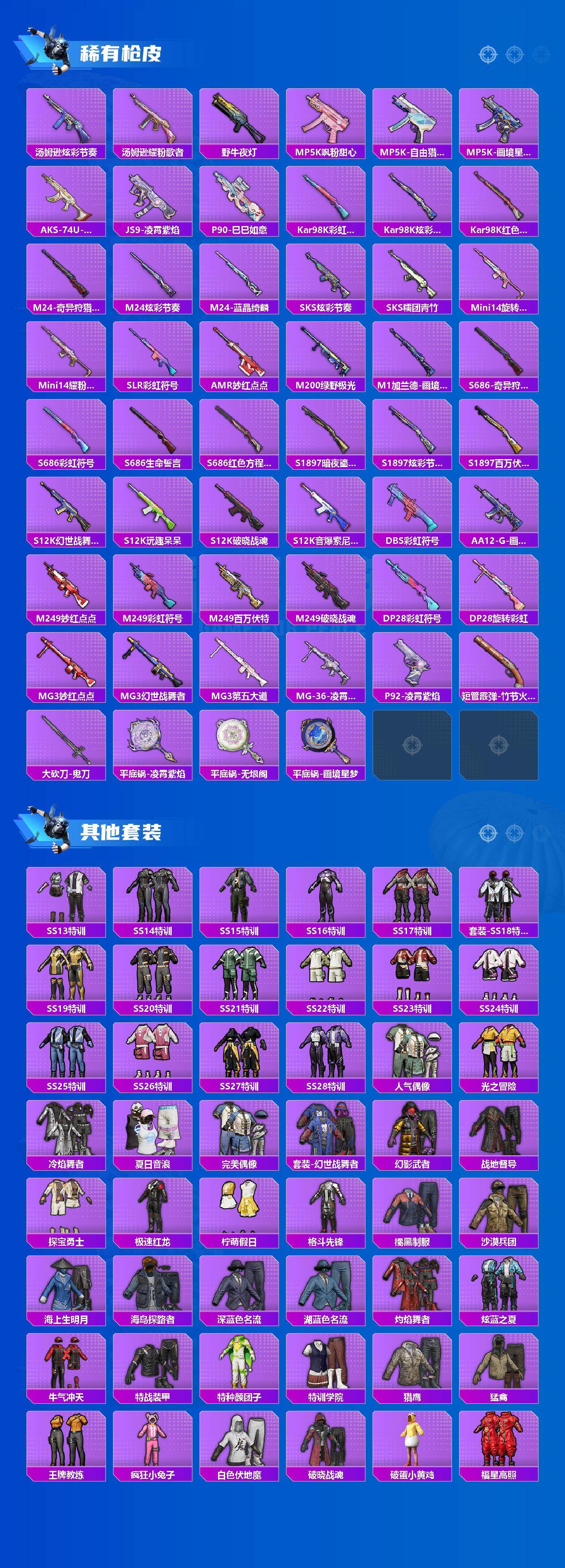【粉色枪皮等级】:GROZA-镜光银凌(五级),M762-鬼刀(五级),AKS-74U-森灵之息(四级),Kar98K-巳巳如意(五级),DP-28-豹影疾电(五级),MG-36-沧焰双生(五级)
