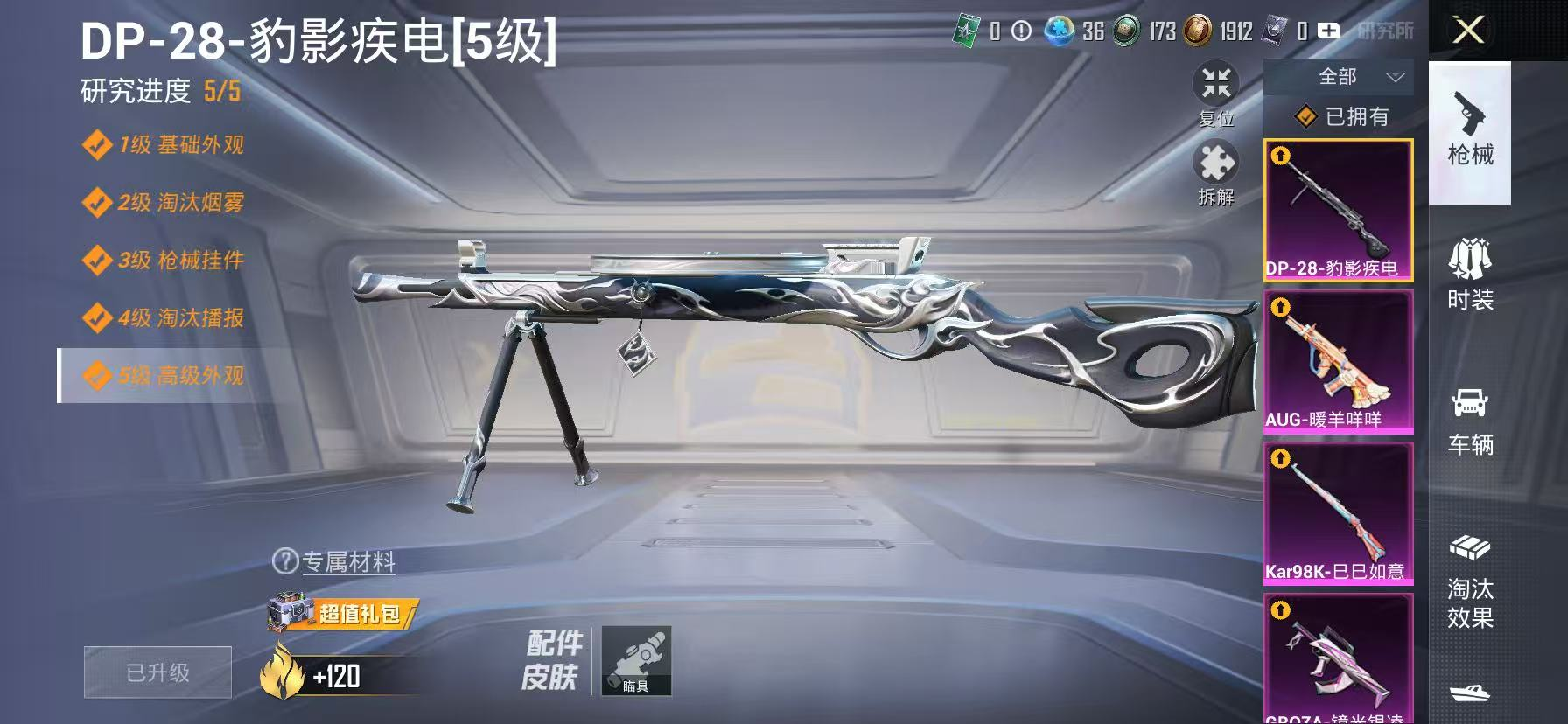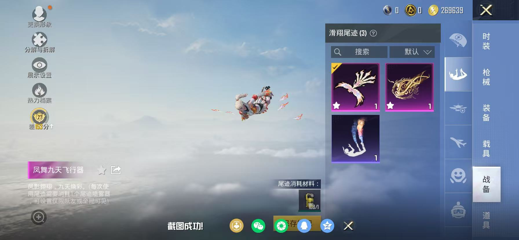 832-【4特效枪 可秒换绑不用等】 苹果Q区-15064热力值-27套装-66枪皮 【4特效枪】 GROZA-镜光银凌(5级) Kar98K-巳巳如意(5级) DP-28-豹影疾电(5级) AUG-暖羊咩咩(5级)【6热门】 M416-蓝色火焰 长空猛禽 M762-彩虹符号 UMP45-蓝色火焰 MG3-幻世战舞者【2飞行器】 凤舞九天飞行器 万象金身飞行器