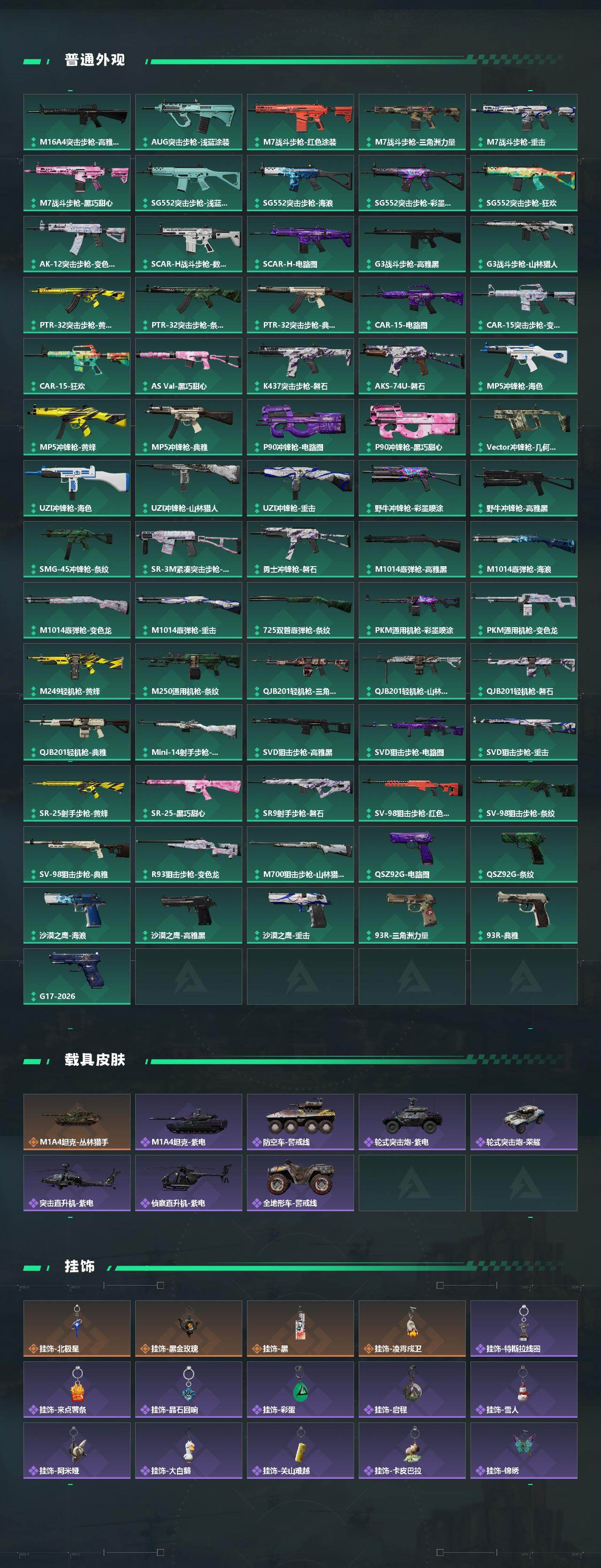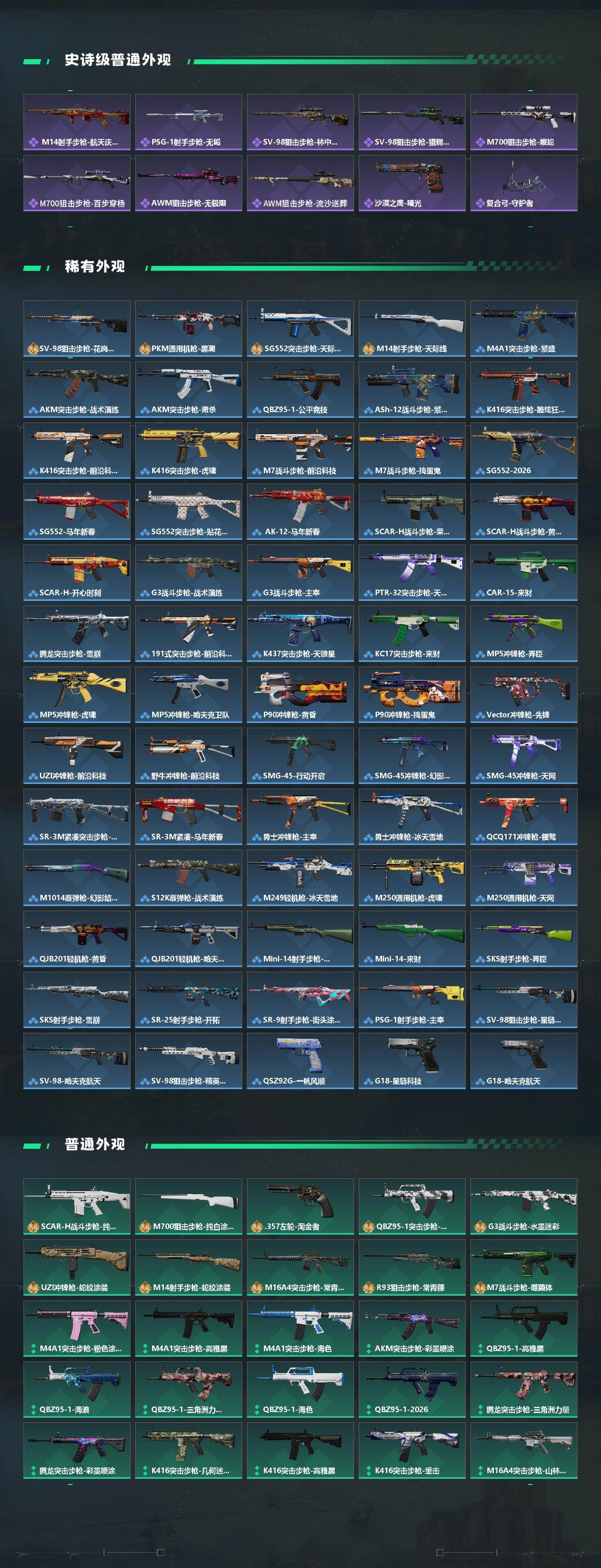 【传说外观】:M4A1突击步枪-蚀金玫瑰,M4A1突击步枪-阿米娅,AKM突击步枪-锦绣,QBZ95-1突击步枪-凌霄戍