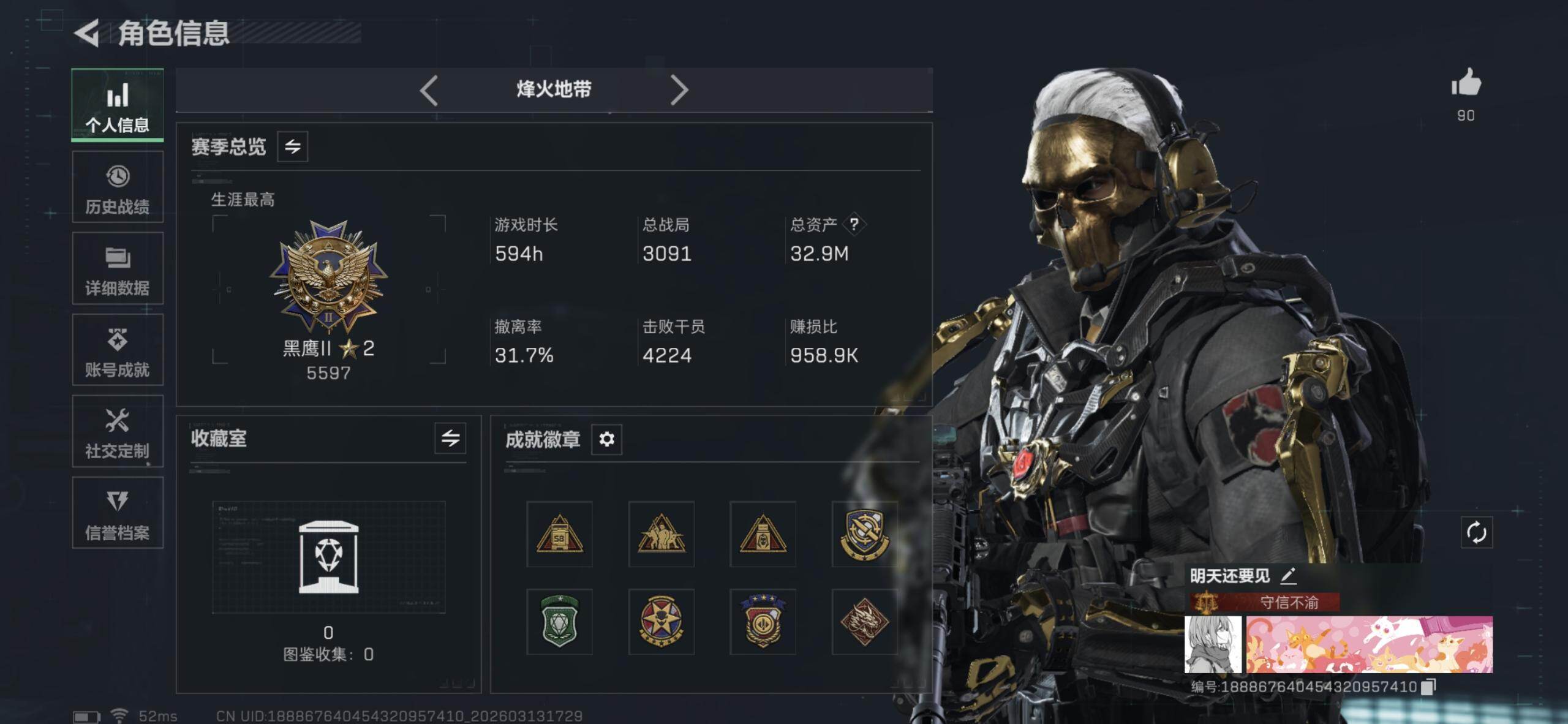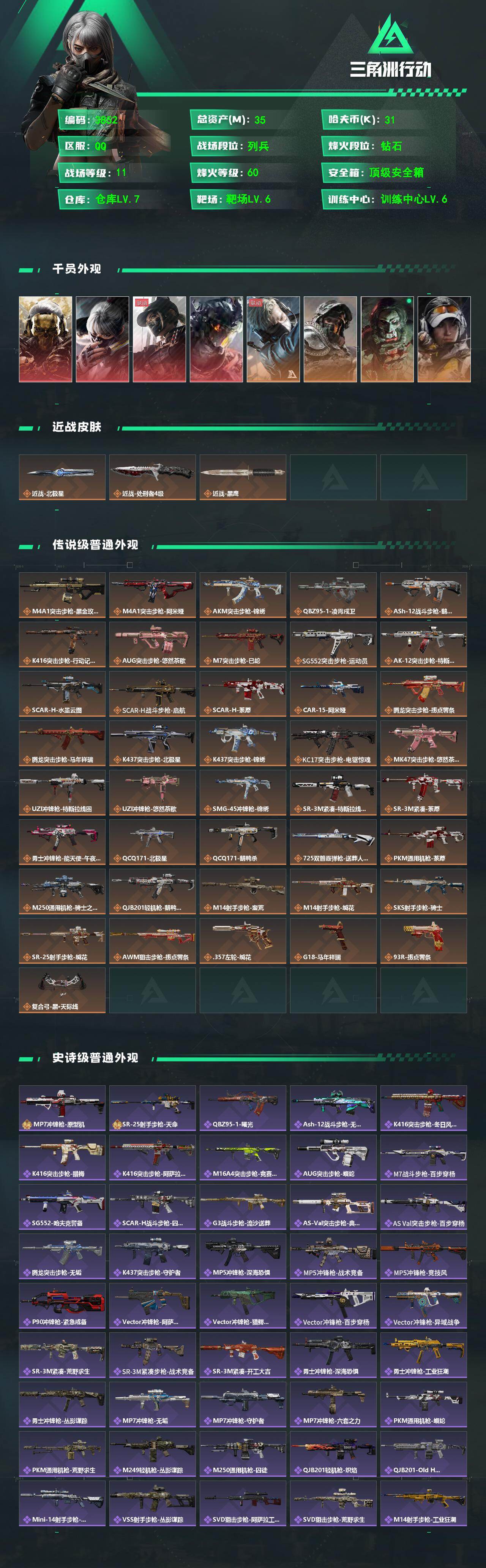 35m总资产-31k哈伏币-60烽火等级-钻石-11战场等级-列兵【干员外观