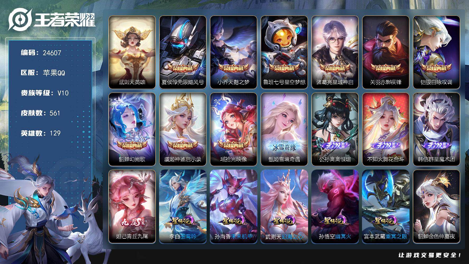 可换绑【连体和平精英3粉2特效枪】【V10精品号·火舞公孙离韩信妲己甄姬5无双·生肖限定30个·10典藏含武则天英雄·嫦娥孙策珍品·财神纳福天幕·纸笺情愫天幕·狐妖小红娘小兵】3817星币 幸运值270 30按键 6星传说,2天幕,1小兵,83戳戳,27王者印记,满级铭文,可二次KK9404,苹果Q-V10-561皮肤-9典藏皮肤-1典藏英雄-5无双-2珍品传说-90传说-181史诗【英雄全皮】:嬴政全皮,阿轲全皮,扁鹊全皮,白起全皮,甄姬全皮,姜子牙全皮,刘邦全皮,孙权全皮,钟馗全皮,苍全皮,