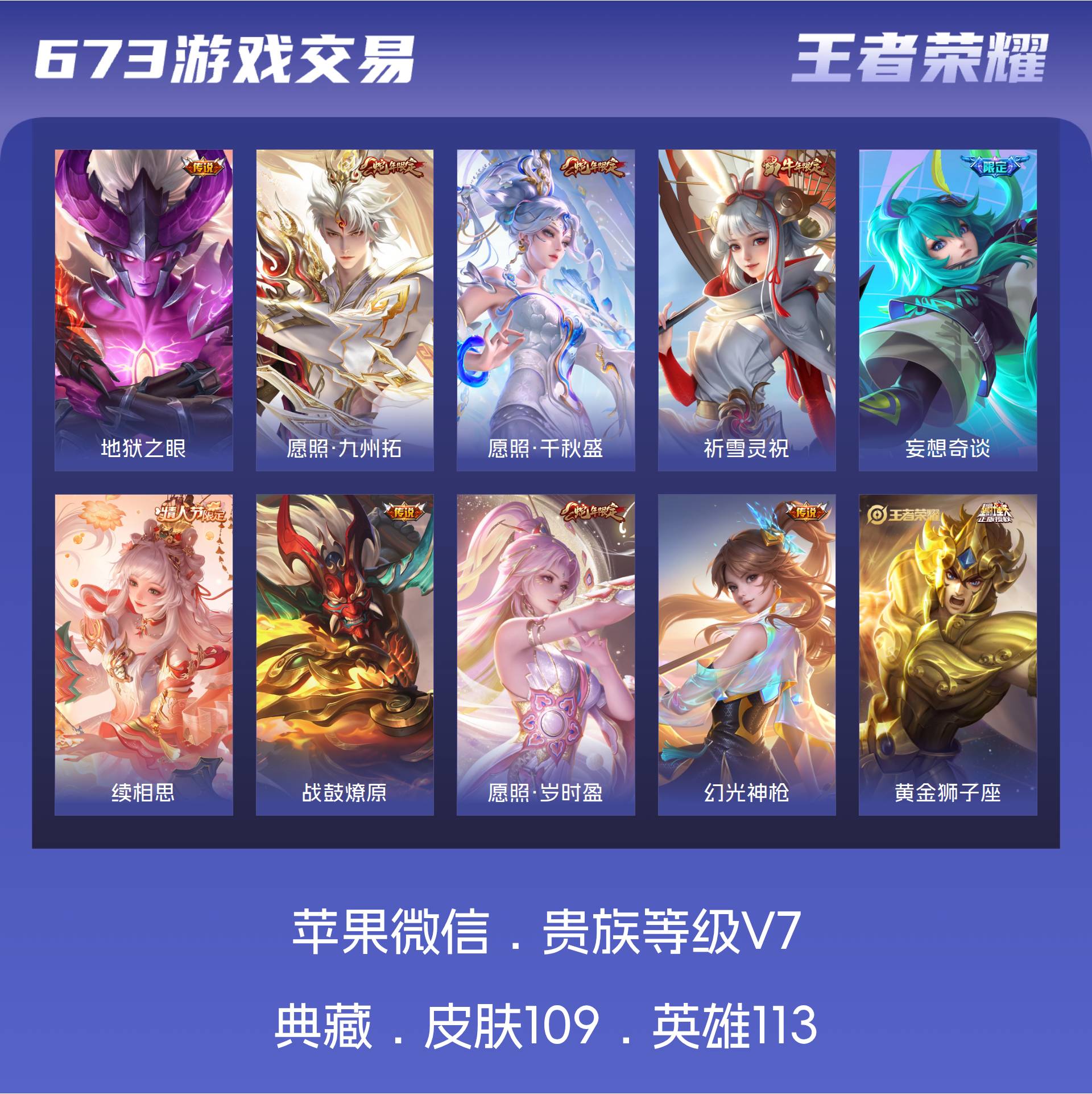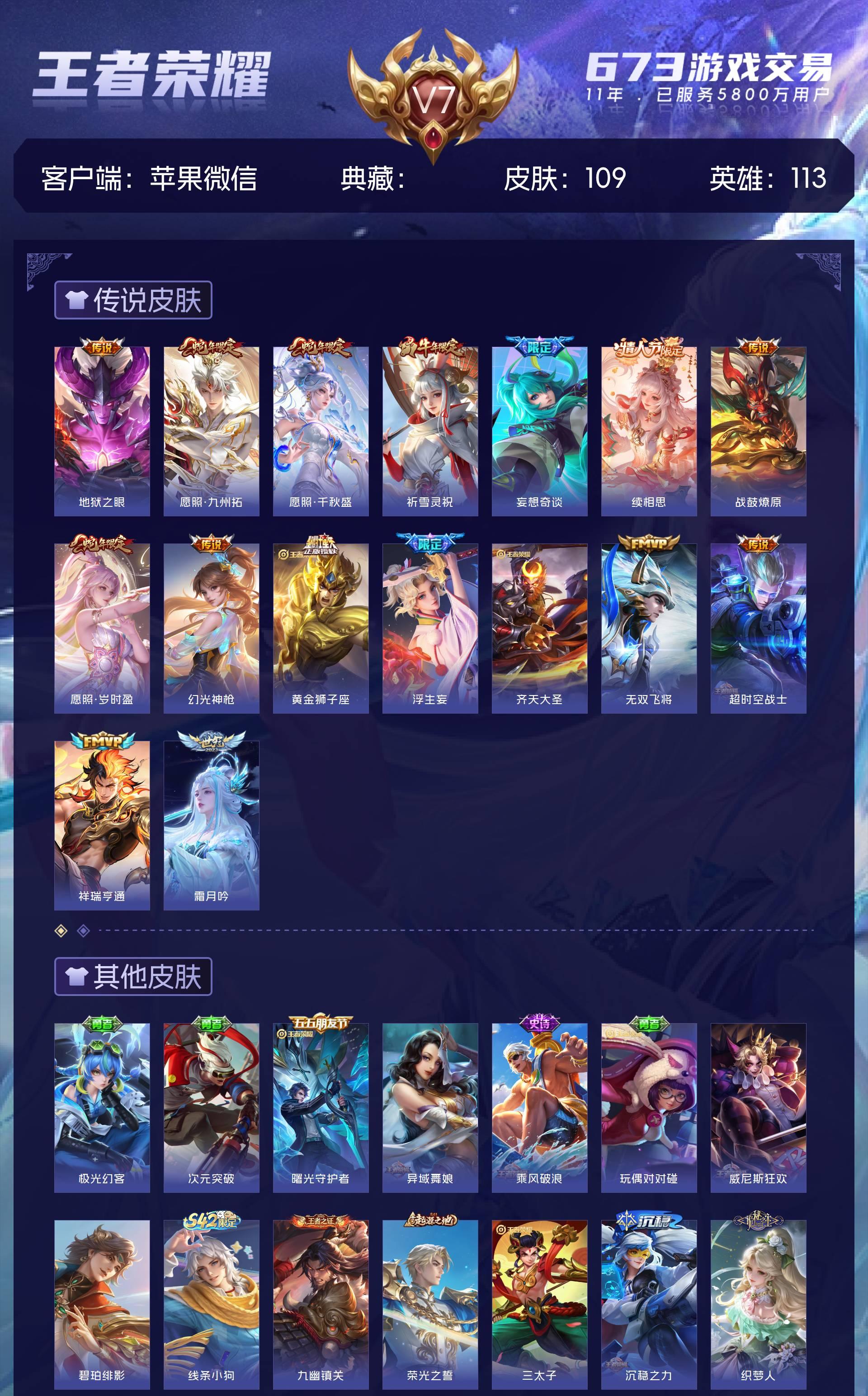 V7 皮肤109 英雄113 非凡王者 星传说1 传说16 其他皮肤100