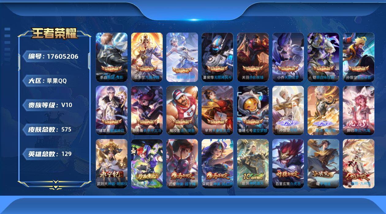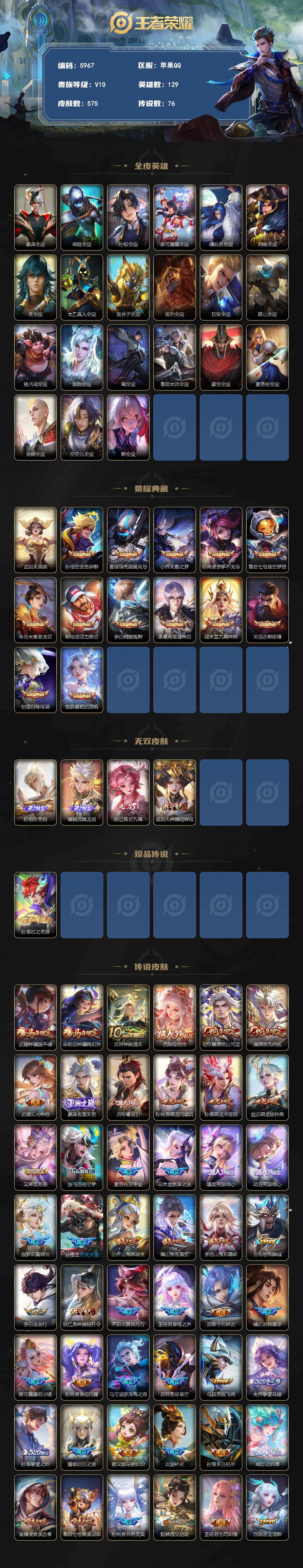 636-[17605206]可二次墨染江湖 幻夜逐光 凤鸣九霄 灿若星河 墨上江山 路在脚下 浪翻一夏 挚爱童话 花朝如约 秋月华灯贵族10-流光积分12944-贵族积分368248-575皮-13典藏-4无双-1珍品传说-76传说-22全皮-改名卡5-星传说黛羽霜翎无限倾慕 时之思念 幻海之心 幽冥之眼 星际治安官 未来机甲 金色仲夏夜苹果手Q102区575皮13典藏76传说4无双1珍品传说V10 营地ID224785560无双王者【珍品传说皮肤】:时之奇旅【无双皮肤】:无相,器灵·螭龙剑,青