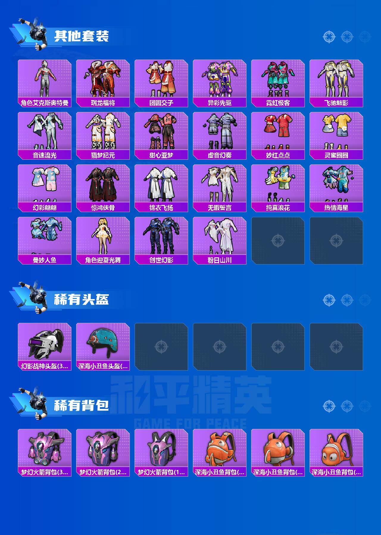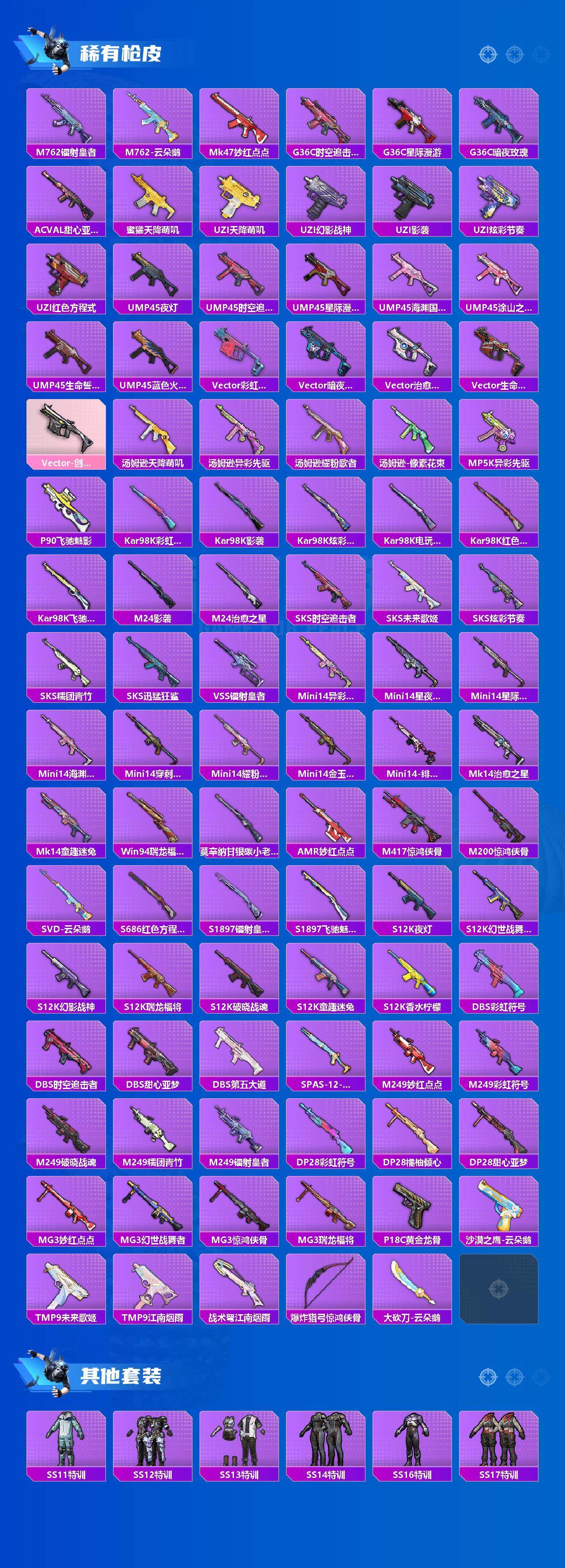 【热门品类】:粉装-梦幻火箭,套装-浪漫天命,套装-都市猎人,套装-小丑鱼,套装-胖达圆圆,套装-龟仙人,套装-暗影哥特,M416-星际漫游