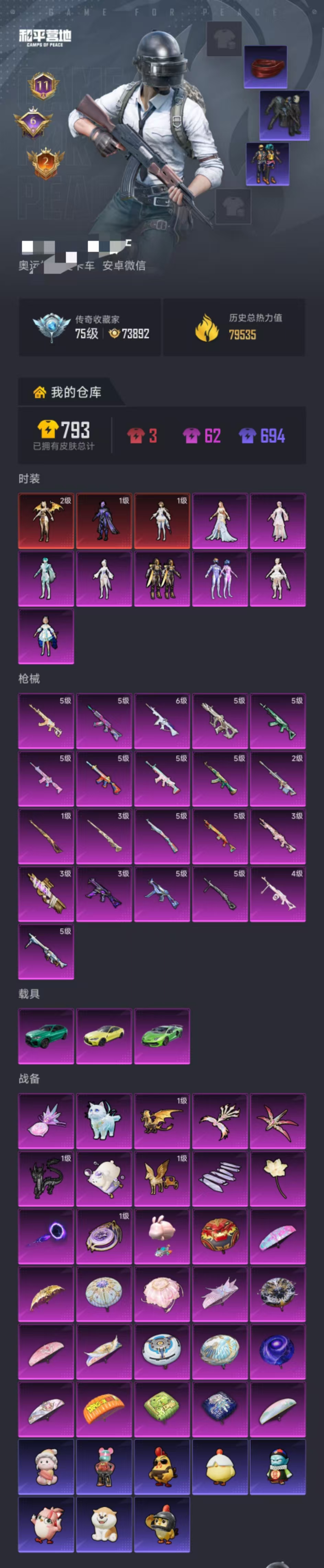 154-【3红装都市梦幻8粉装21特效枪3载具】 安卓V区-79535热力值-129套装-224枪皮 【3红装】 宇宙意志-塞卢姆(1级) 圣域龙灵-瑞拉(2级) 镜域双华-欧若拉(1级)【4载具】 兰博SVJ绿色 僚机-萌兔起飞 宝马X6 M(曼岛绿) 宝马M4(圣保罗黄)【3稀有】 8号机 Mark.06 都市猎人【8粉装】 梦幻火箭 洛天依 创世·救赎 角色-烟云彩露 角色-玄冥寒域 角色-智耀战神 角色-千金淑猫 角色-女娲灵识【21特效枪】 SCAR-L-锦绣绵绵(5级) M416-全