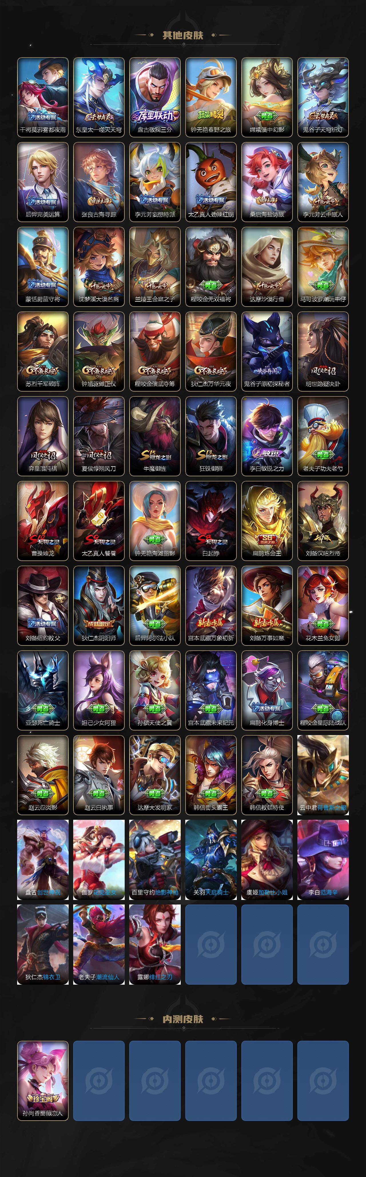 【限定皮肤】:白起狰,狄仁杰阴阳师,孙尚香蔷薇恋人,扁鹊炼金王,夏侯惇朔风刀,甄姬游园惊梦,曹操烛龙,狄仁杰万华元夜,达摩沙漠行僧,程咬金演武夺筹,兰陵王金庭之子,牛魔御旌,李元芳云中旅人,