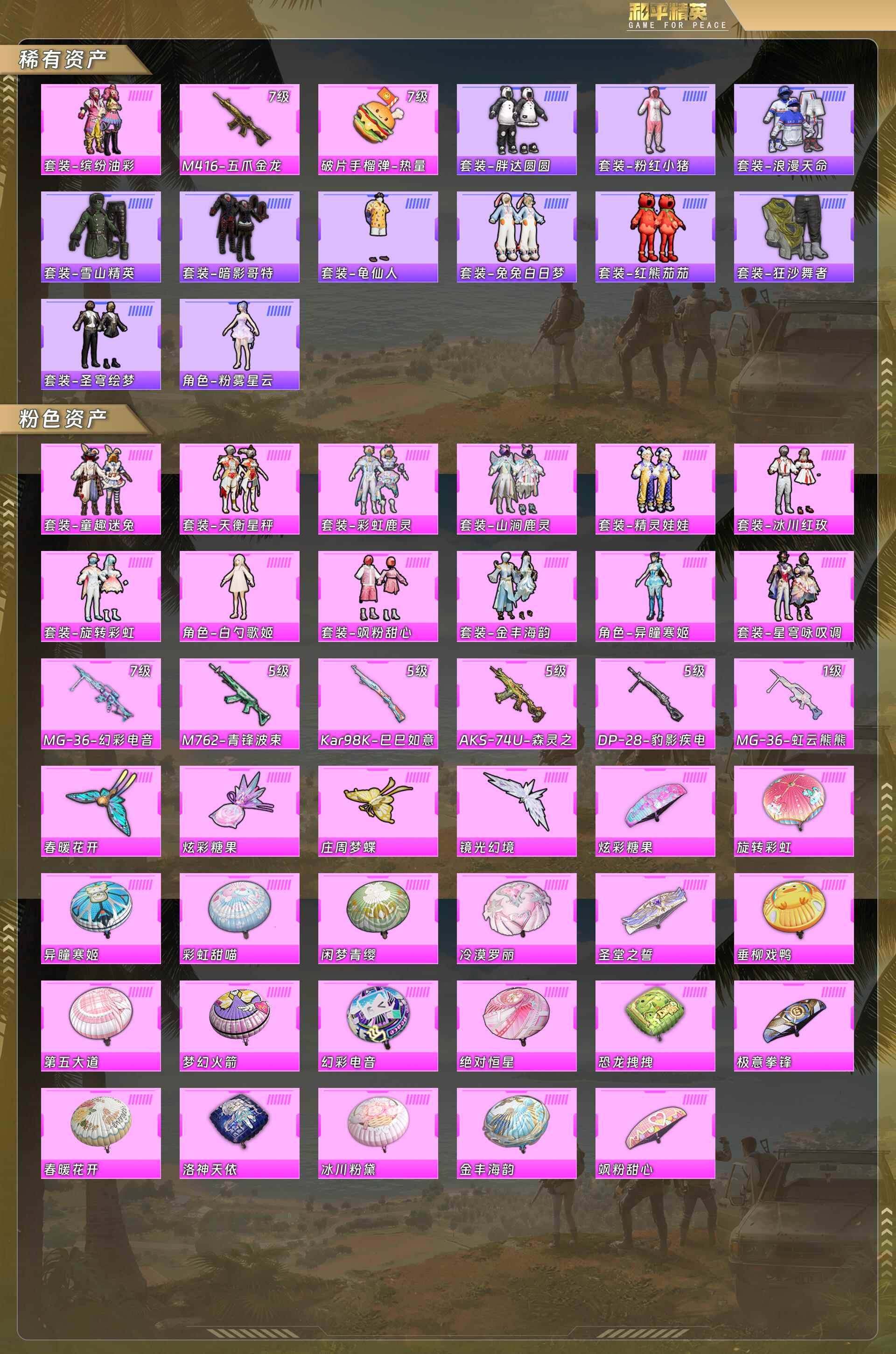身法号-地铁满天赋-缤纷油彩/M4五爪金龙7级/手雷热量炸弹7级/胖达圆圆/粉红小猪/浪漫天命/老六服/红眼罩/兔兔白日梦/红熊茄茄/狂沙舞者/圣穹绘梦/粉雾星云/童趣迷兔/天衡星秤/彩虹鹿灵/山涧鹿灵/精灵娃娃/冰川红玫/旋转彩虹/白勺歌姬/飒粉甜心/金丰海韵/异瞳寒姬/星穹咏叹调/MG36幻彩电音7级/M762青锋波束5级 (13粉装8粉枪)没战神框 HP6385-0载具-4粉色飞行器-83