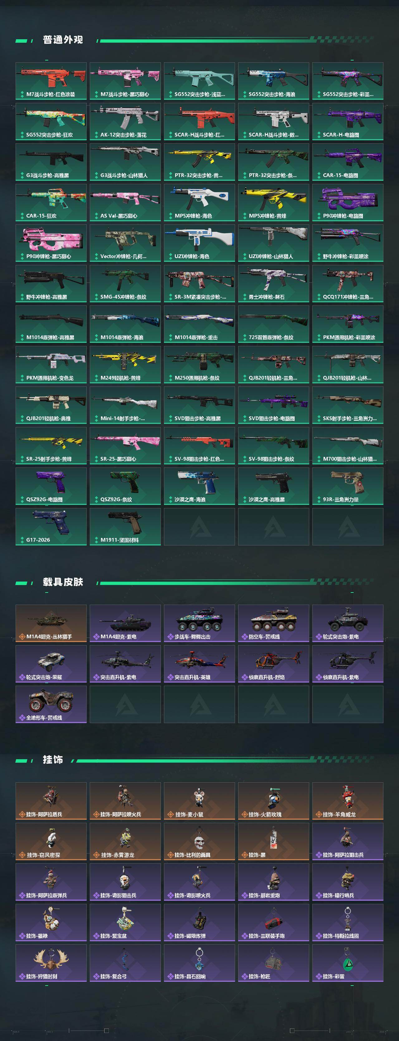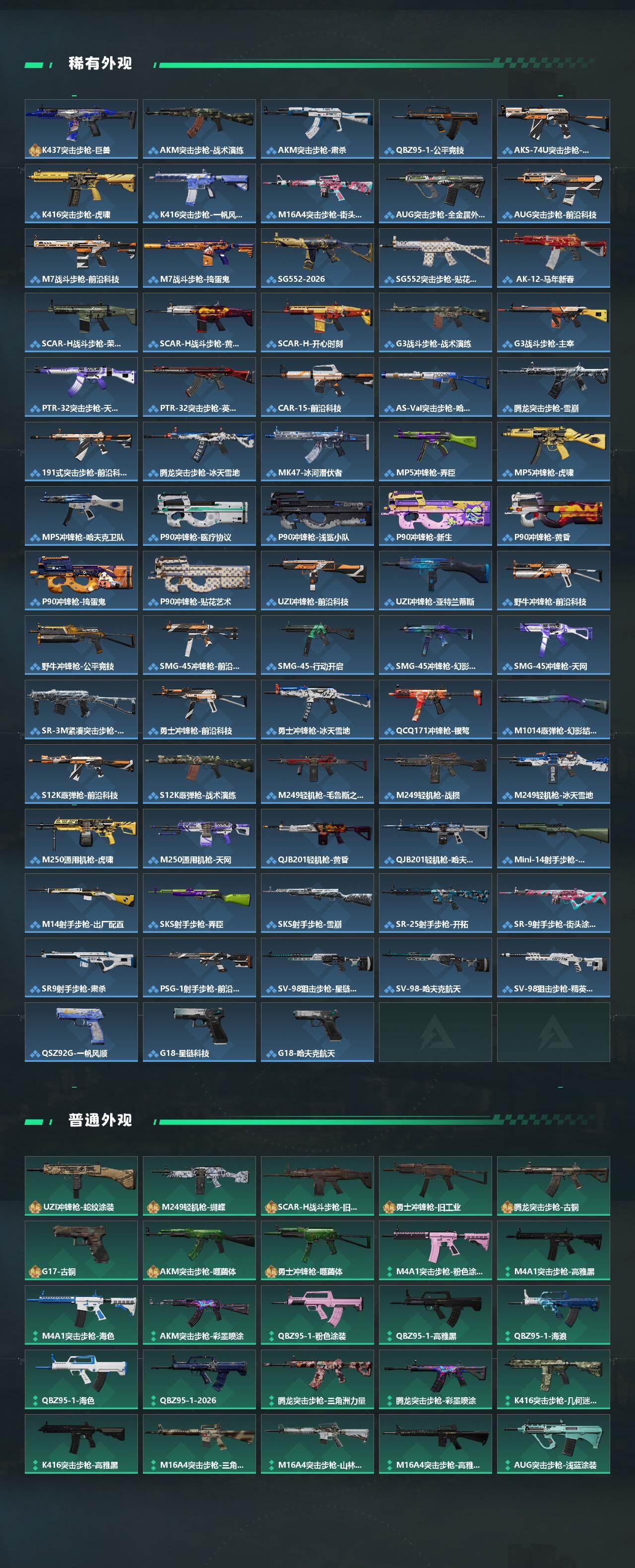 【传说外观】:M4A1突击步枪-阿米娅,ASh-12战斗步枪-鹅鸭杀,M16A4突击步枪-狩猎时刻,SG552突击步枪-点翠,AK-12突击步枪-特斯拉线圈,SCAR-H