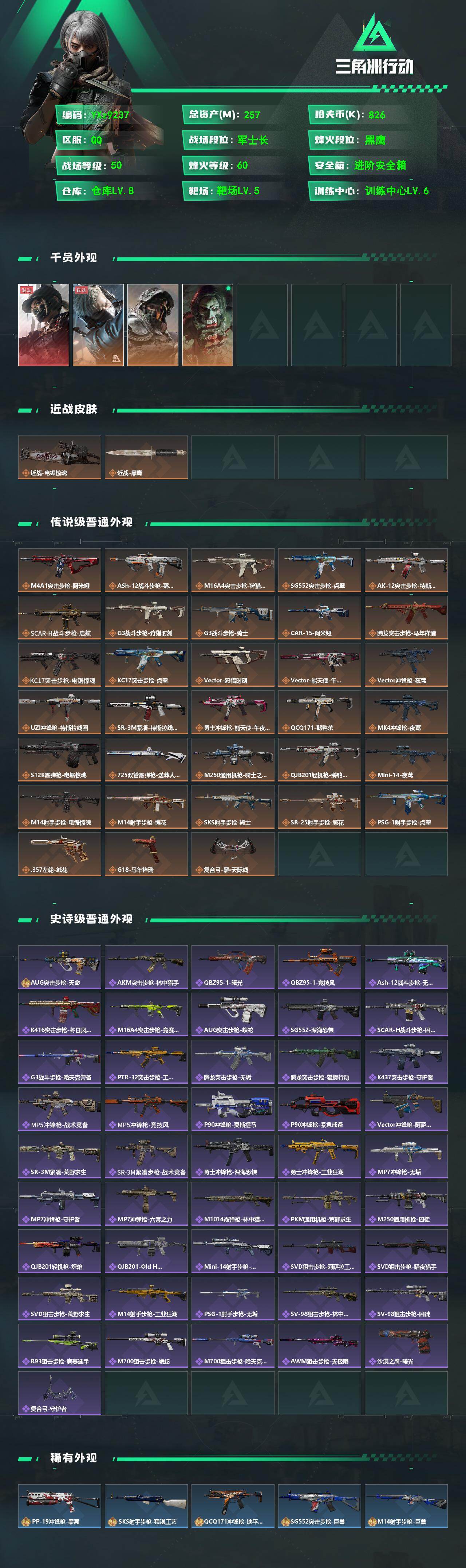 【热门单联动红皮黑天际线-高额资产257M-单刀电锯惊魂】【Q区三端互通】【【无二协助处理】】YXz9237-特勤处:仓库8级/靶场5级/训练中心6级-总资产257m-哈夫币82w-烽火等级:60级