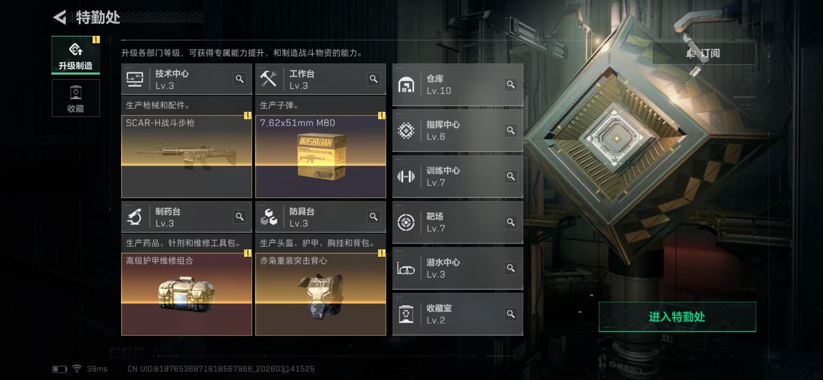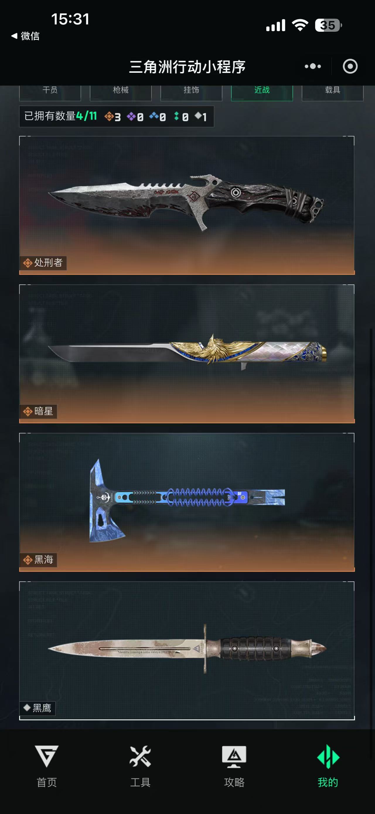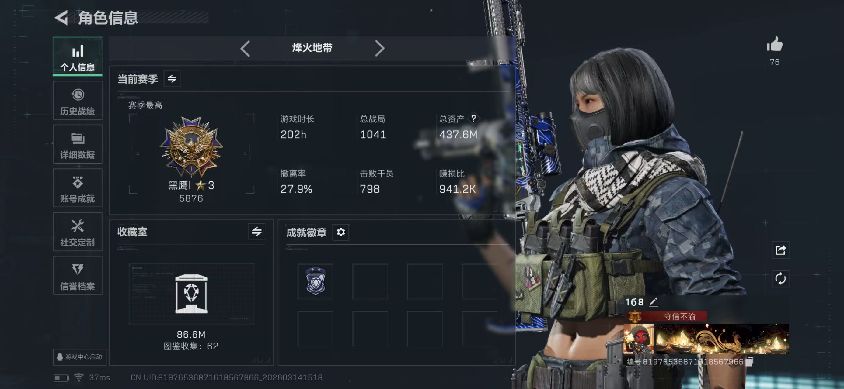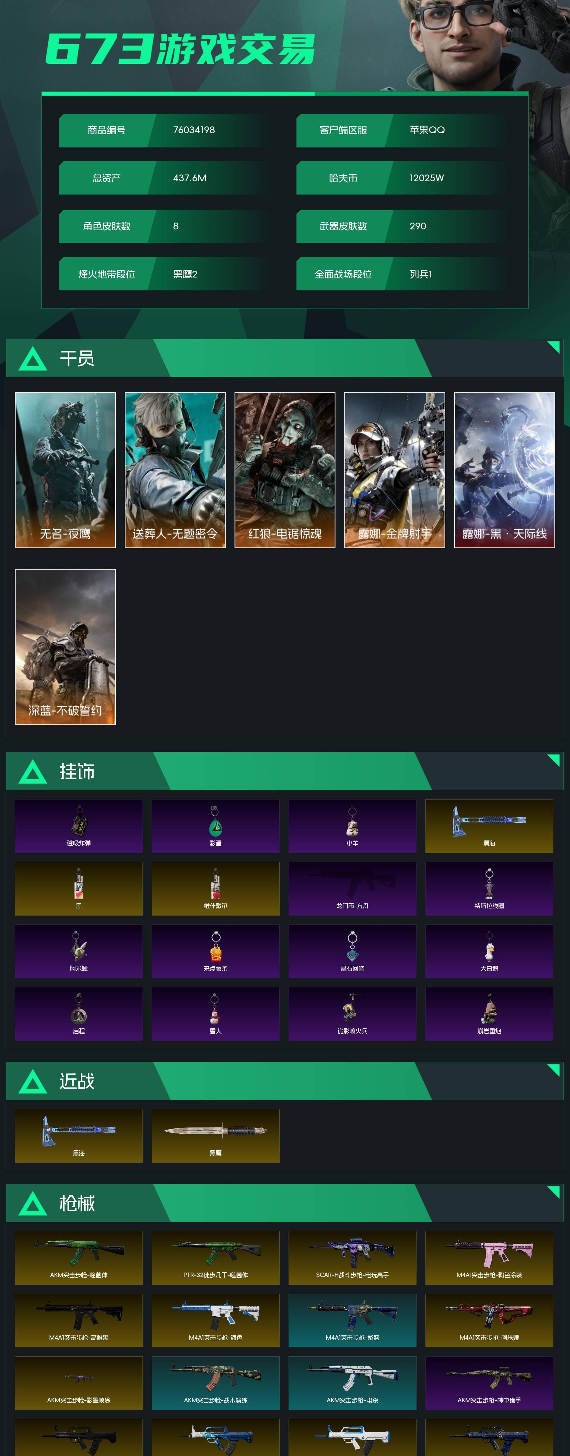 烽火段位黑鹰2 战场段位列兵1 总资产437.6M 哈夫币12025W 干员8 挂饰27 近战4 枪