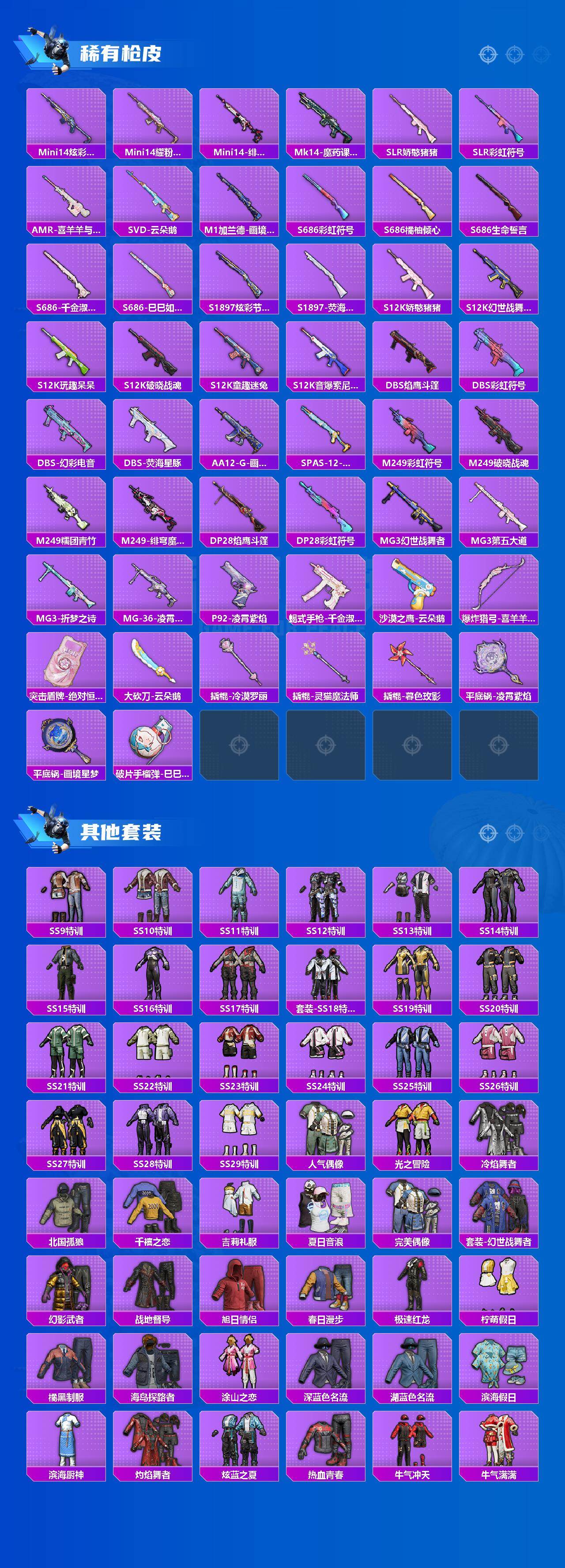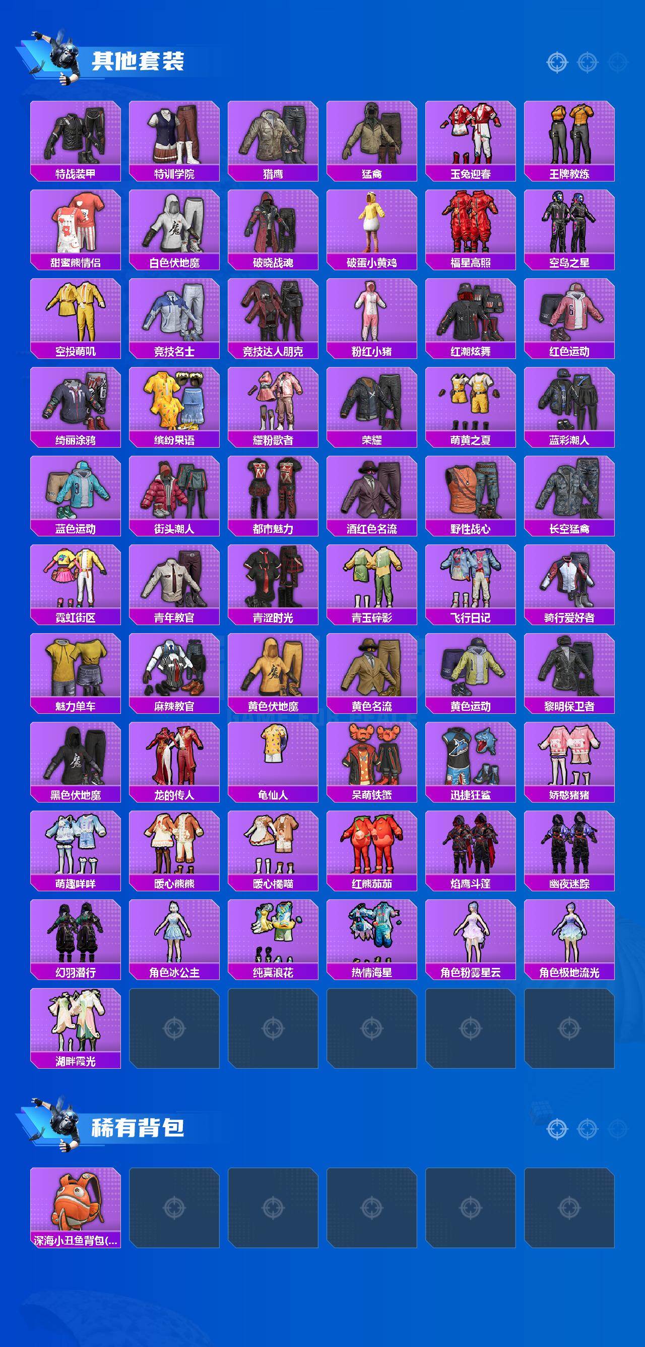 【粉色套装】:粉装-冰霜白皇,粉装-炙焰红王,角色-千金淑猫,粉装-雪月幻音,粉装-星穹咏叹调,角色-荧海星豚,角色-奇迹舞步 贝贝,角色-奇迹舞步 美琪,角色-羊梦糖心