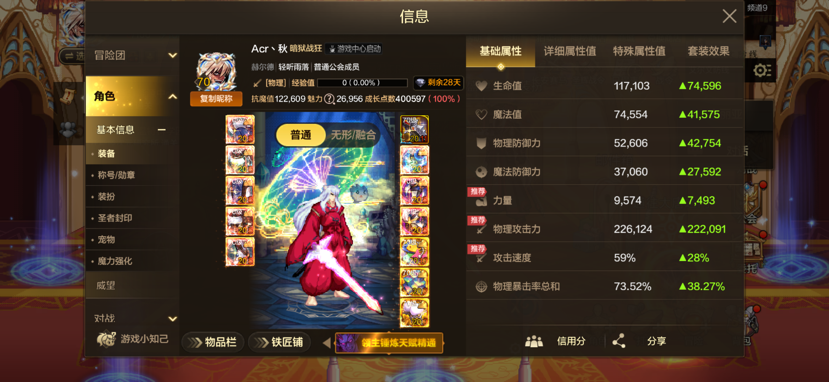 主c满尊增幅11全身9,属强8877,其余9角色天空!三副c累充5万!三角色11.5抗魔旧满尊,大号世界一万亿可单拖安图恩!