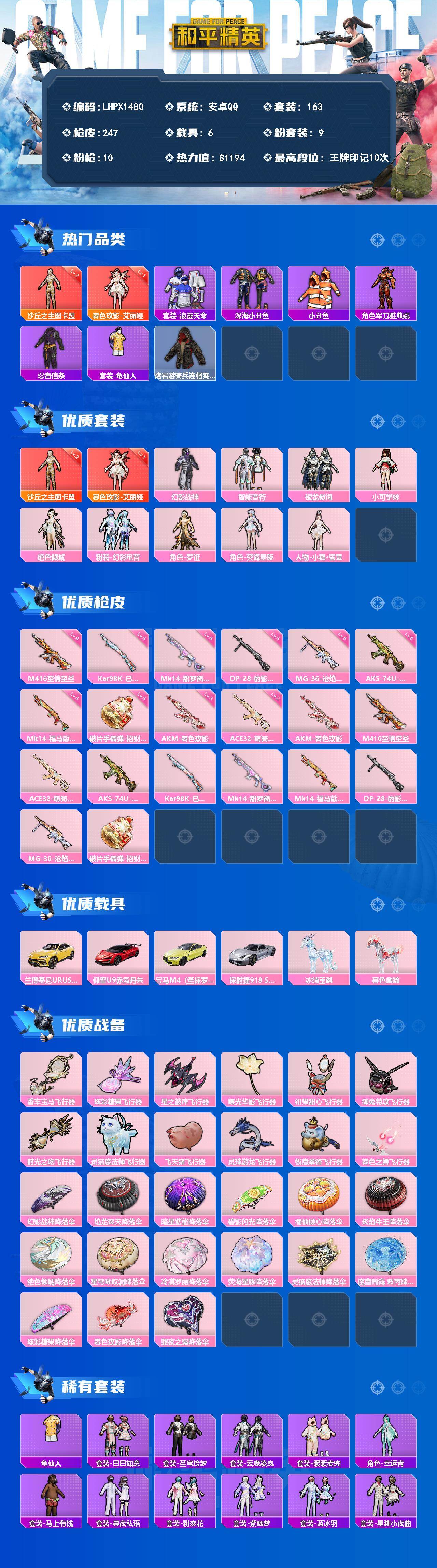 【特价出售/店主推荐】安卓 手Q-2神装-9粉装-10特效枪-6载具-14粉色飞行器-81194热力值-10王牌印记-163套装-247枪皮【红色神装等级】:暮色玫影-艾丽娅(一级),沙丘之主-图卡盟(二级)【热门品类】:套装-浪漫天命,套装-深海小丑鱼,套装-小丑鱼,角色-军刀雅典娜,套装-忍者信条,套装-龟仙人,熔岩游骑兵连帽夹克【粉色套装】:粉装-幻影战神,粉装-智能音符,粉装-银龙傲海,角色-小可学妹,角色-绝色倾城,粉装-幻彩电音,角色-罗征,角色-荧海星豚,人物-小舞·雪昙【粉色枪皮