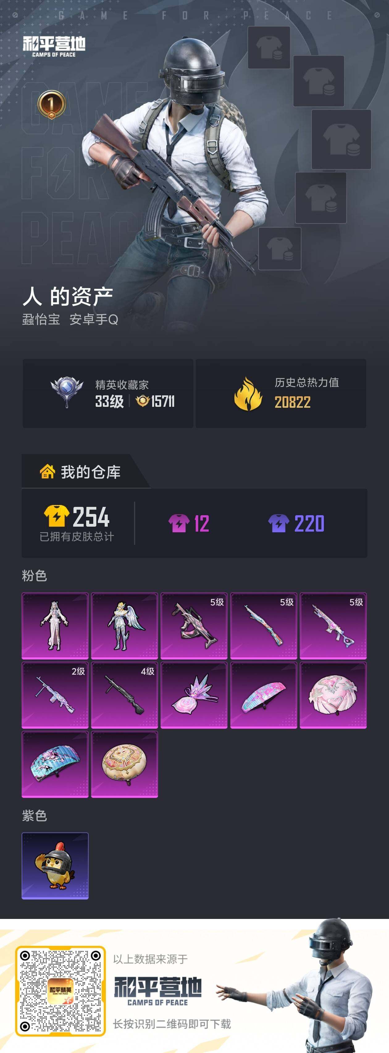 安卓 手Q-2粉装-5特效枪-0载具-1粉色飞行器-20822热力值-1王牌印记-43套装-70枪皮