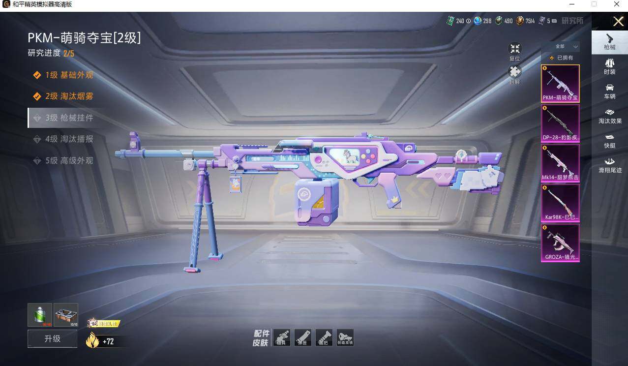 【粉色枪皮等级】:GROZA-镜光银凌(五级),Kar98K-巳巳如意(五级),Mk14-甜梦熊击(五级),DP-28-豹影疾电(四级),PKM-萌骑夺宝(二级)