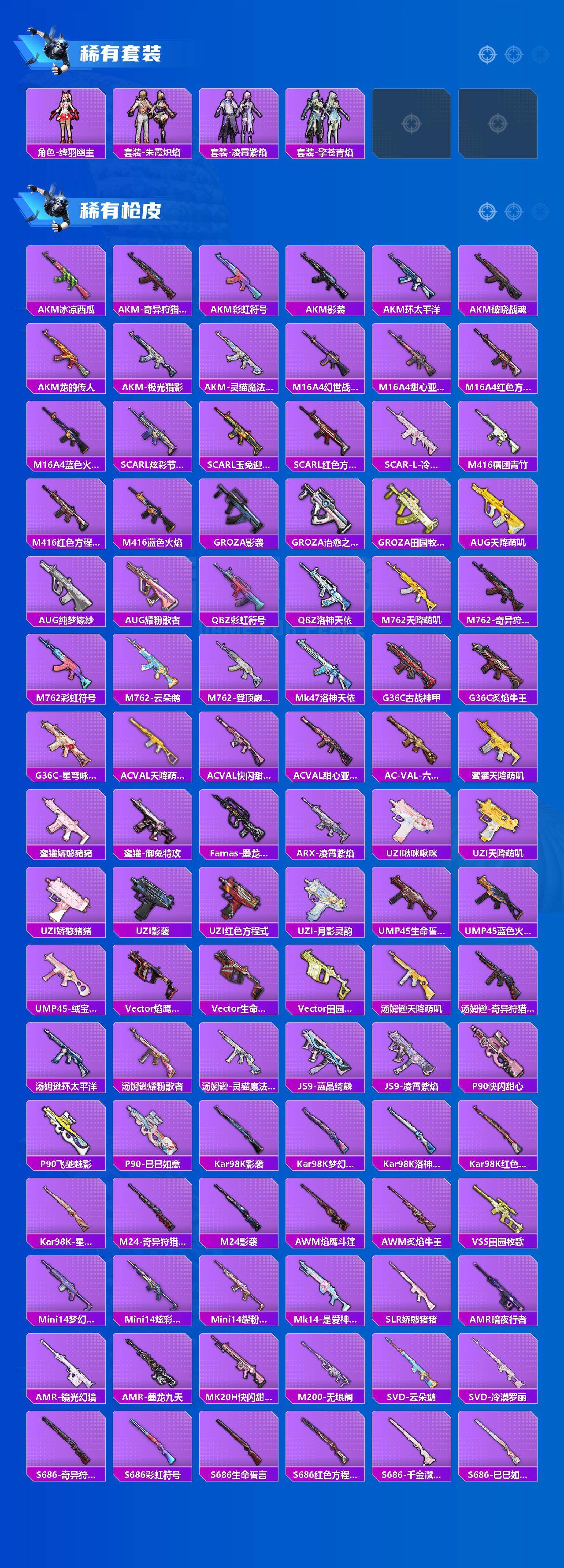 【稀有套装】:套装-巳巳如意,套装-雪国风尚,套装-炫彩糖果,套装-雏菊兔兔,套装-萝兰蝴蝶,套装-小熊娃娃,角色-拉斐尔,套装-糖
