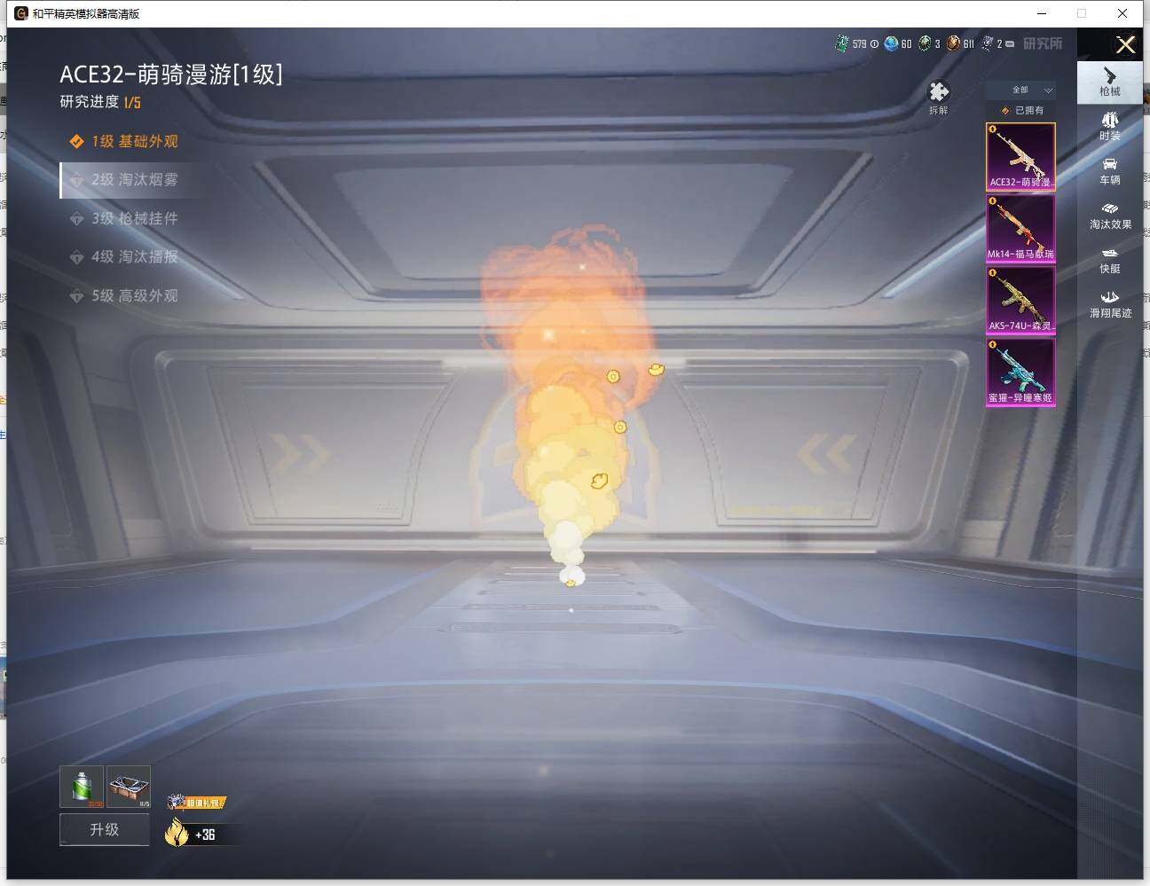 【粉色枪皮等级】:蜜獾-异瞳寒姬(五级),ACE32-萌骑漫游(一级),AKS-74U-森灵之息(五级),Mk14-福马献瑞(四级)