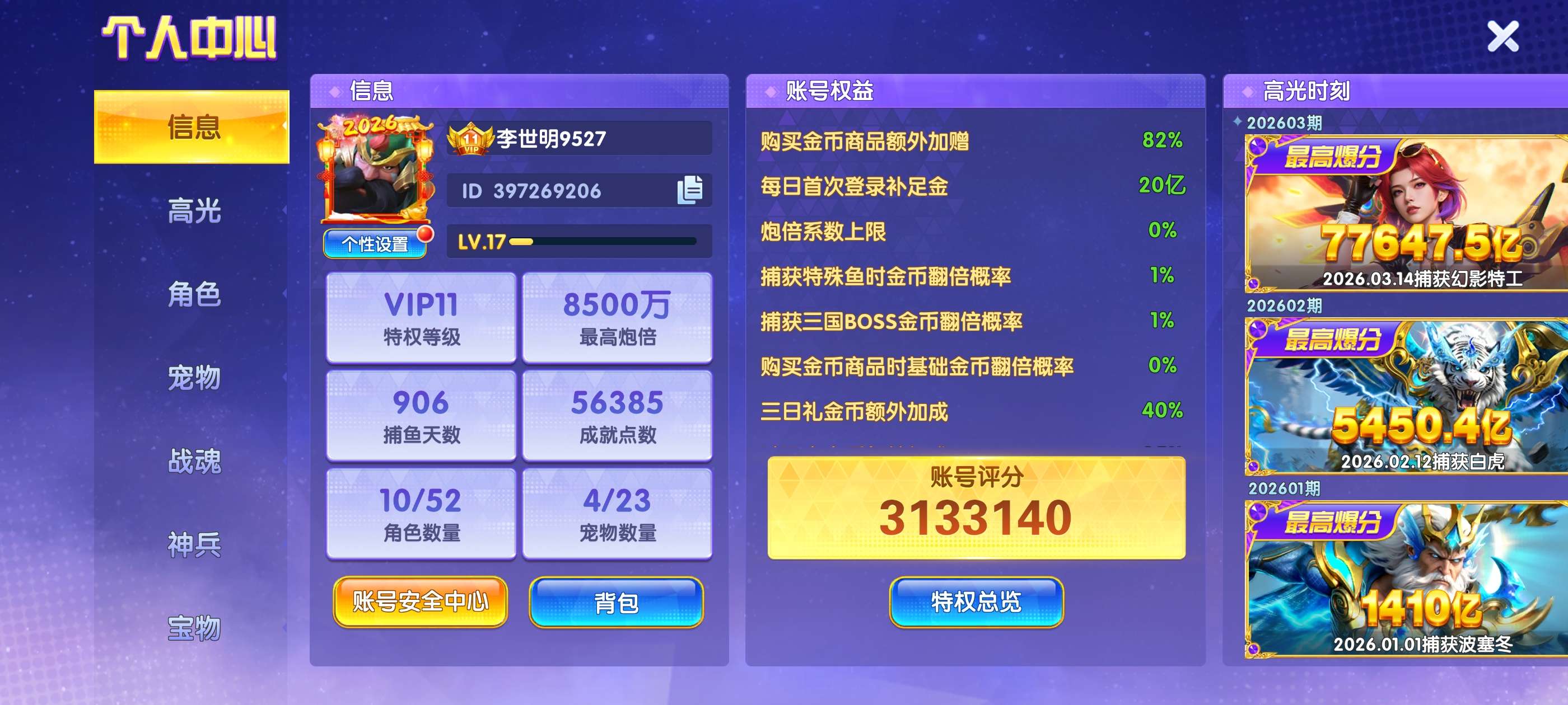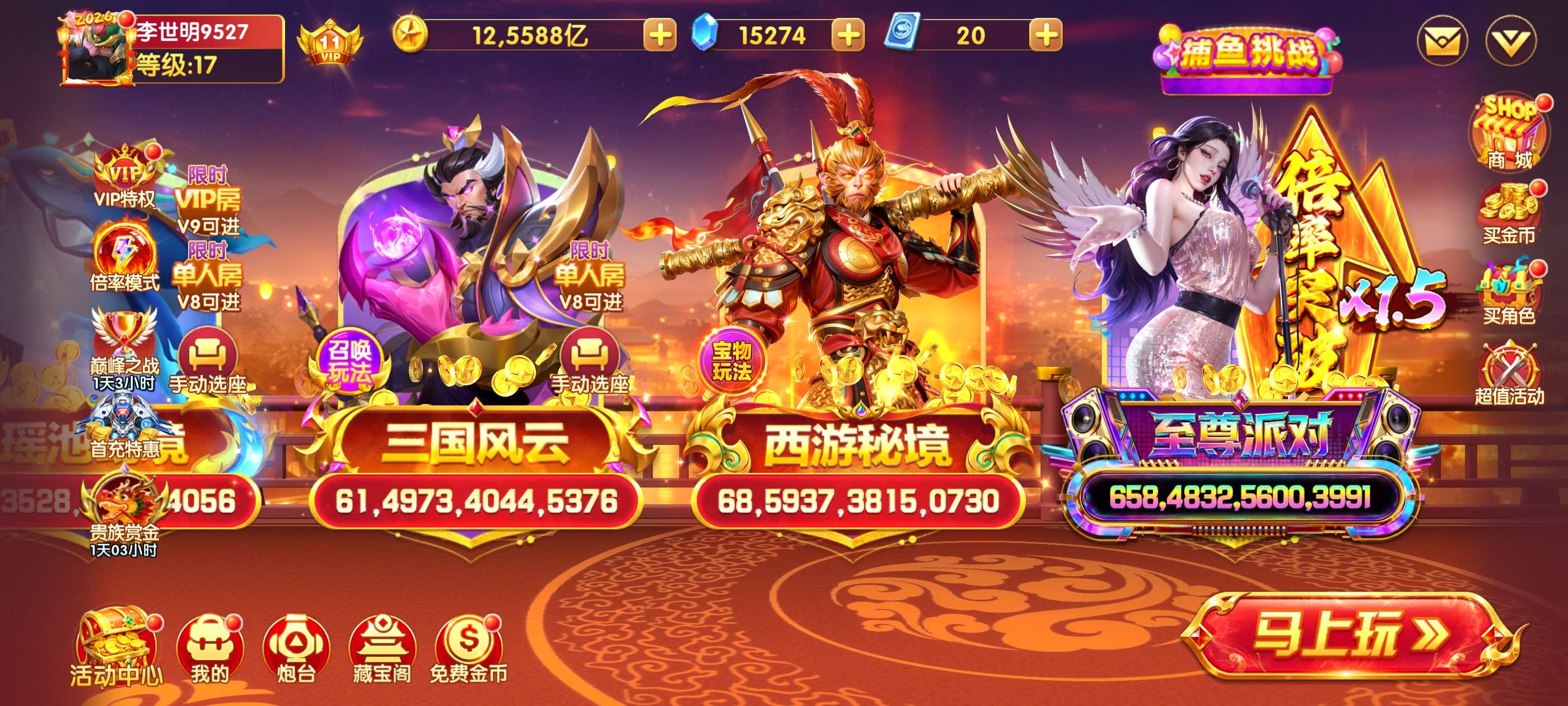 捕鱼大世界vip11,8500万炮,12.5万亿,1.5倍率,带关羽,黄忠,爆发不迷路