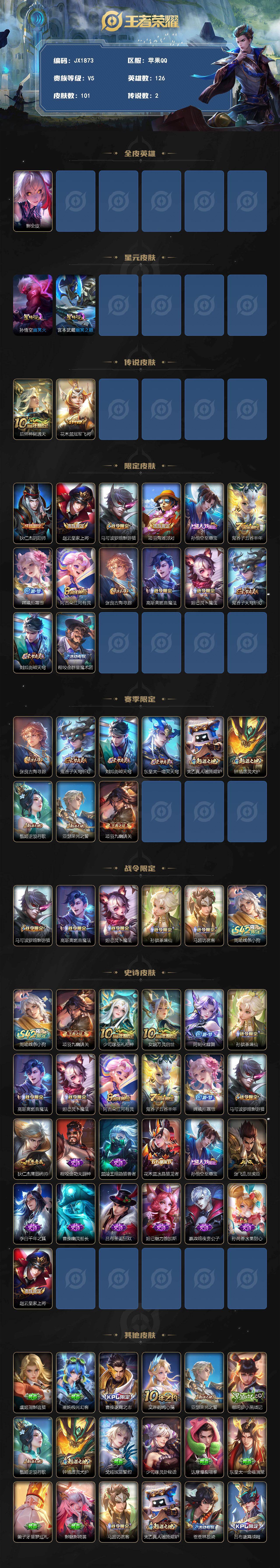 【JX1873】贵族5/皮肤101/传说2/史诗23/英雄126/影全皮/孙悟