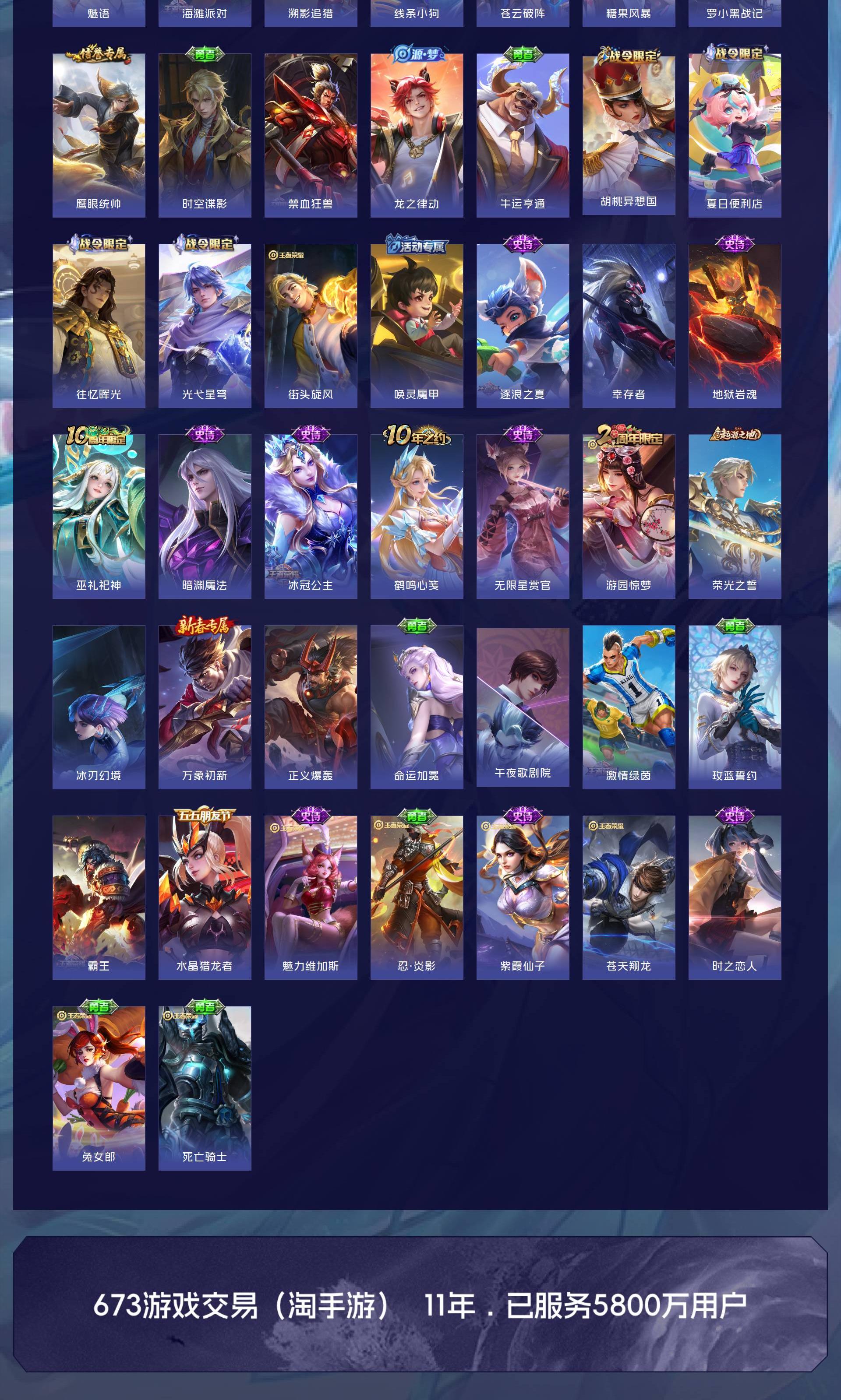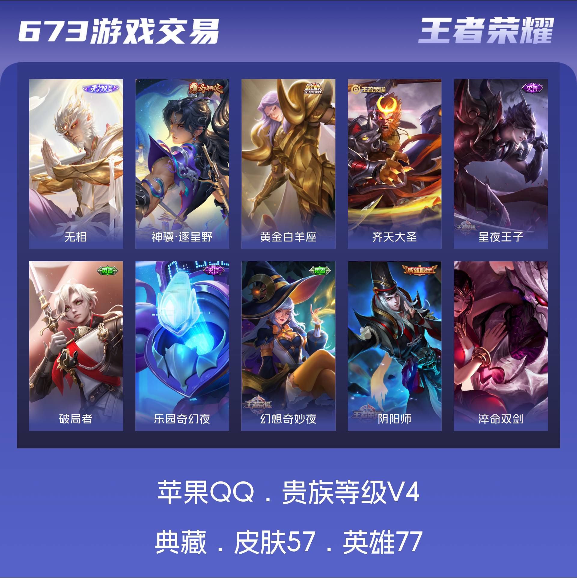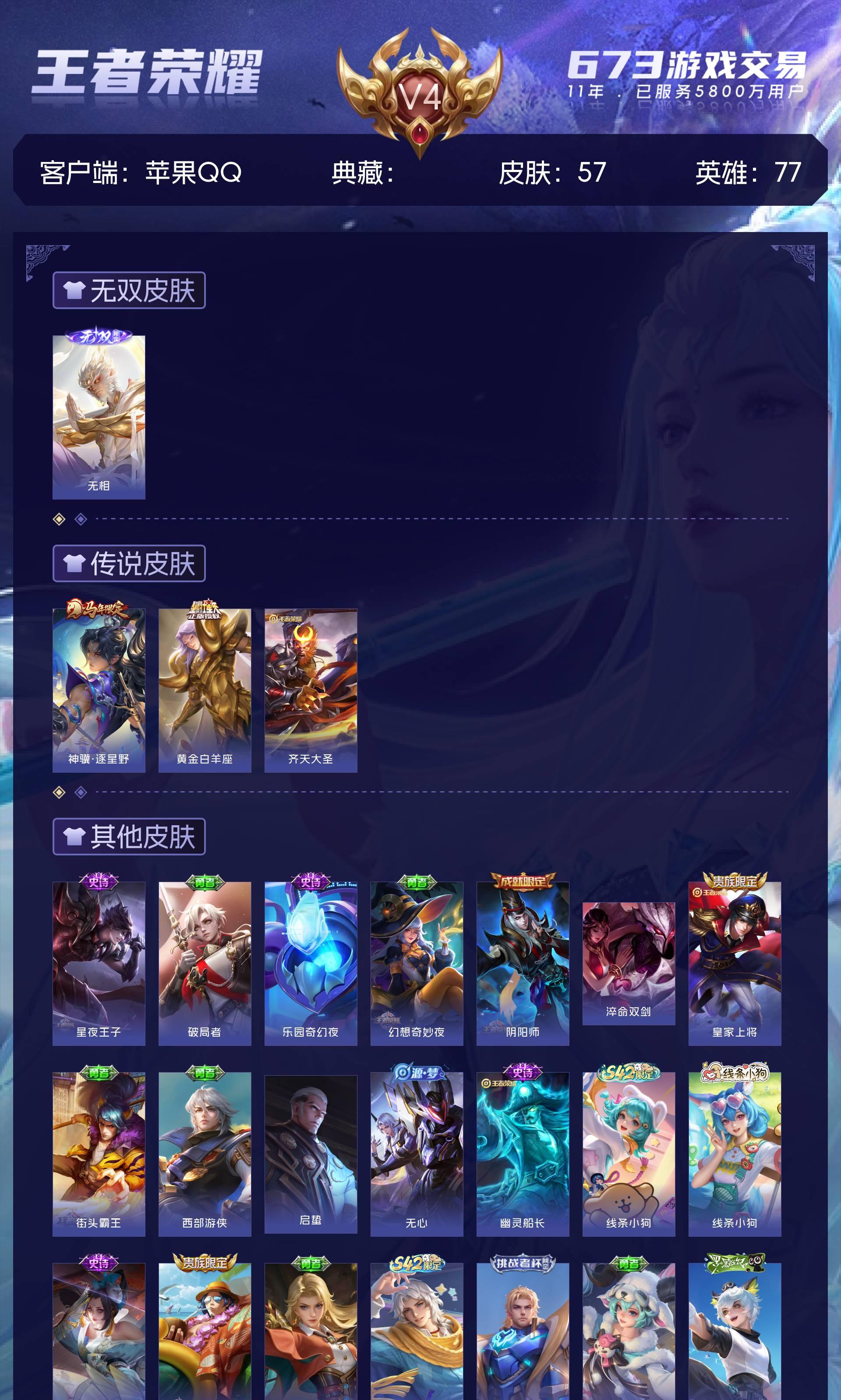 V4 皮肤57 英雄77 荣耀王者 无双皮肤1 传说3 其他皮肤58