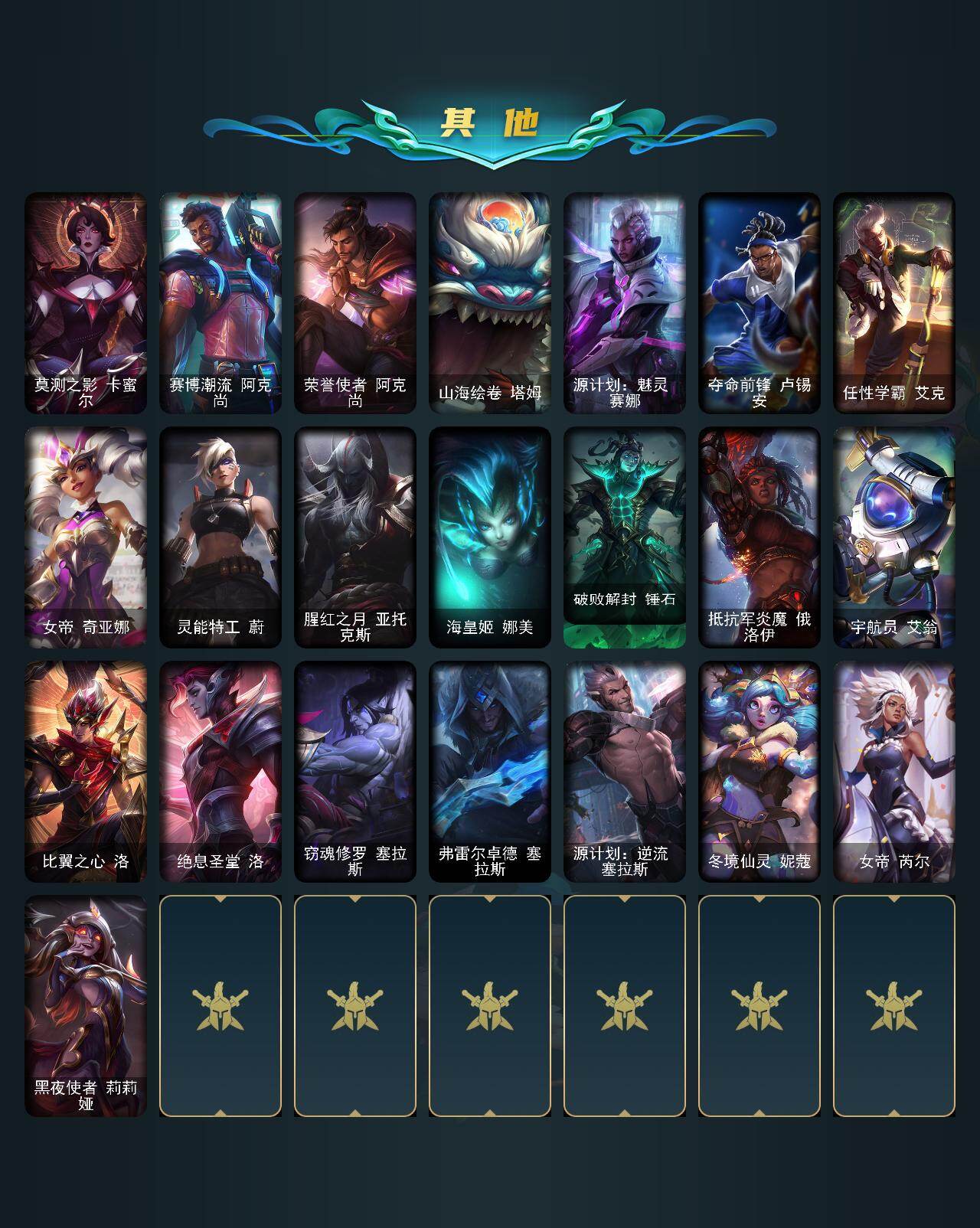 【LOLF2824】172英雄/383皮肤/5神话/46限定/9臻彩/96炫彩/25传说/81史诗/白银/十周年纪念安妮/十五周年纪念希维尔/神凰行者瑞羽圣凰艾尼维亚/至臻魅惑女巫厄运小姐/至臻暗裔英雄嘉文四世/天龙之子卡莎飞龙乘云/无畏骑士瑟庄妮赤子初心/星之守护者卡莎热情之光/星之守护者霞烈羽/玉剑传说苍鸾丁香/可爱可爱粉红红布里茨/魔女阿卡丽虚荣/净雪之月莫甘娜冬虹/水晶玫瑰迦娜甜蜜花蕾/点心宝贝阿木木/龙马烈焰波比/幽梦玫瑰伊莉丝/幸福女神乐芙兰/圣诞开心鬼提莫/圣诞精灵崔丝塔娜/阿木木