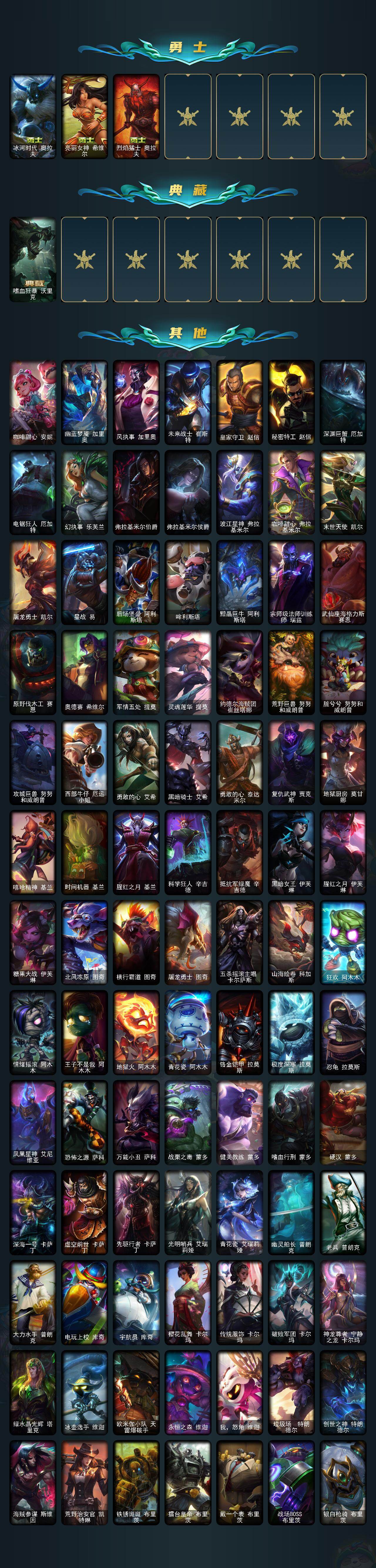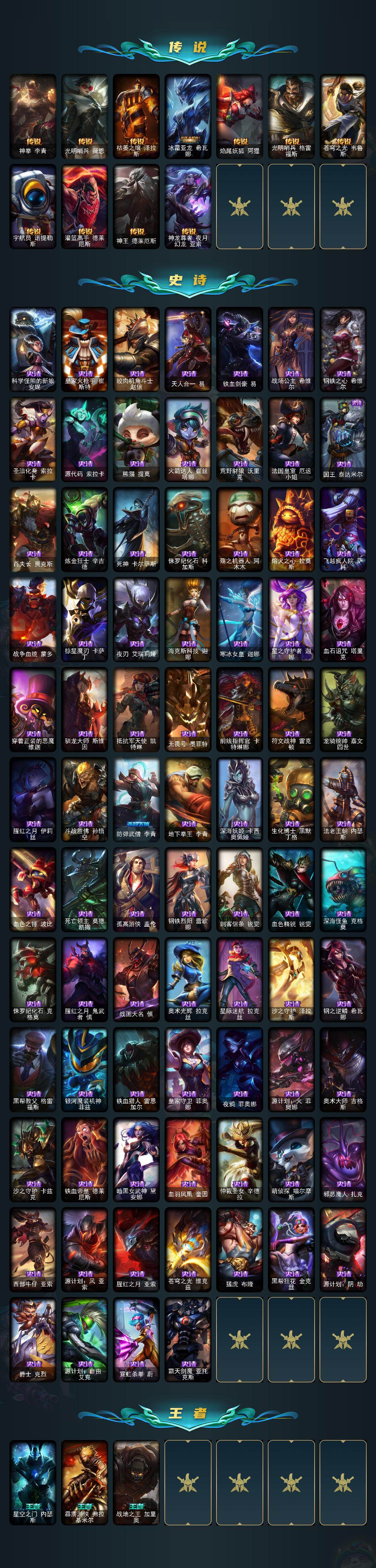 172英雄/383皮肤/5神话/46限定/9臻彩/96炫彩/25传说/81史诗/白银/